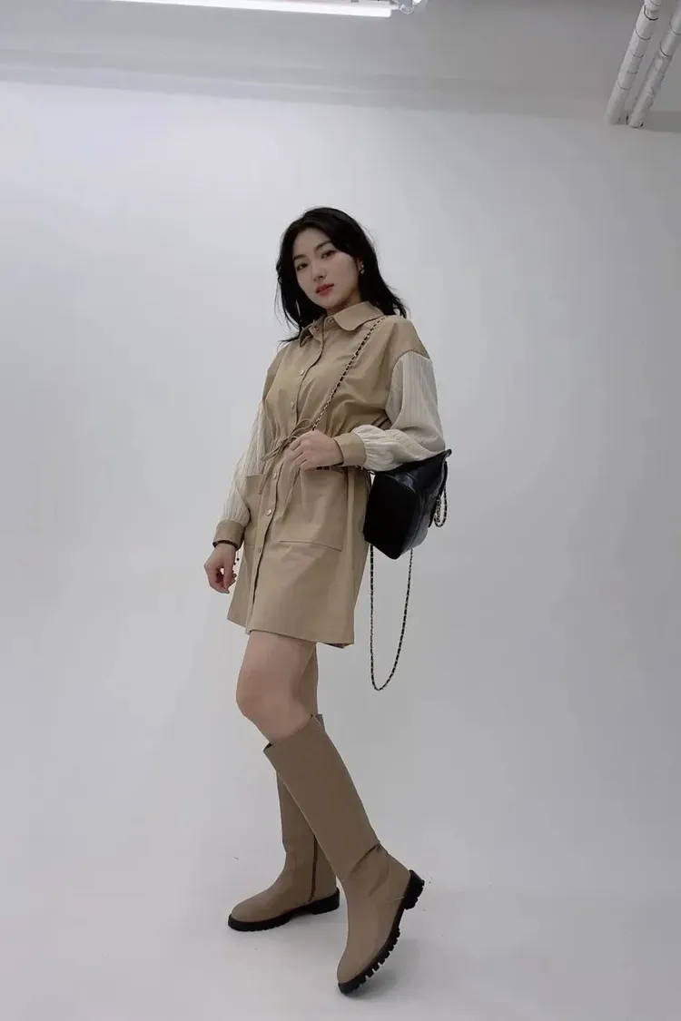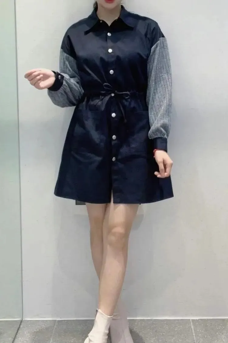 99AN1239襯衫領縮腰拼接連身洋裝外套