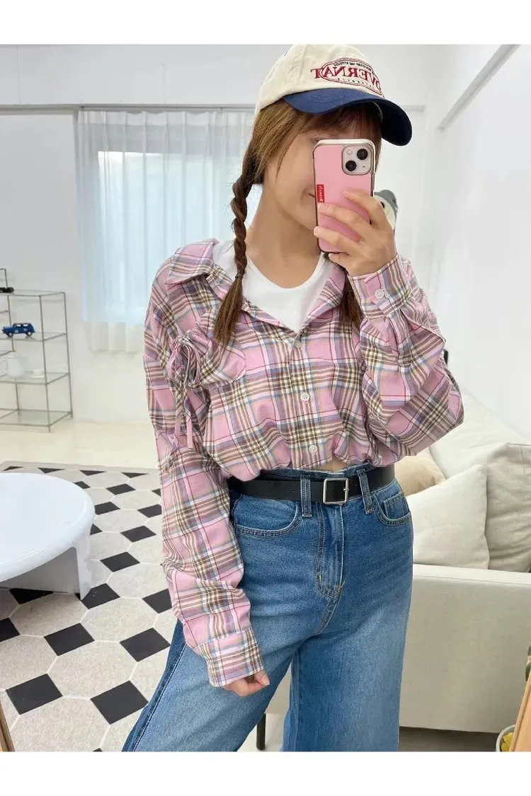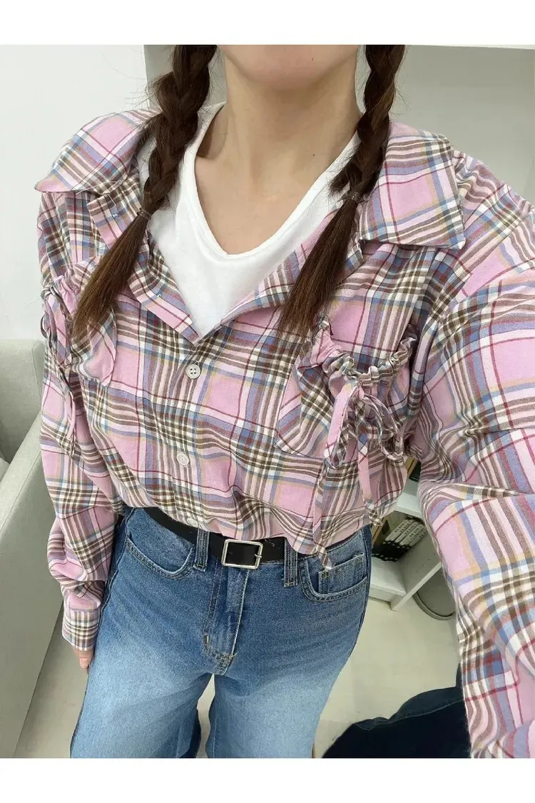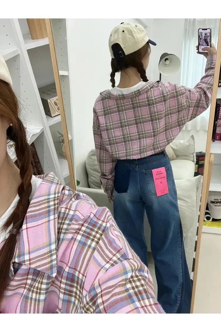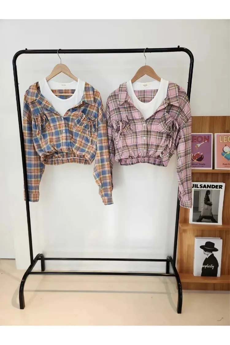 99CM1091薄款層次感格紋假兩件上衣 藍 粉 原價$1080 售價$972