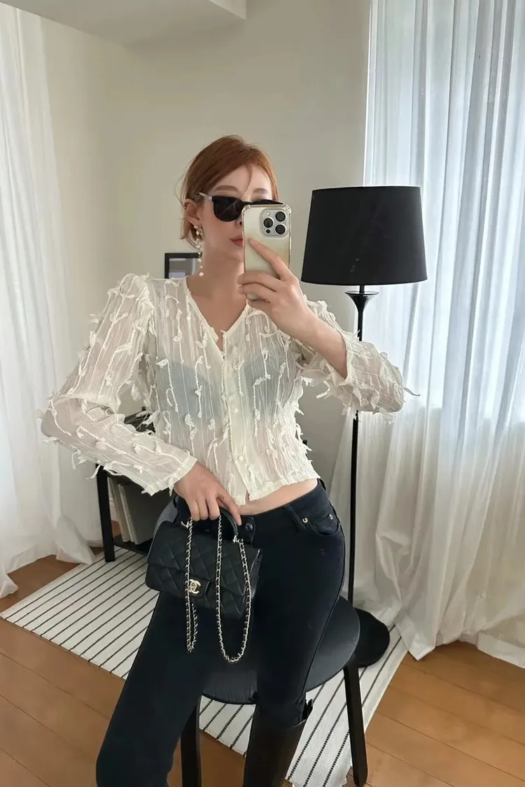 99CS091羽毛飄飄設計感透光短版上衣