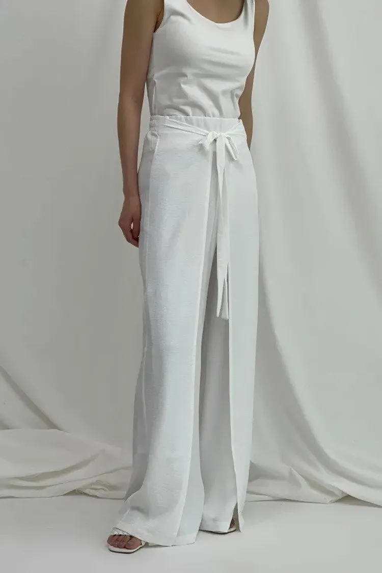99DJ642套裝中的飄逸綁帶設計感長褲 白1 輕盈寬鬆 親膚舒適 雙層綁帶飄逸感 適合夏天材質:聚酯纖維腰寬33-47 臀寬55 褲檔37 大腿34 全長111