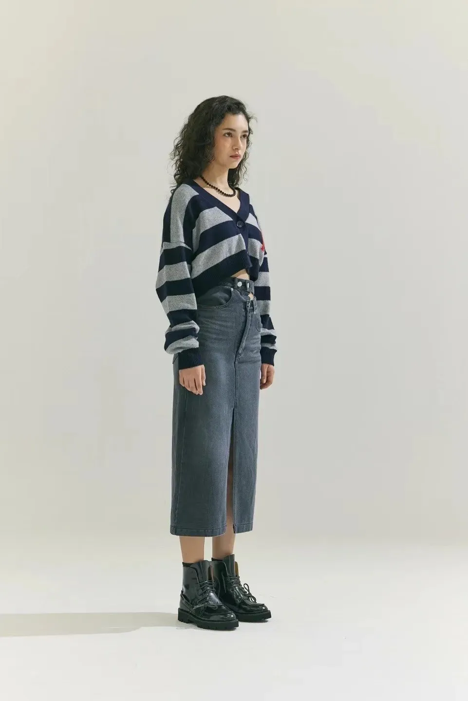99KC957英文R雙釦短版造型針織外套(條紋分色)