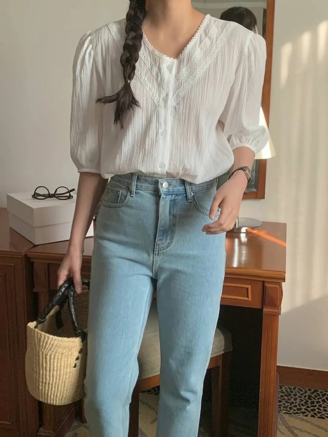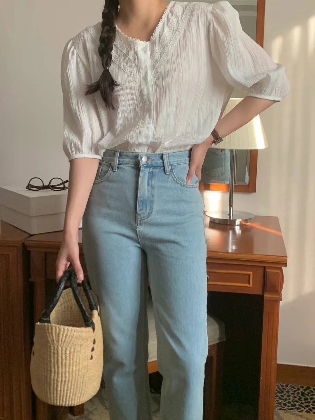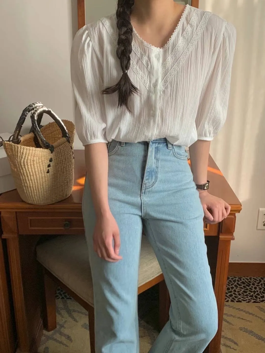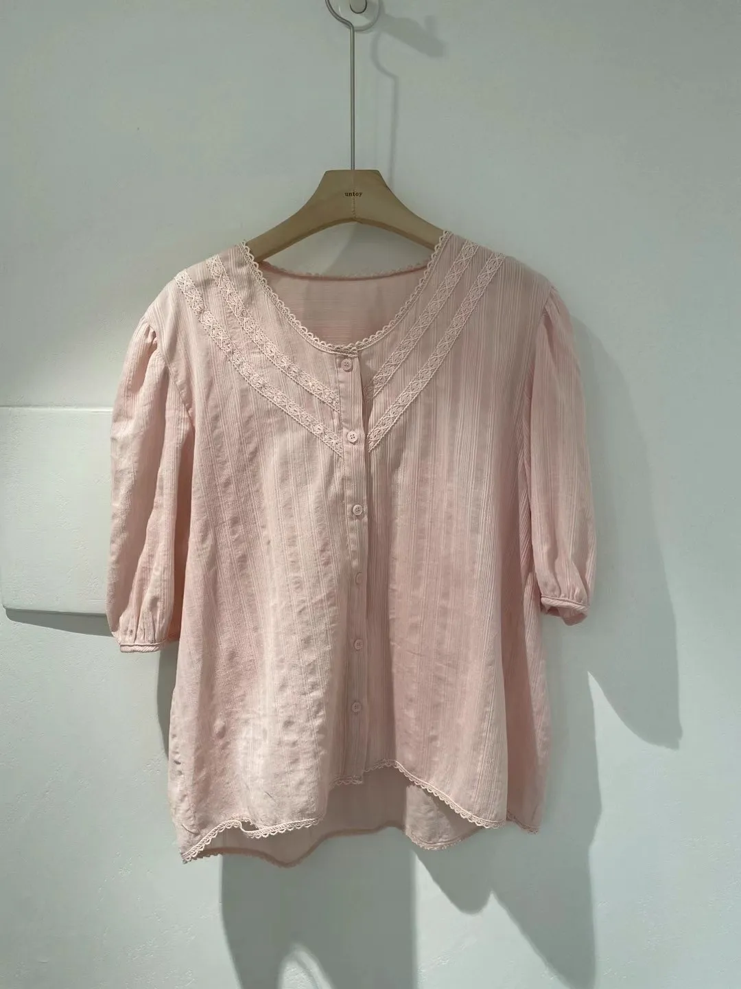 棉 精緻髮絲面料 薄款透光 蕾絲滾邊 袖口偏小 排釦穿脫