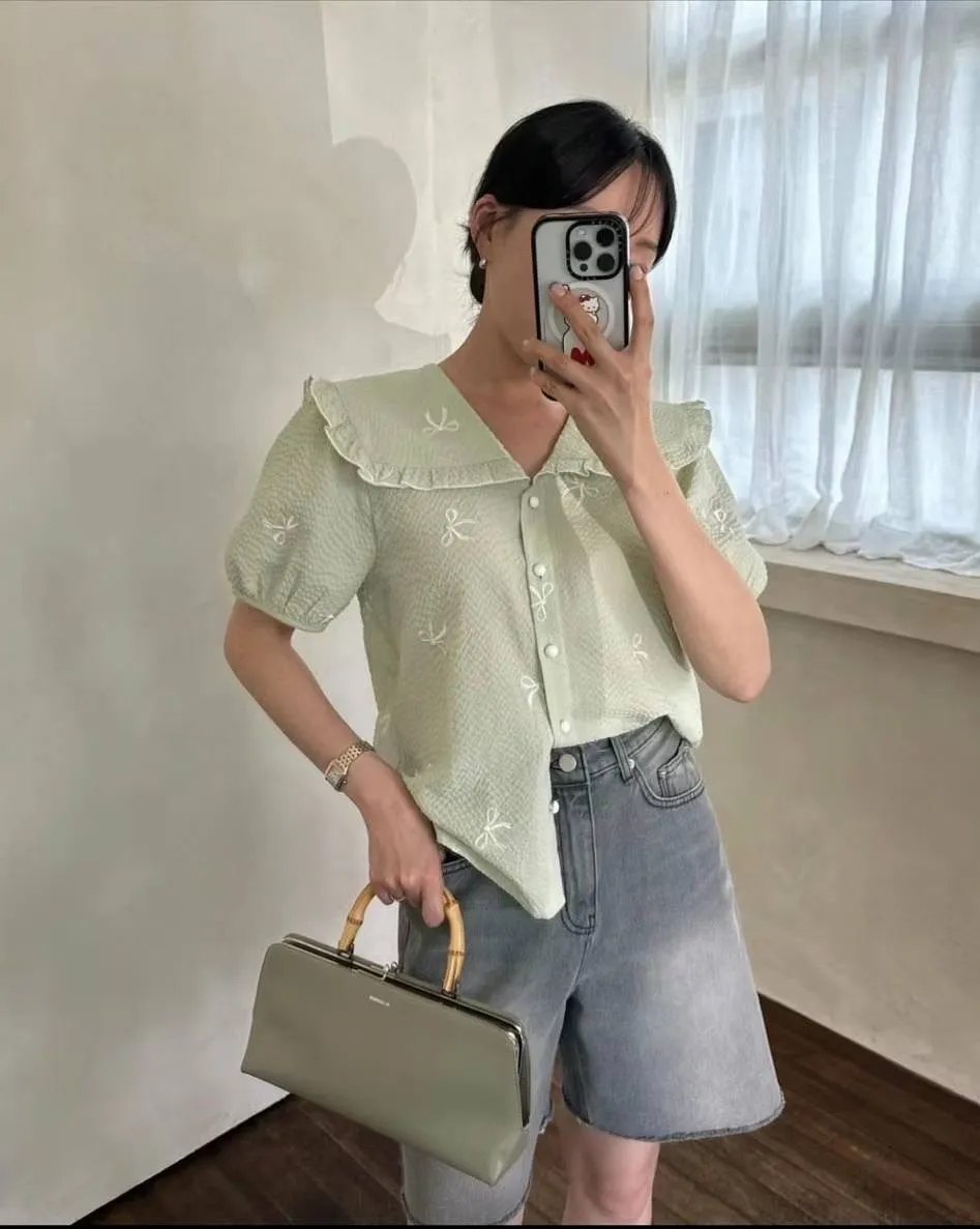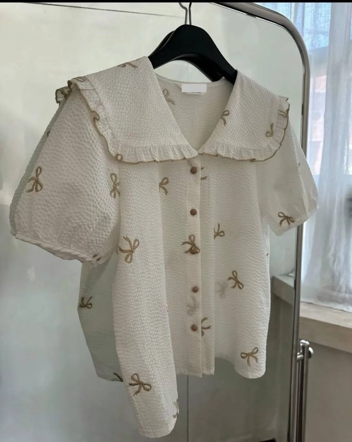 棉+聚酯 不易皺 雲朵翻領 刺繡蝴蝶結 L號友善