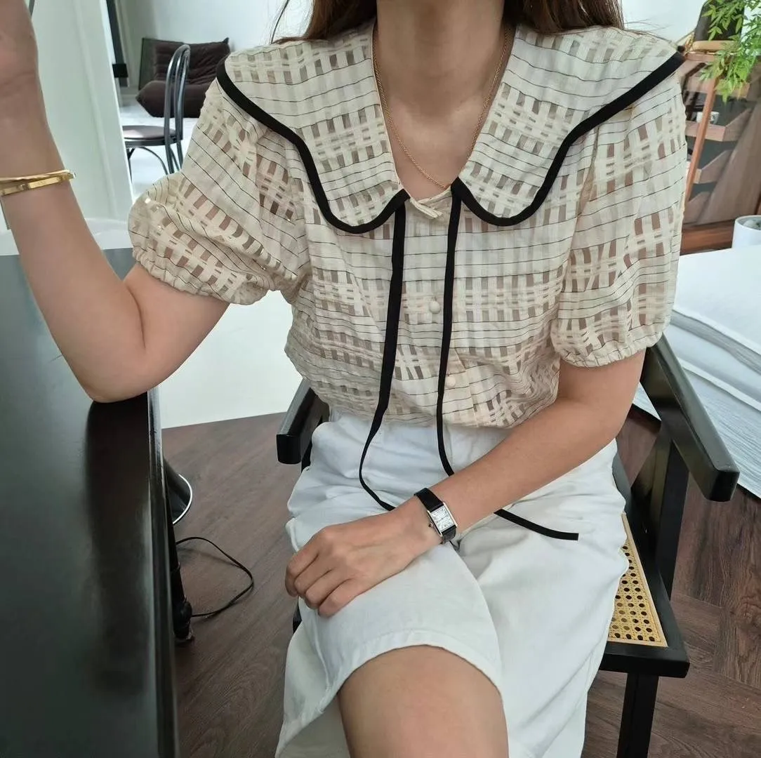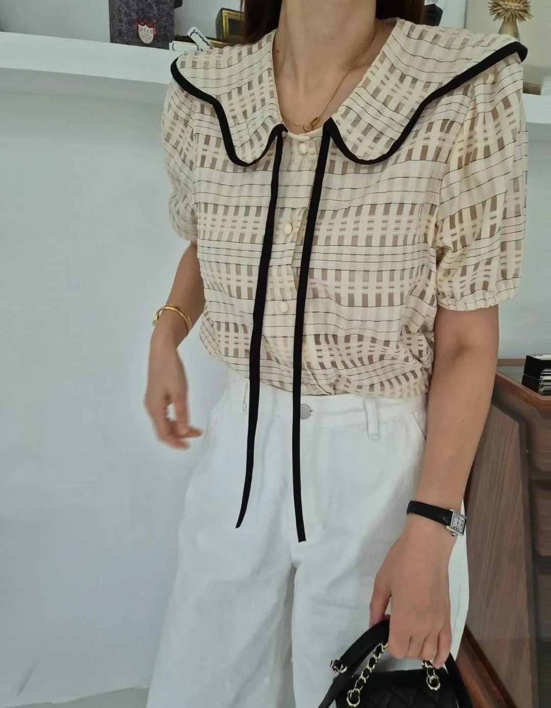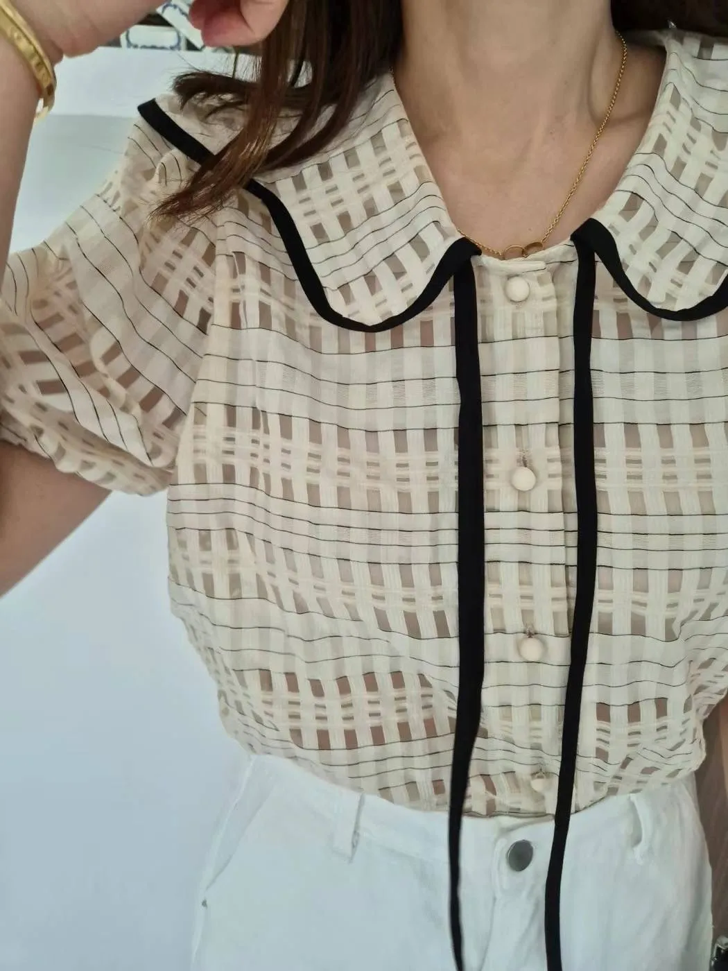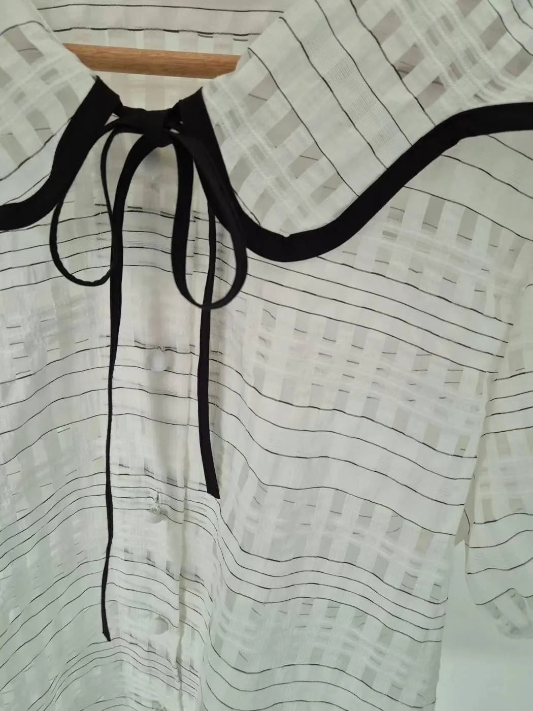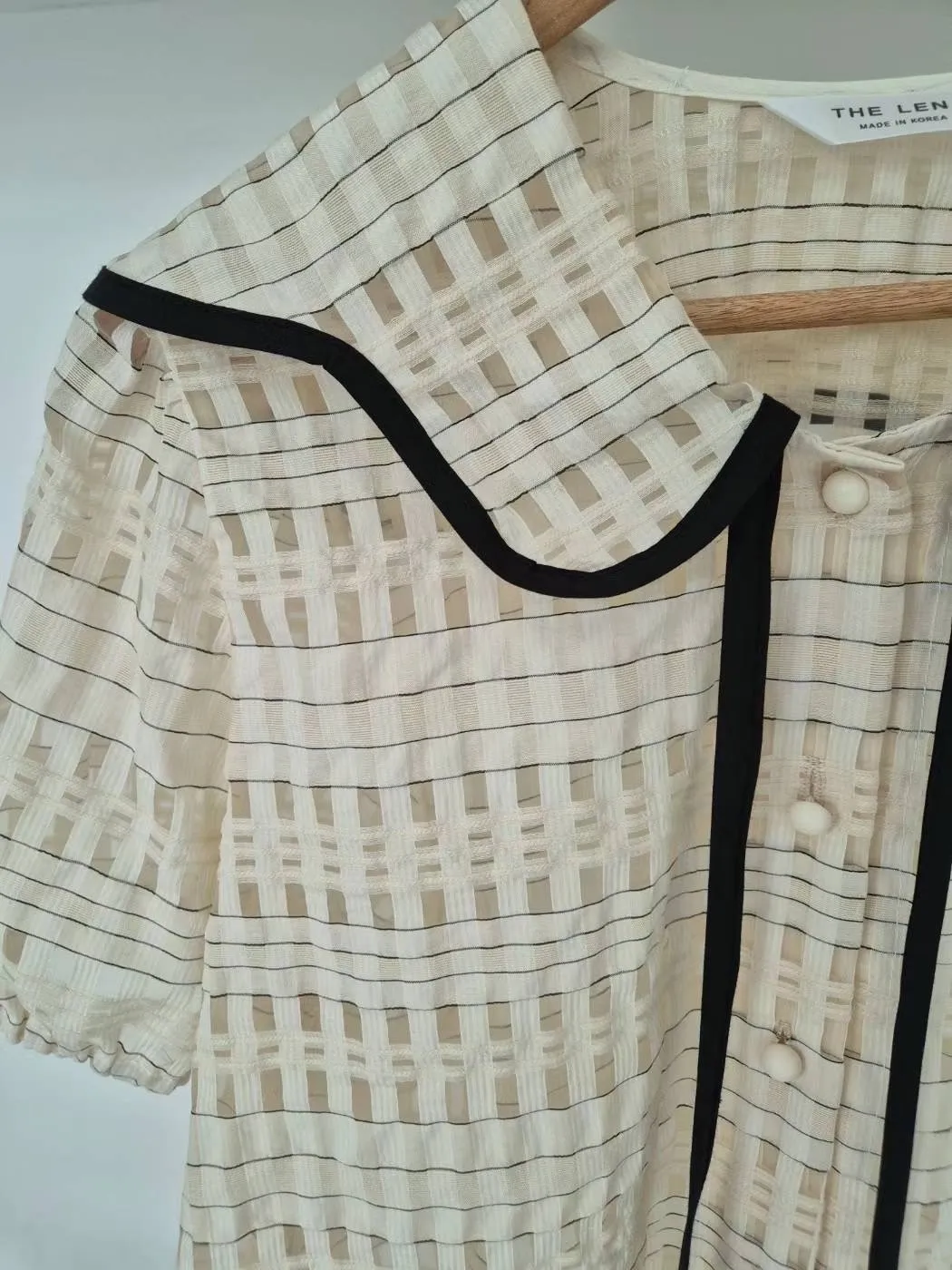 棉+聚酯 細緻簍空透光面料 視覺精緻 滾邊黑色跳色領綁繩
