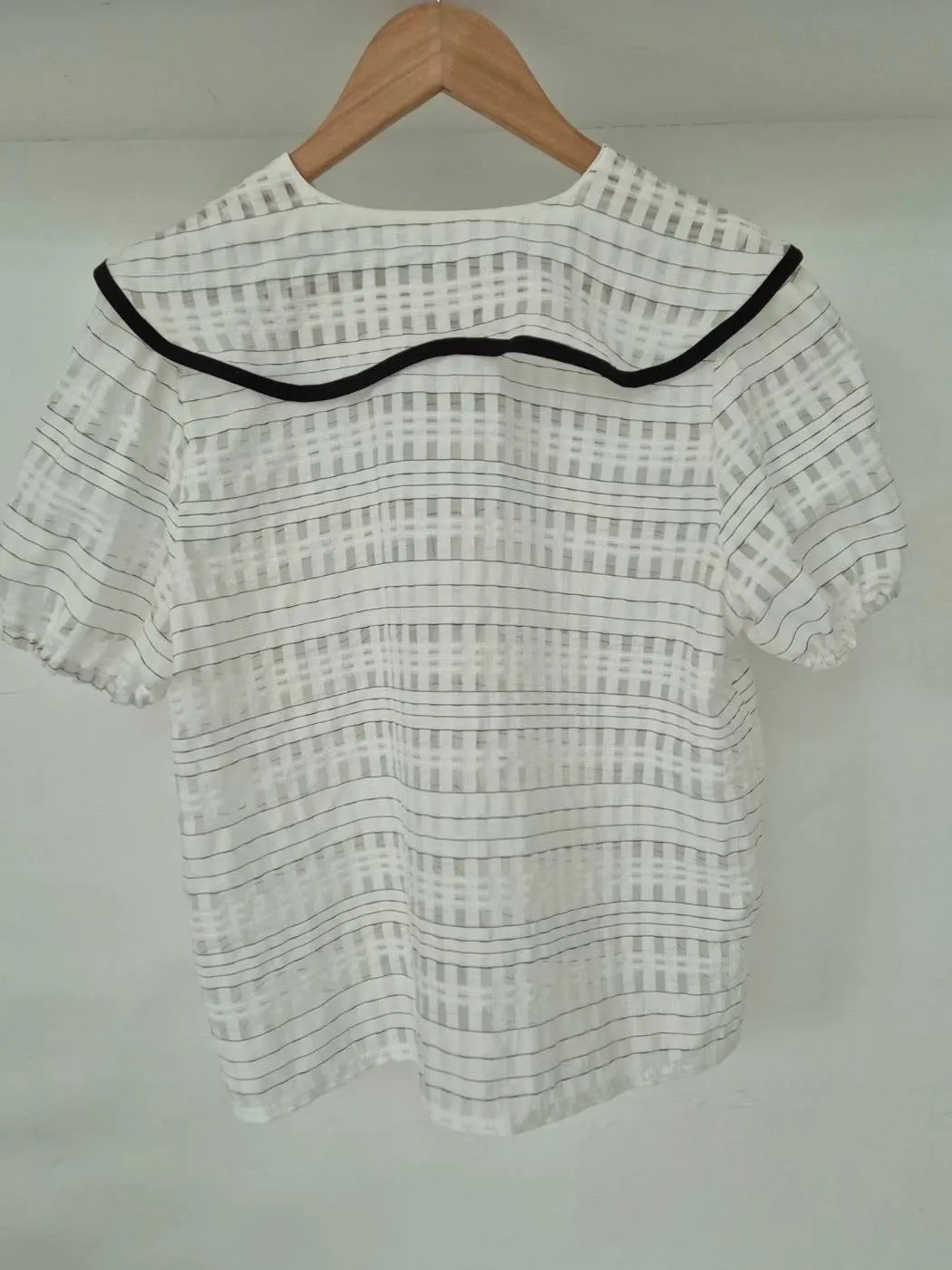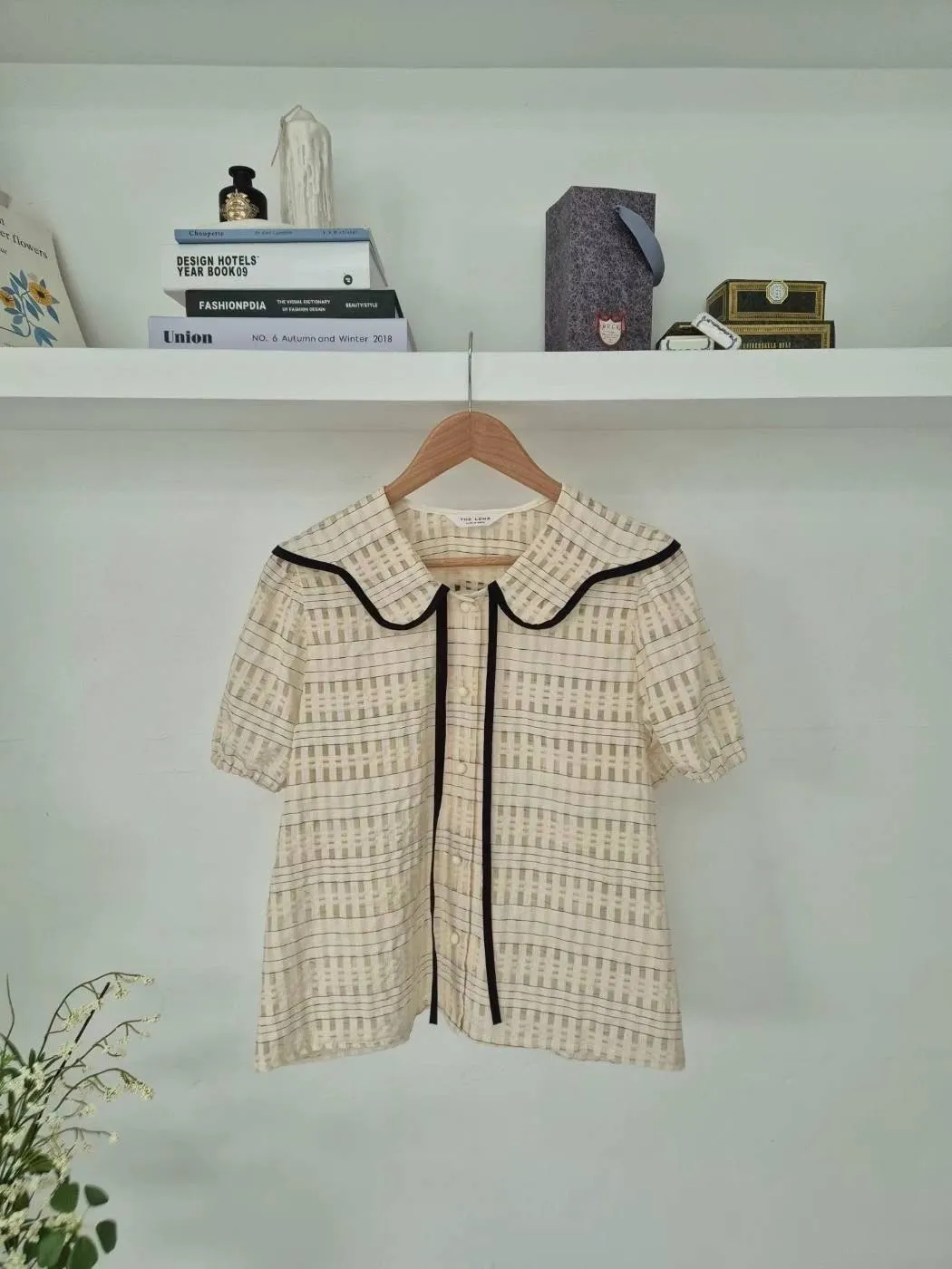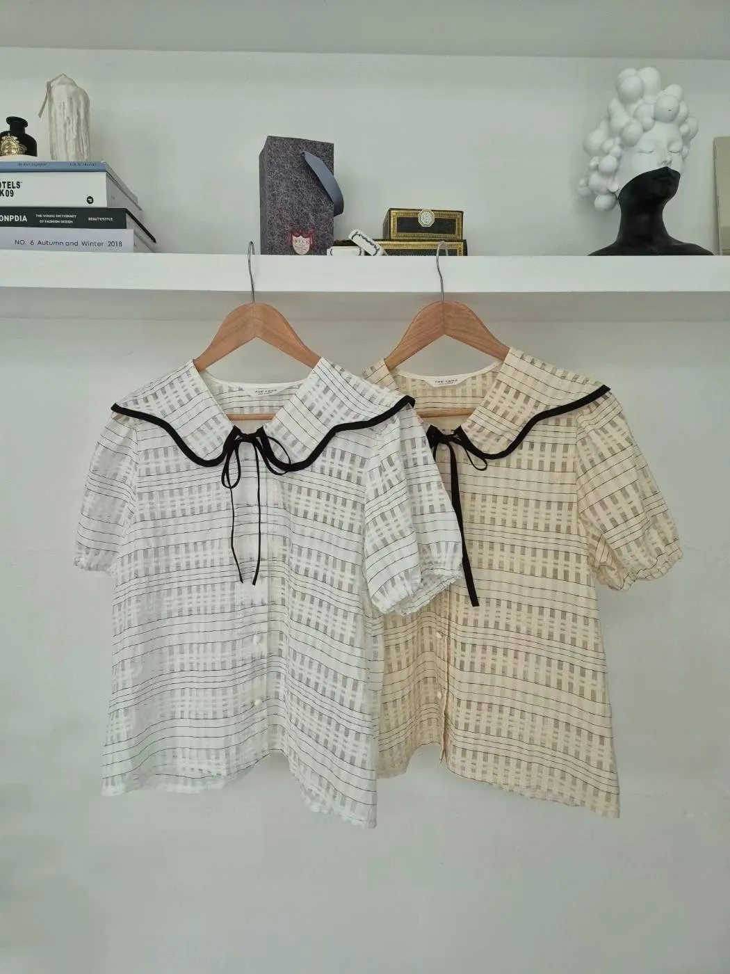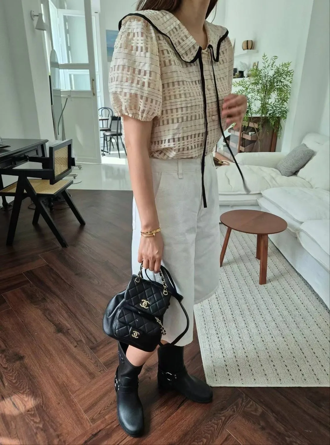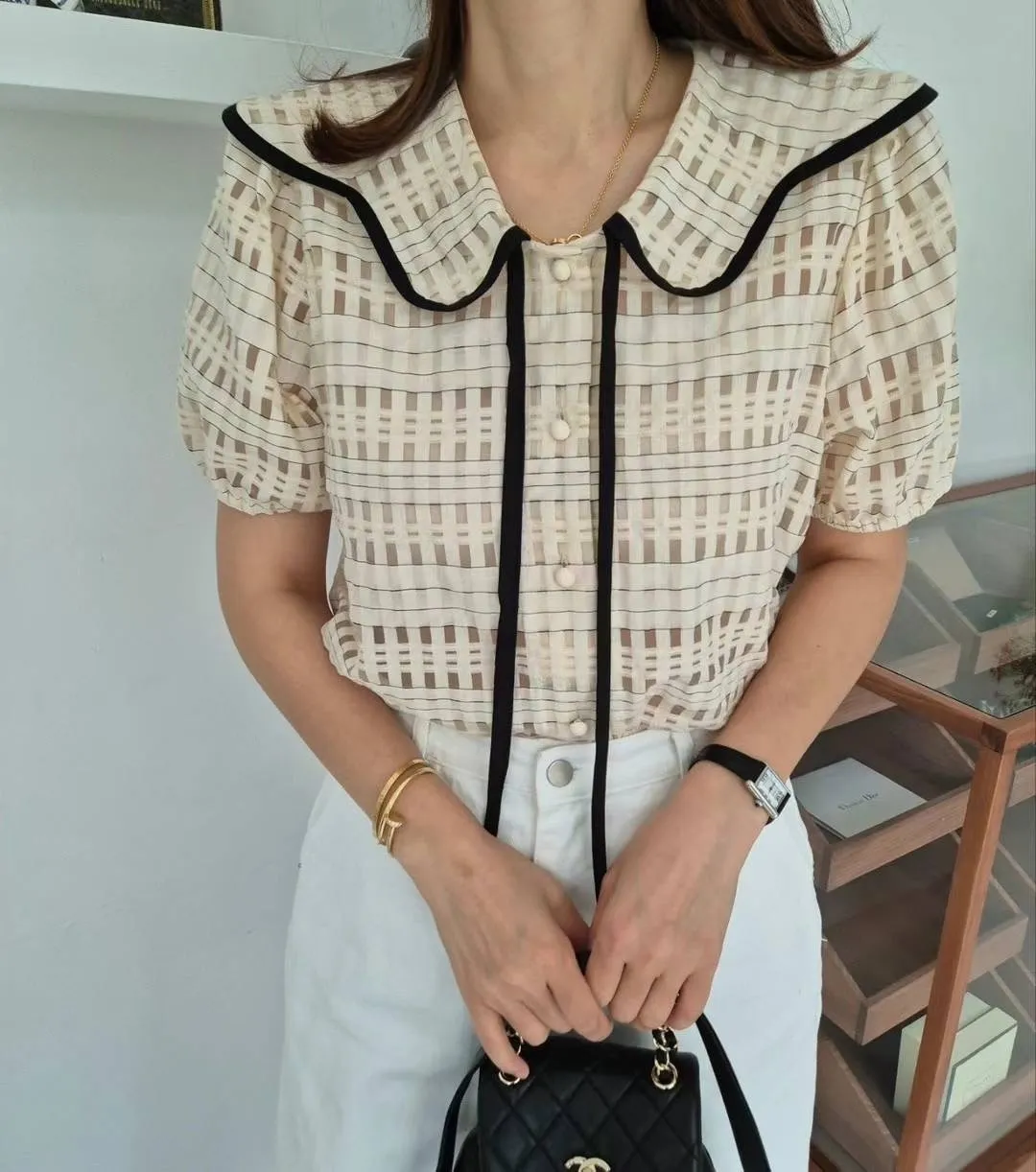 棉+聚酯 細緻簍空透光面料 視覺精緻 滾邊黑色跳色領綁繩