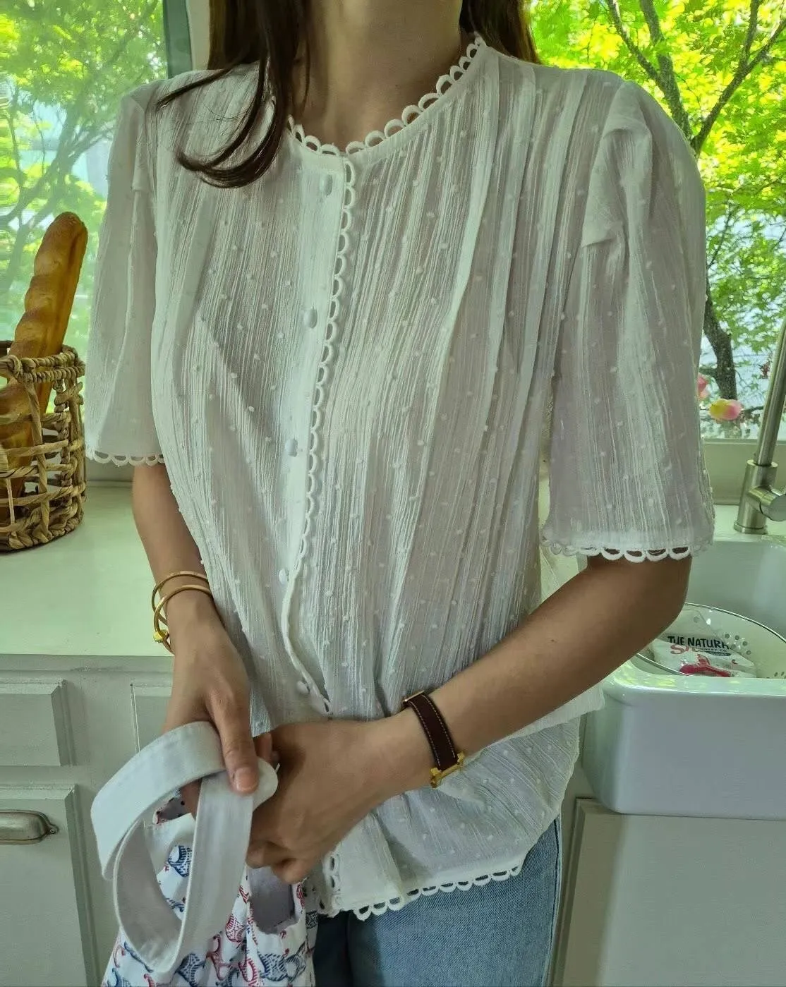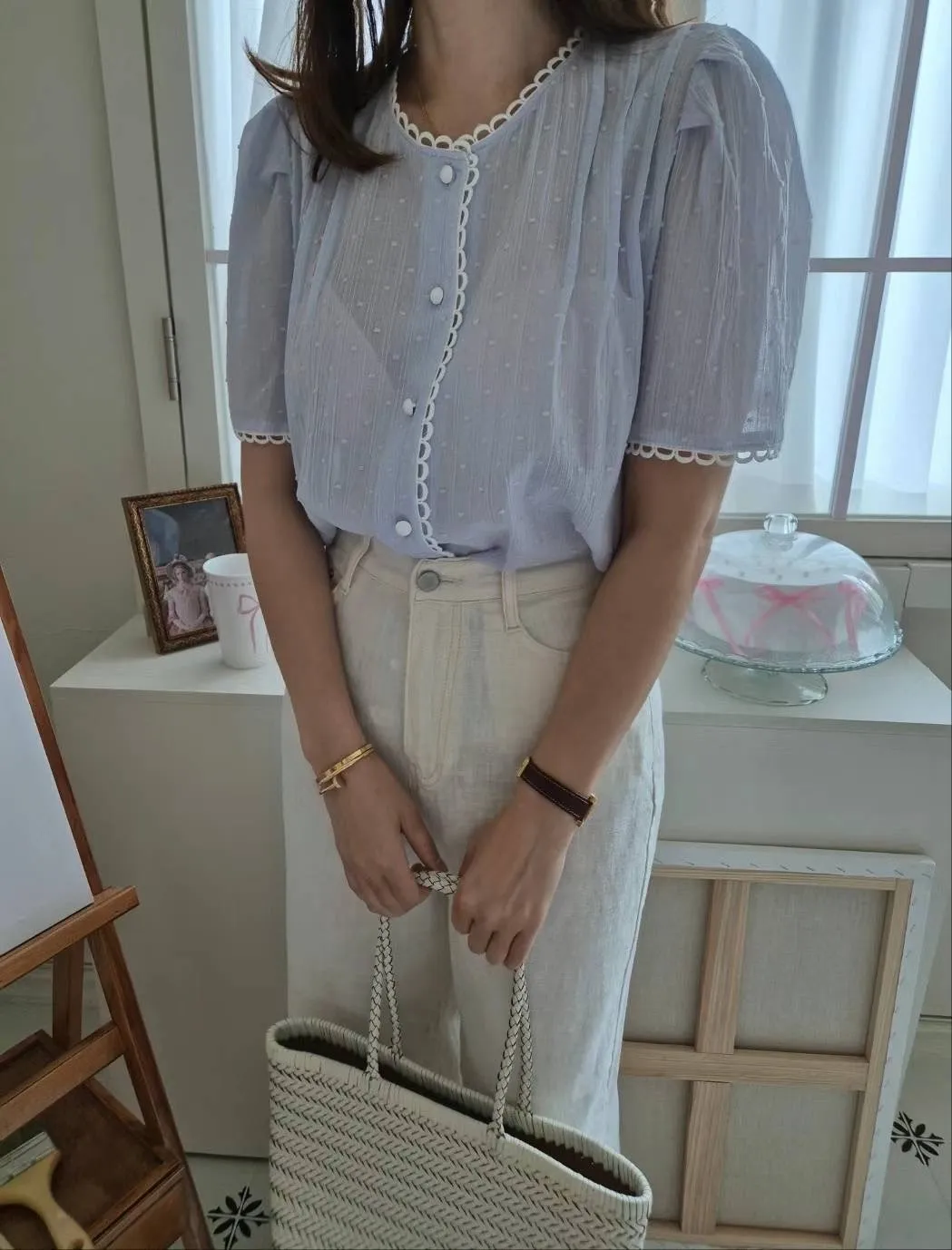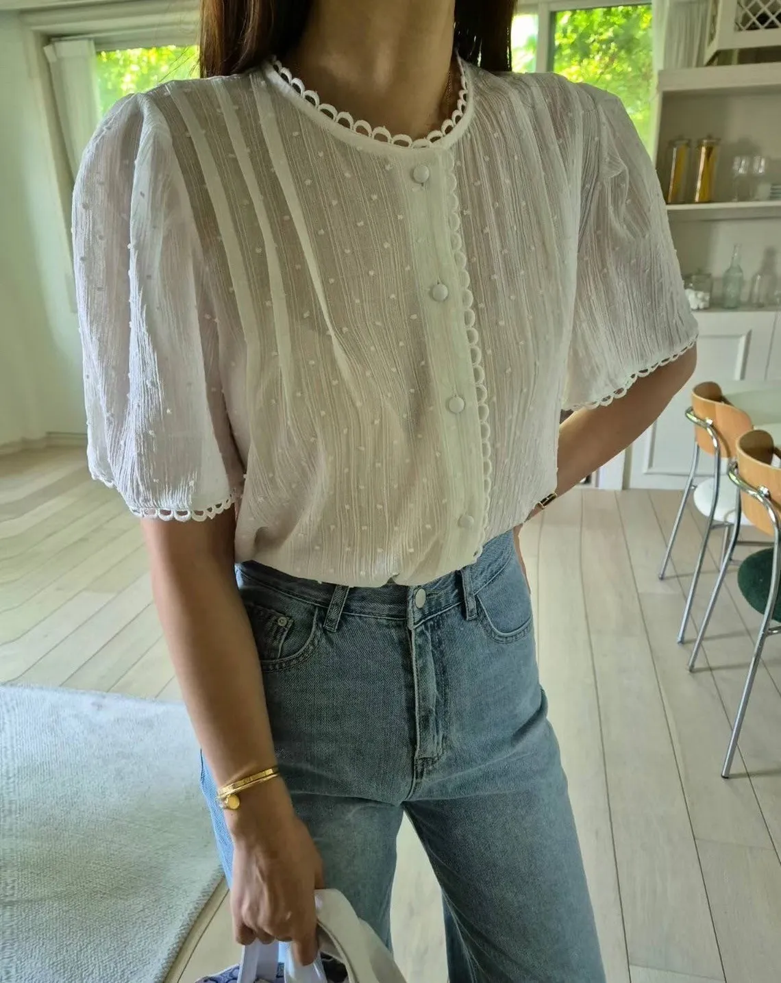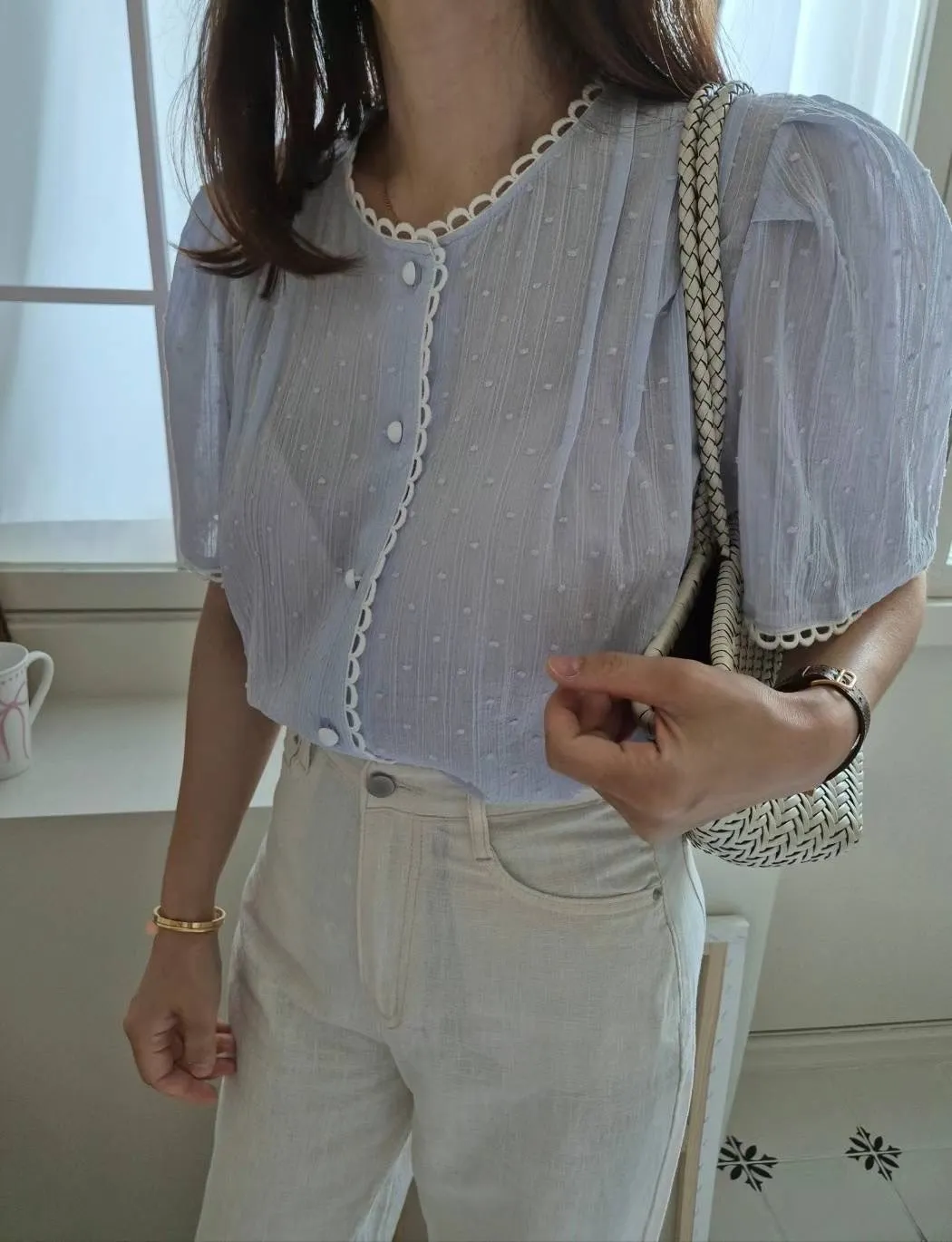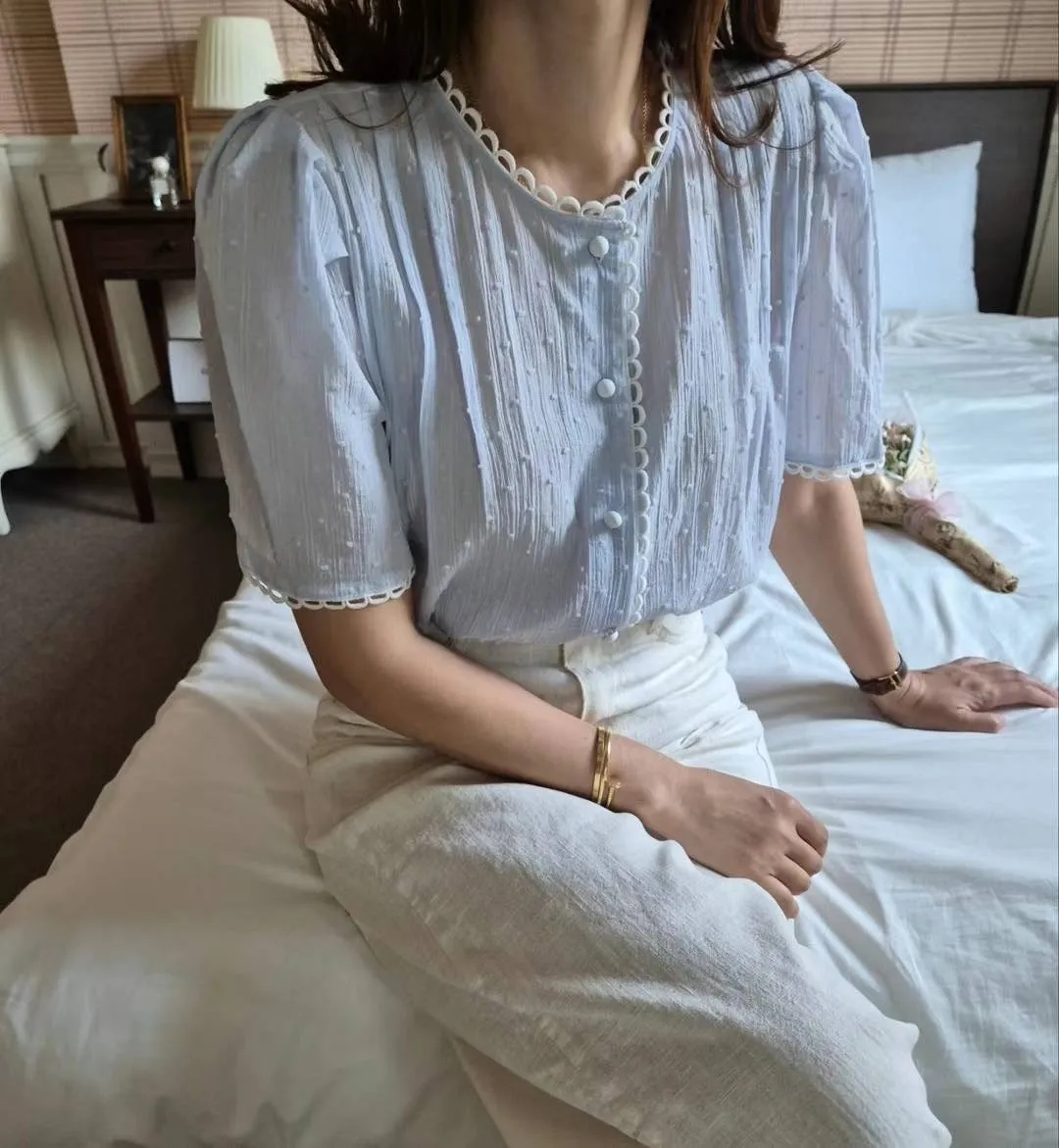棉,立體點點面料 蕾絲簍空滾邊 細緻紋理 公主袖 排釦穿脫