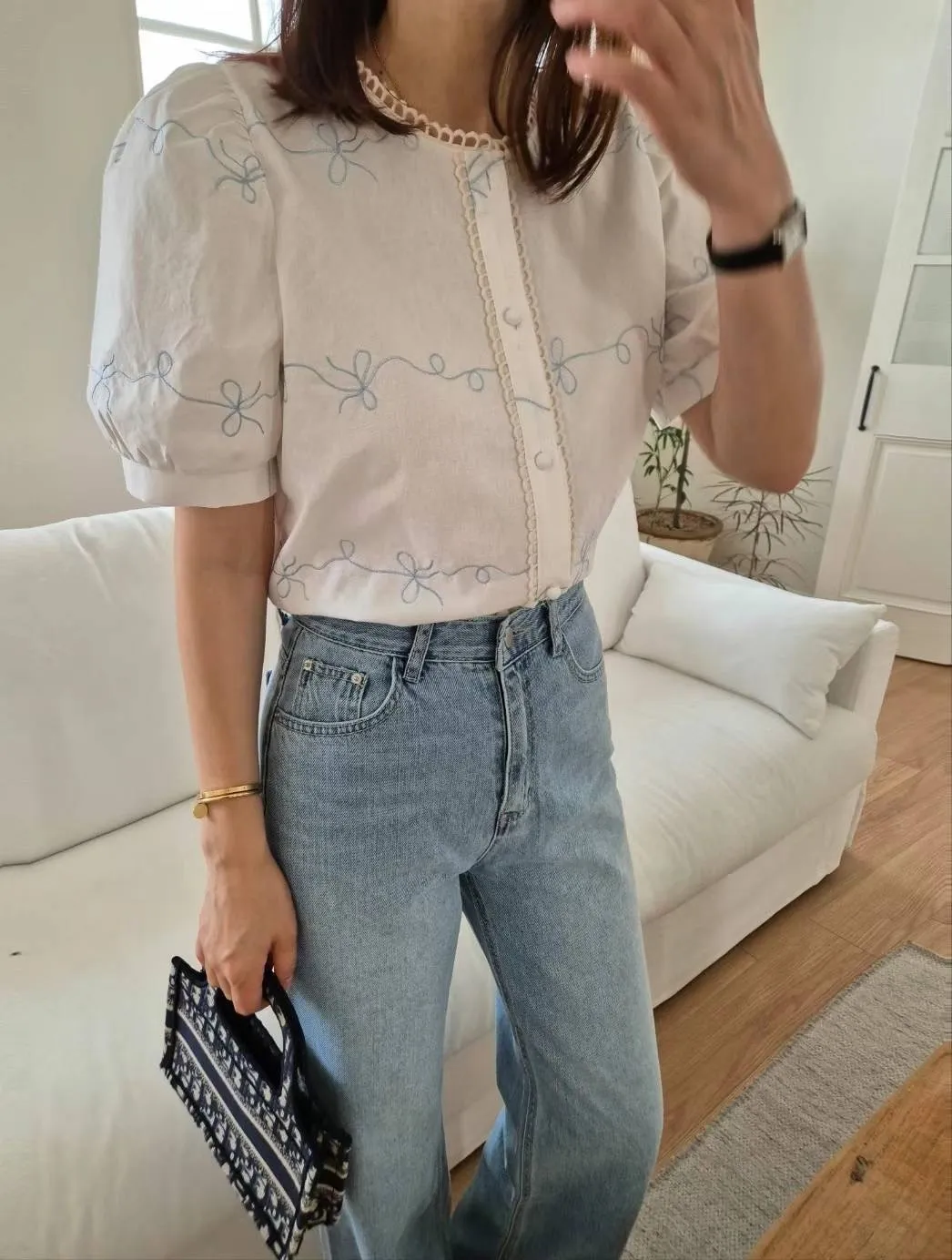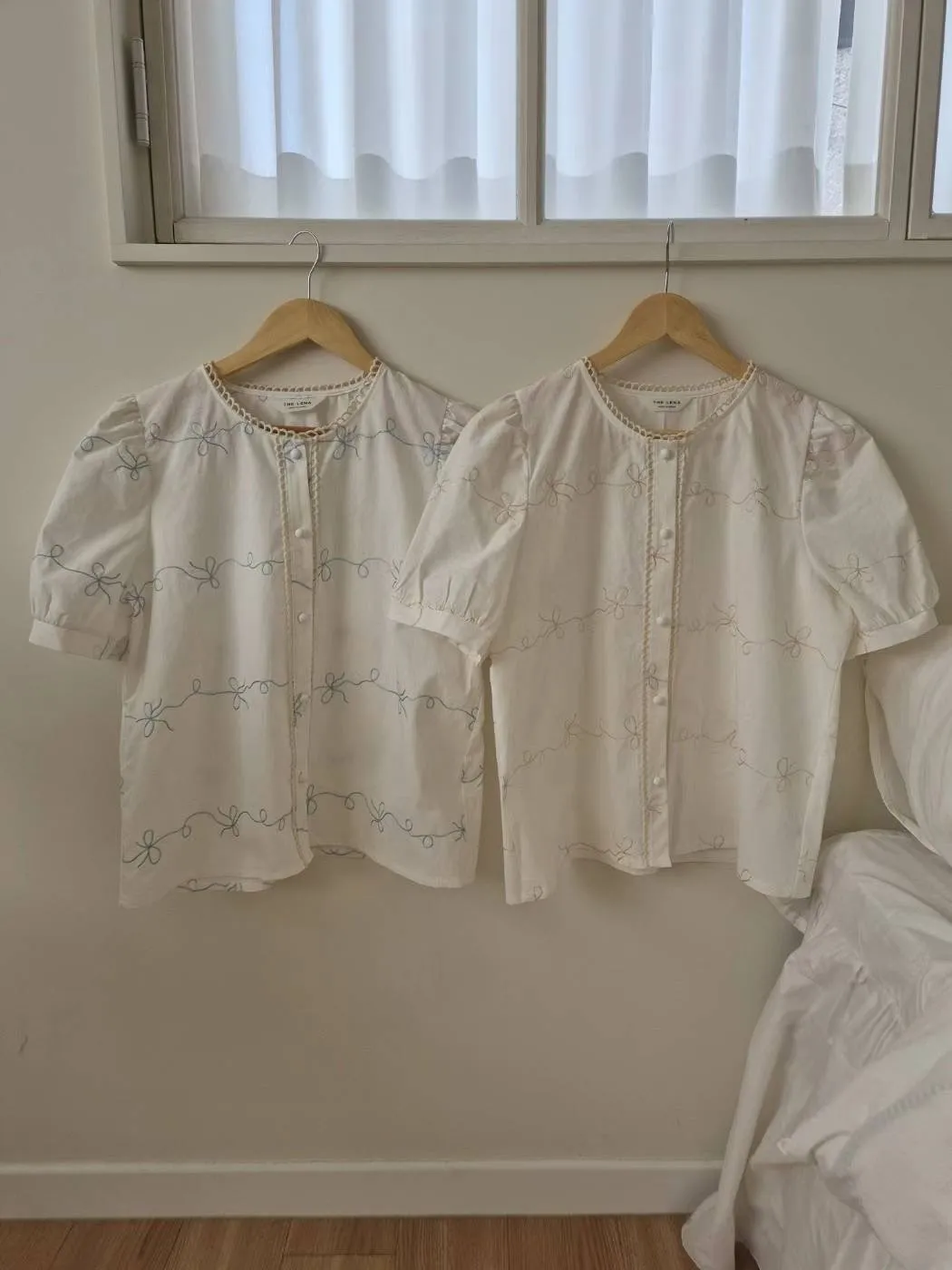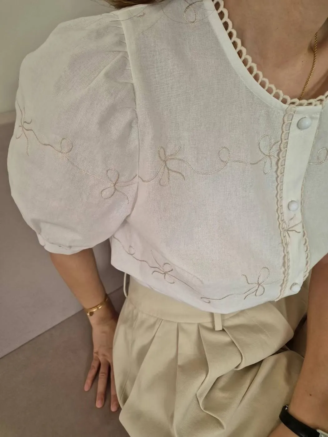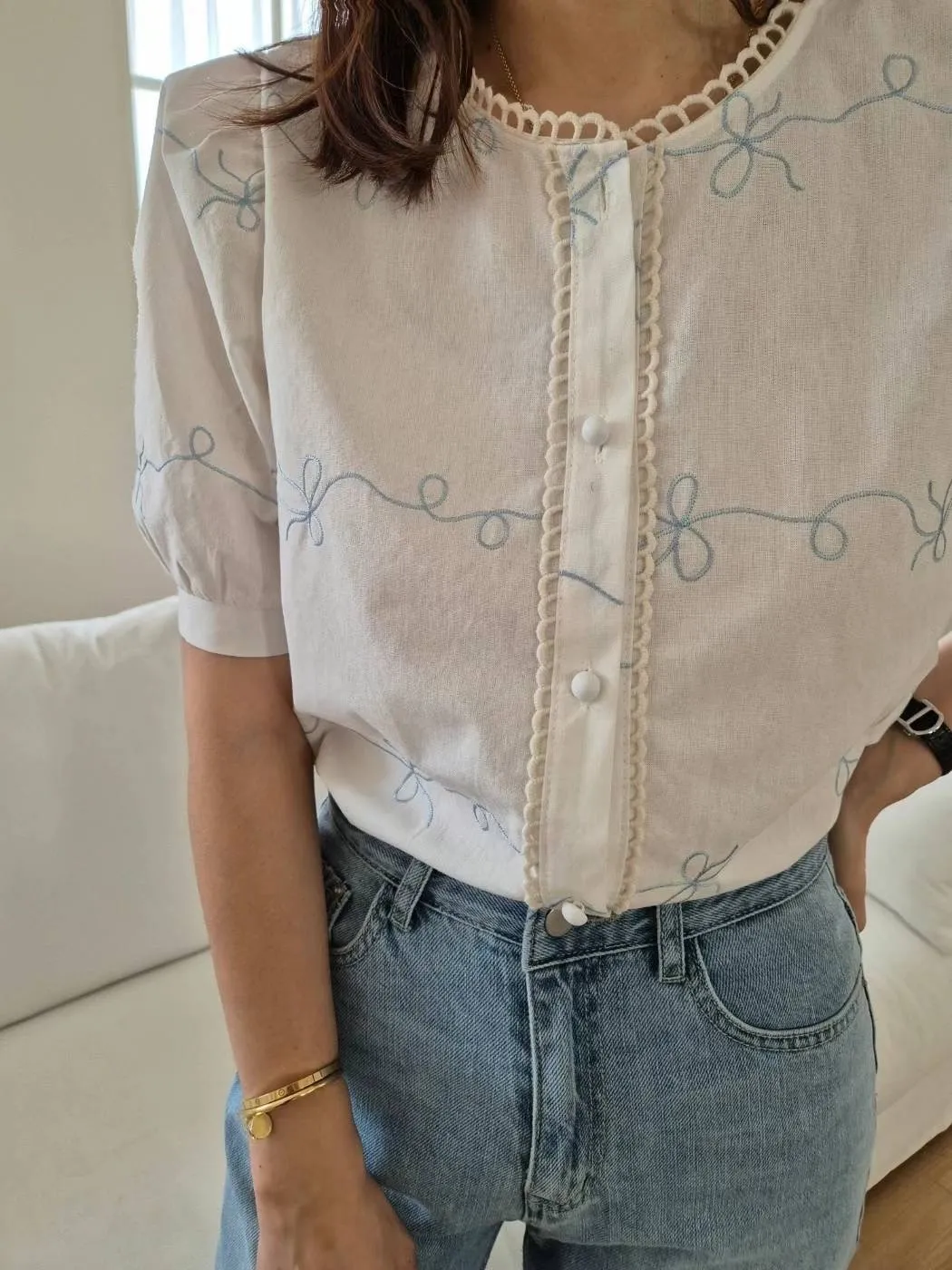 棉,精緻蝴蝶結刺繡 簍空滾邊領 布包釦穿脫 袖口寬鬆