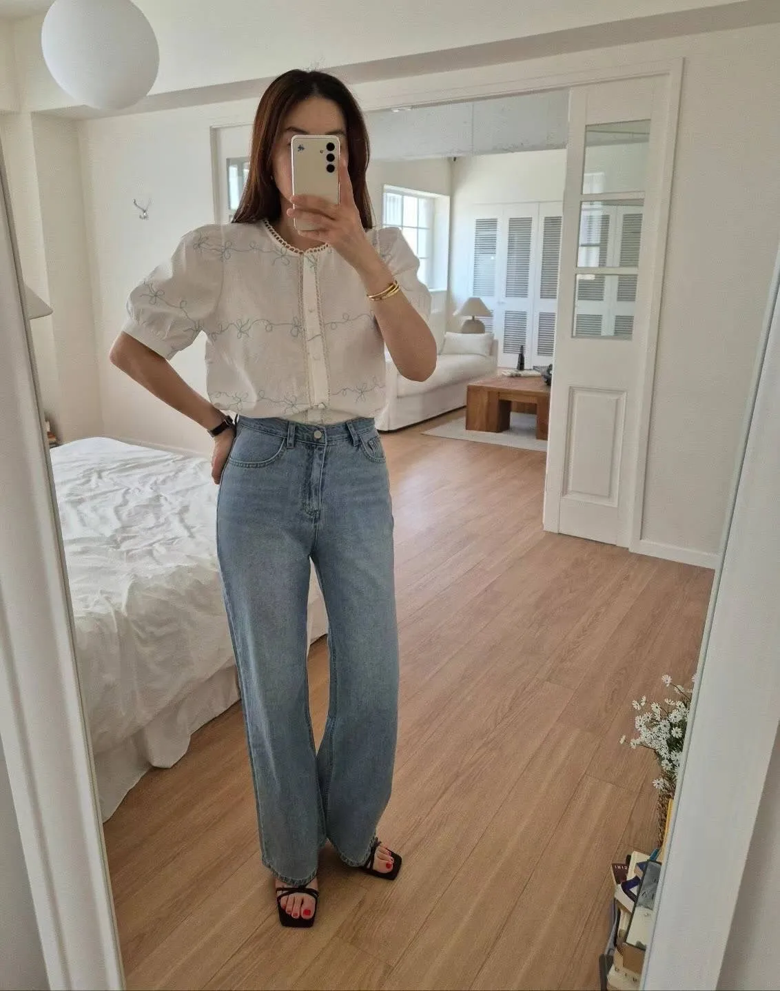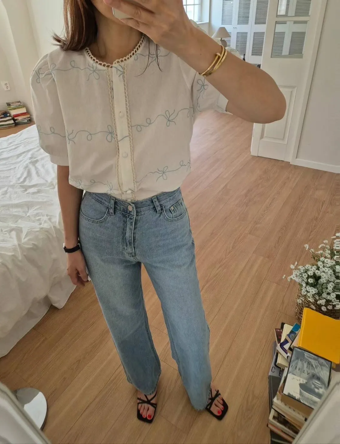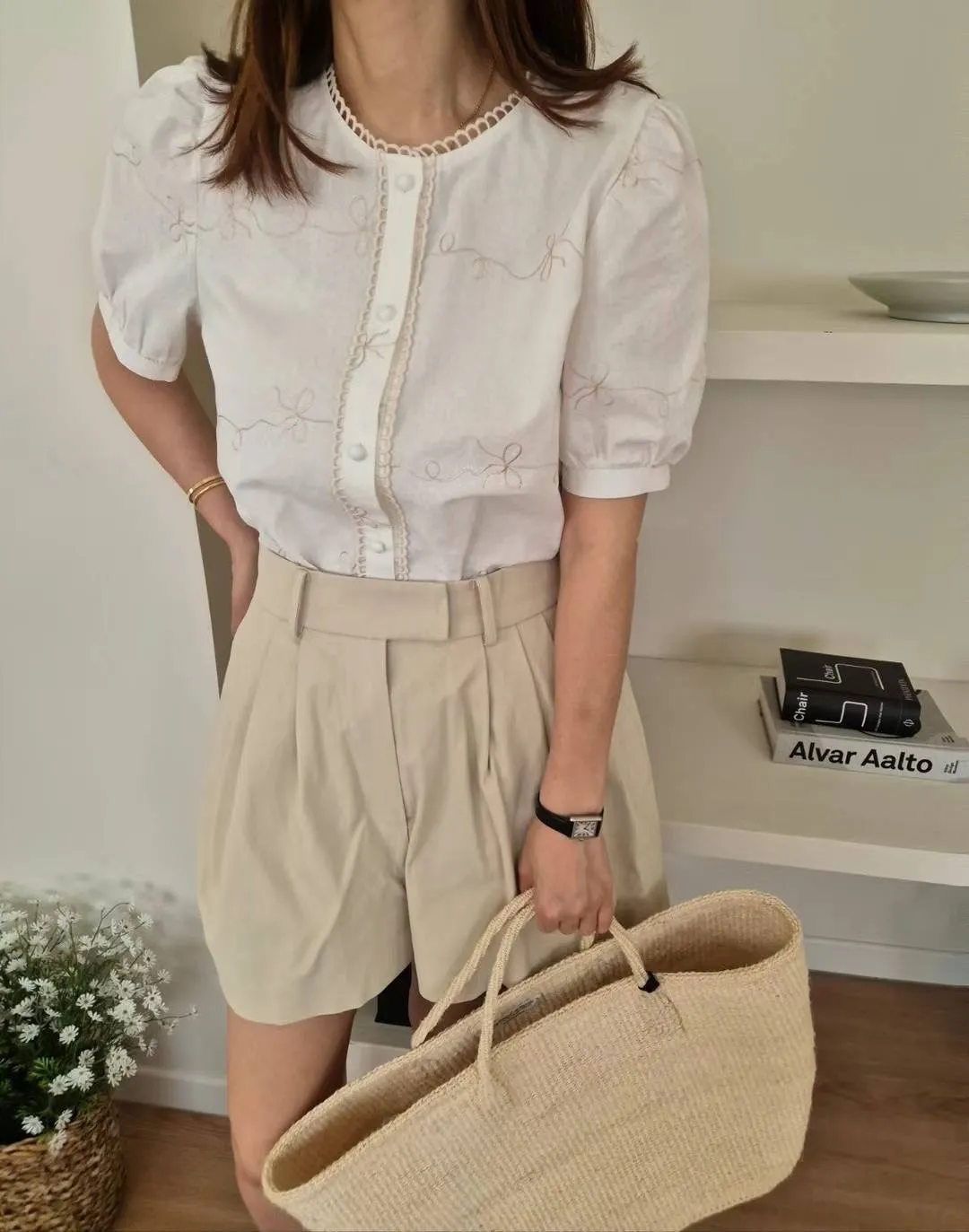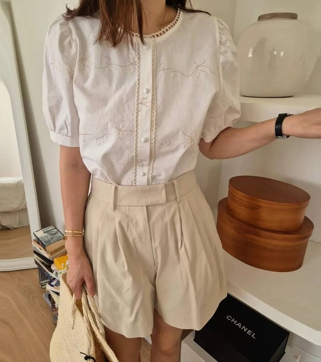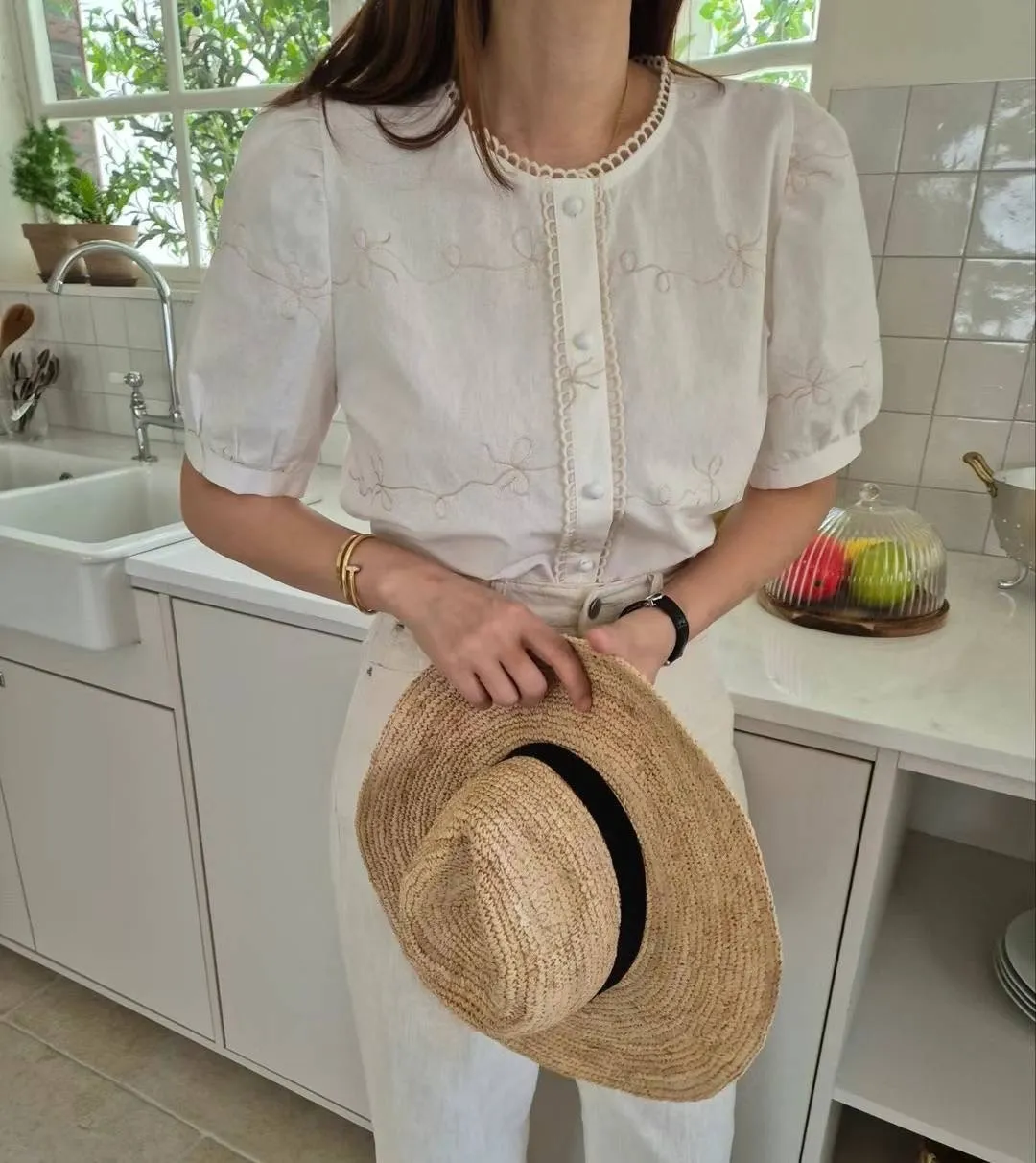 棉,精緻蝴蝶結刺繡 簍空滾邊領 布包釦穿脫 袖口寬鬆