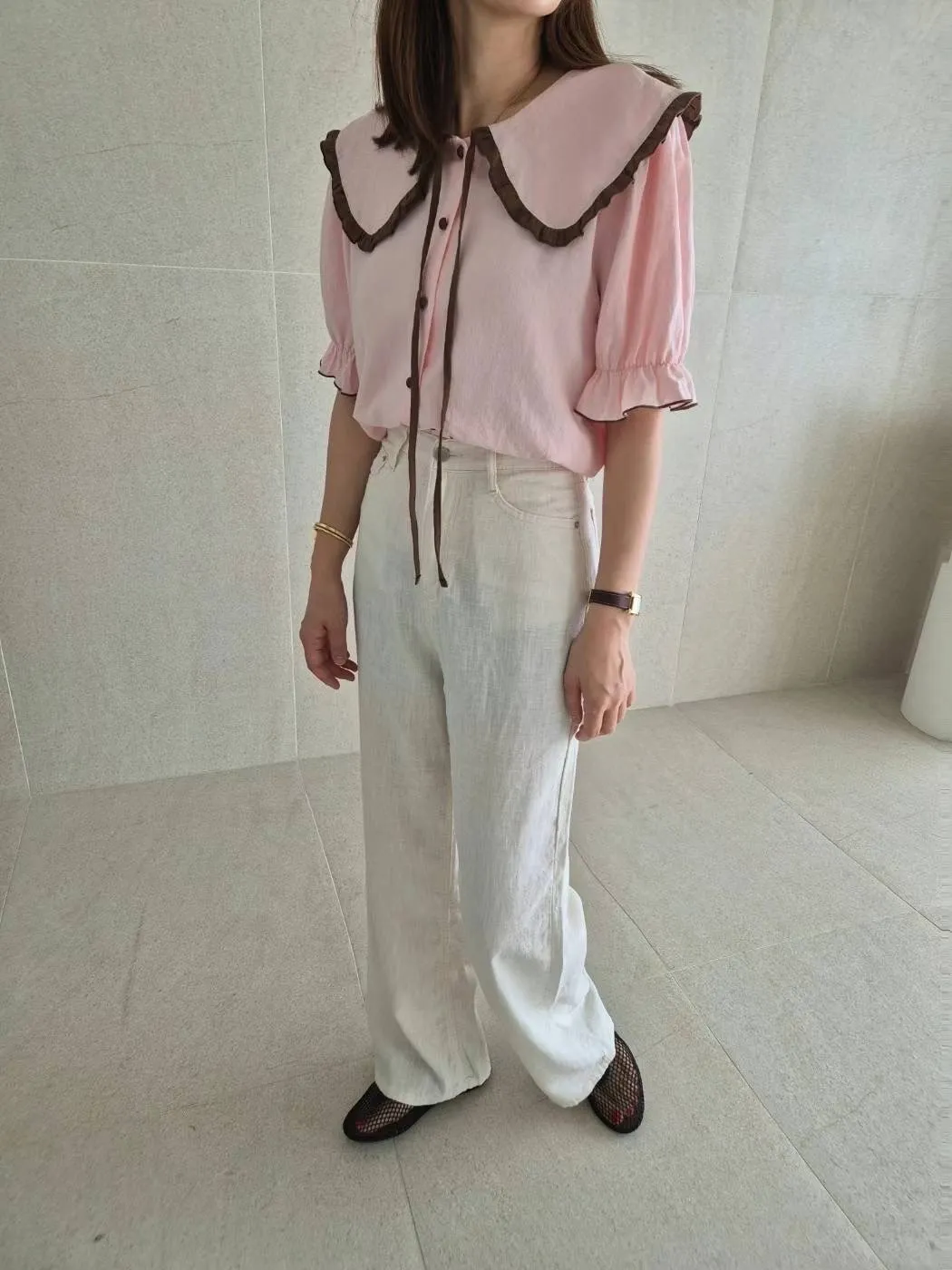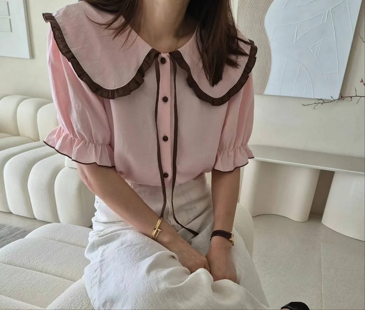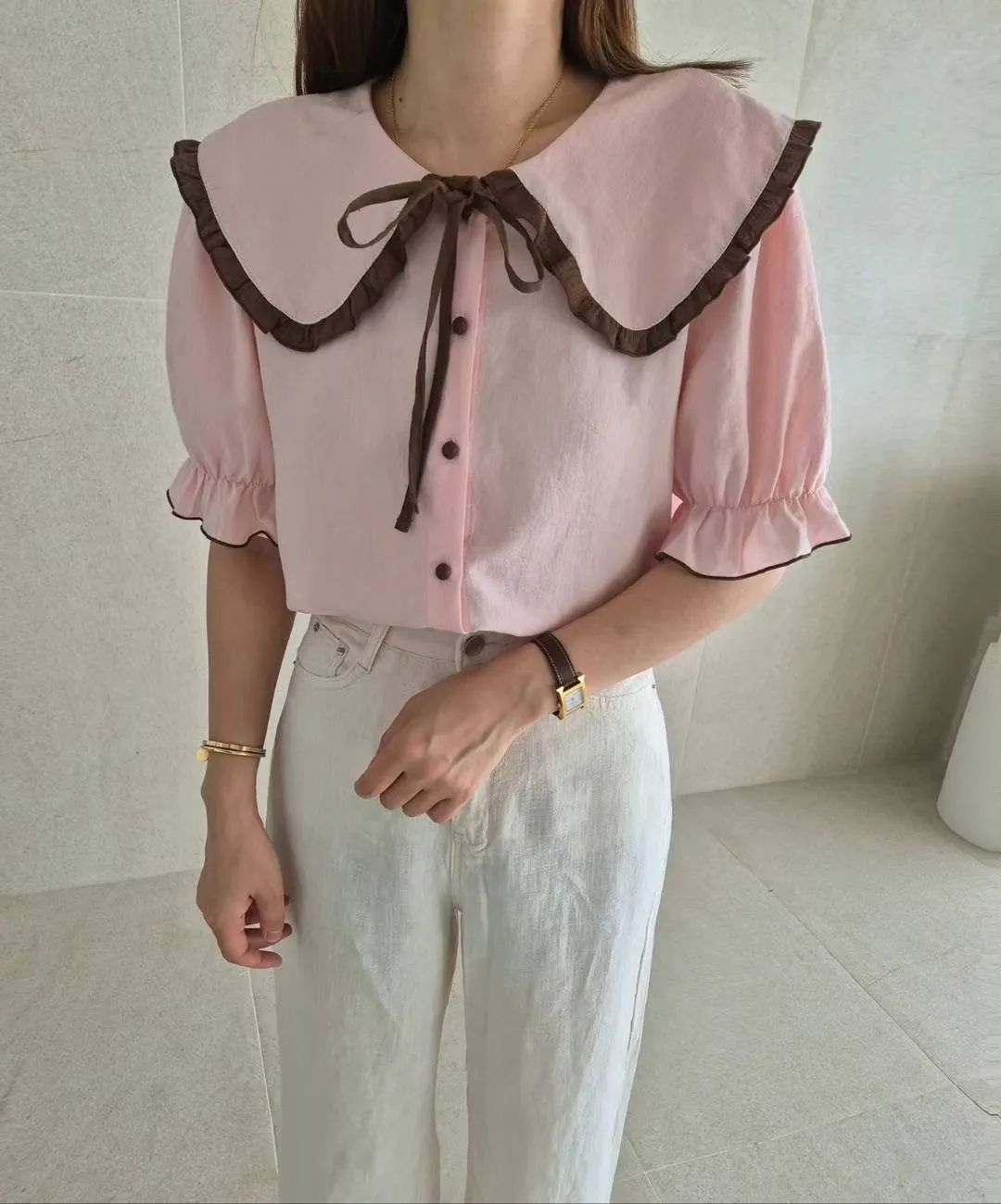 棉,透氣舒適 咖色雲朵滾邊領 胸綁帶 排釦穿脫 袖口空間佳