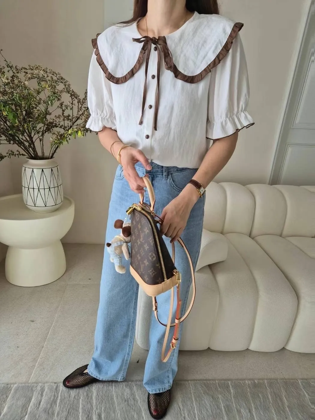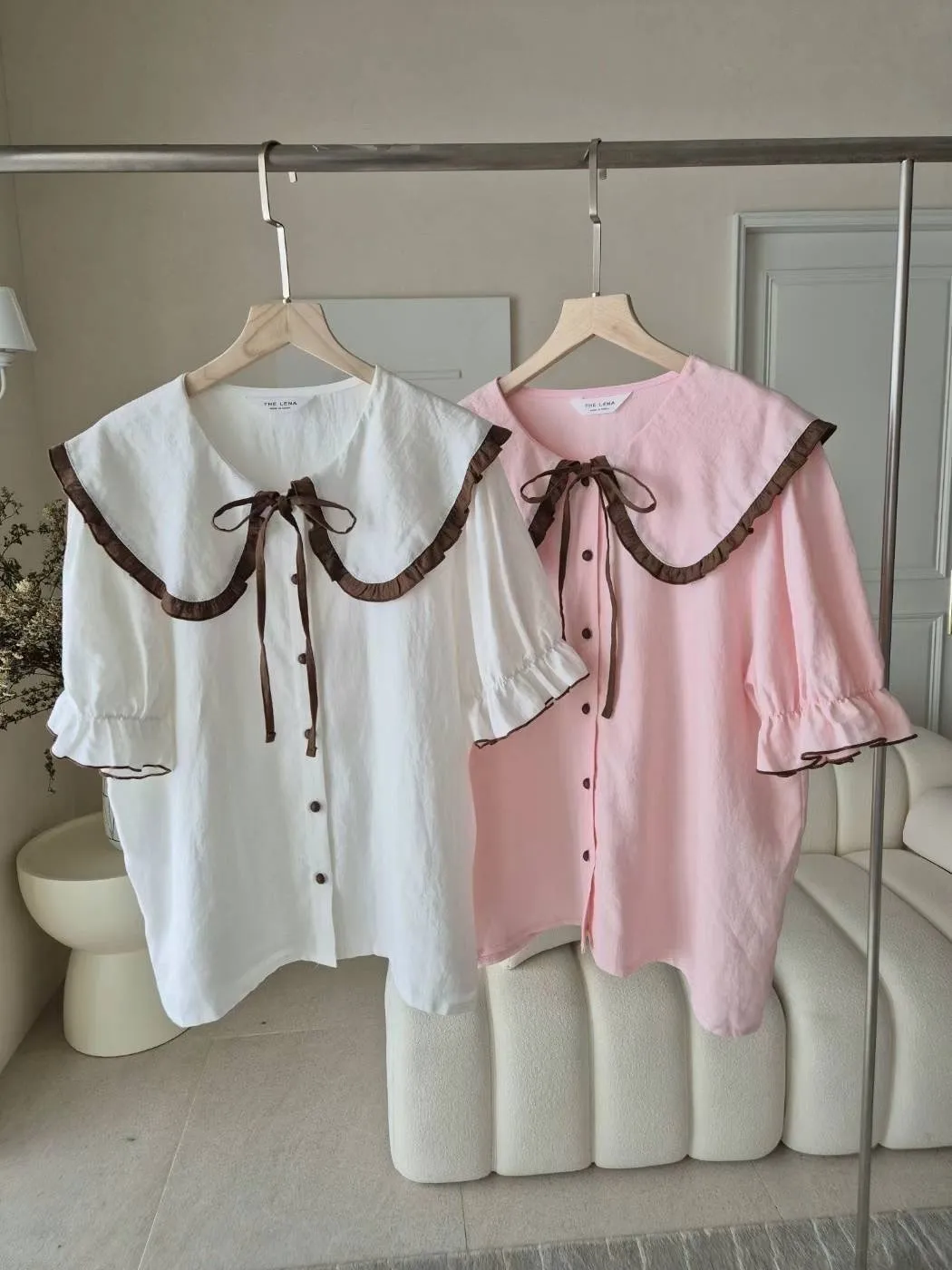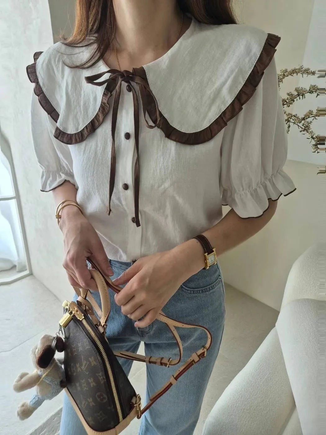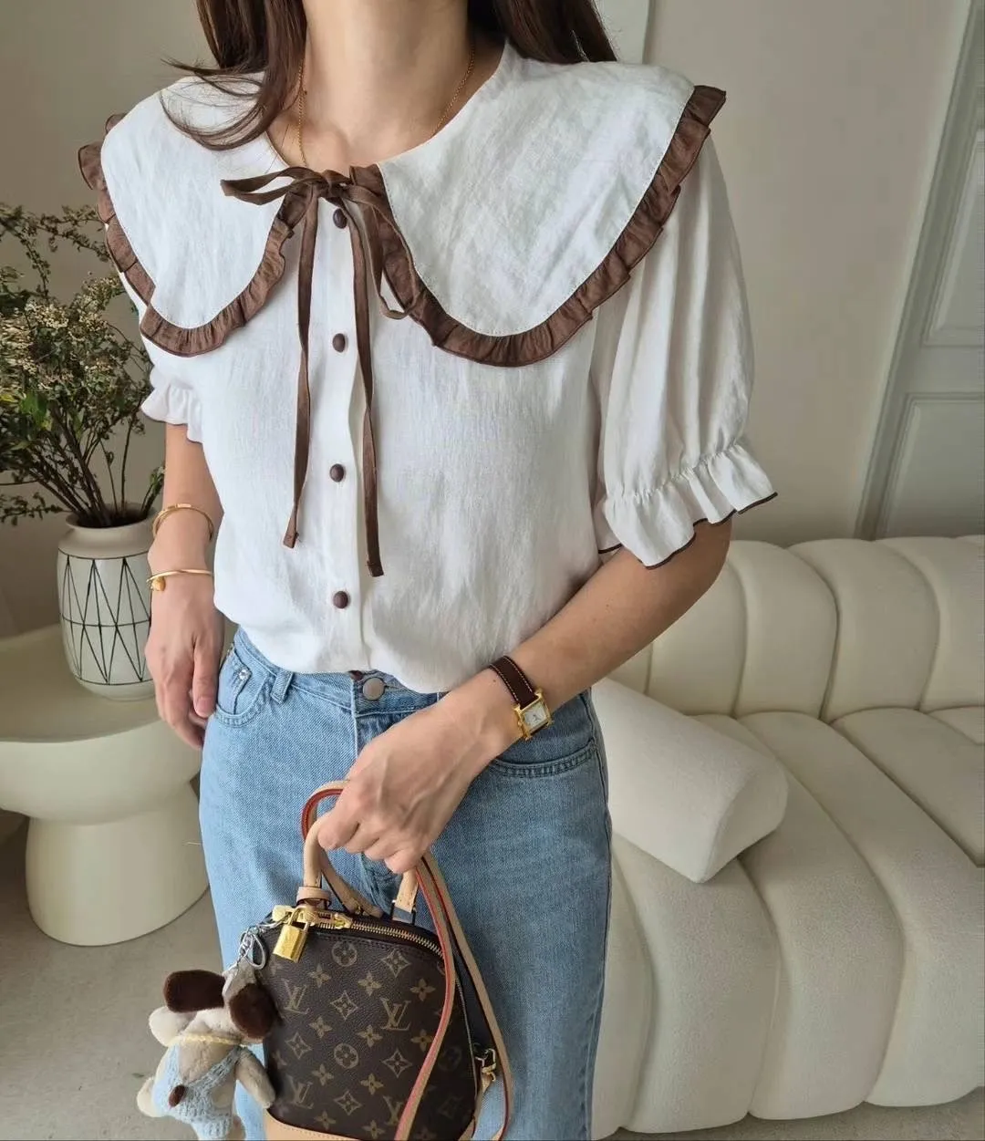 棉,透氣舒適 咖色雲朵滾邊領 胸綁帶 排釦穿脫 袖口空間佳