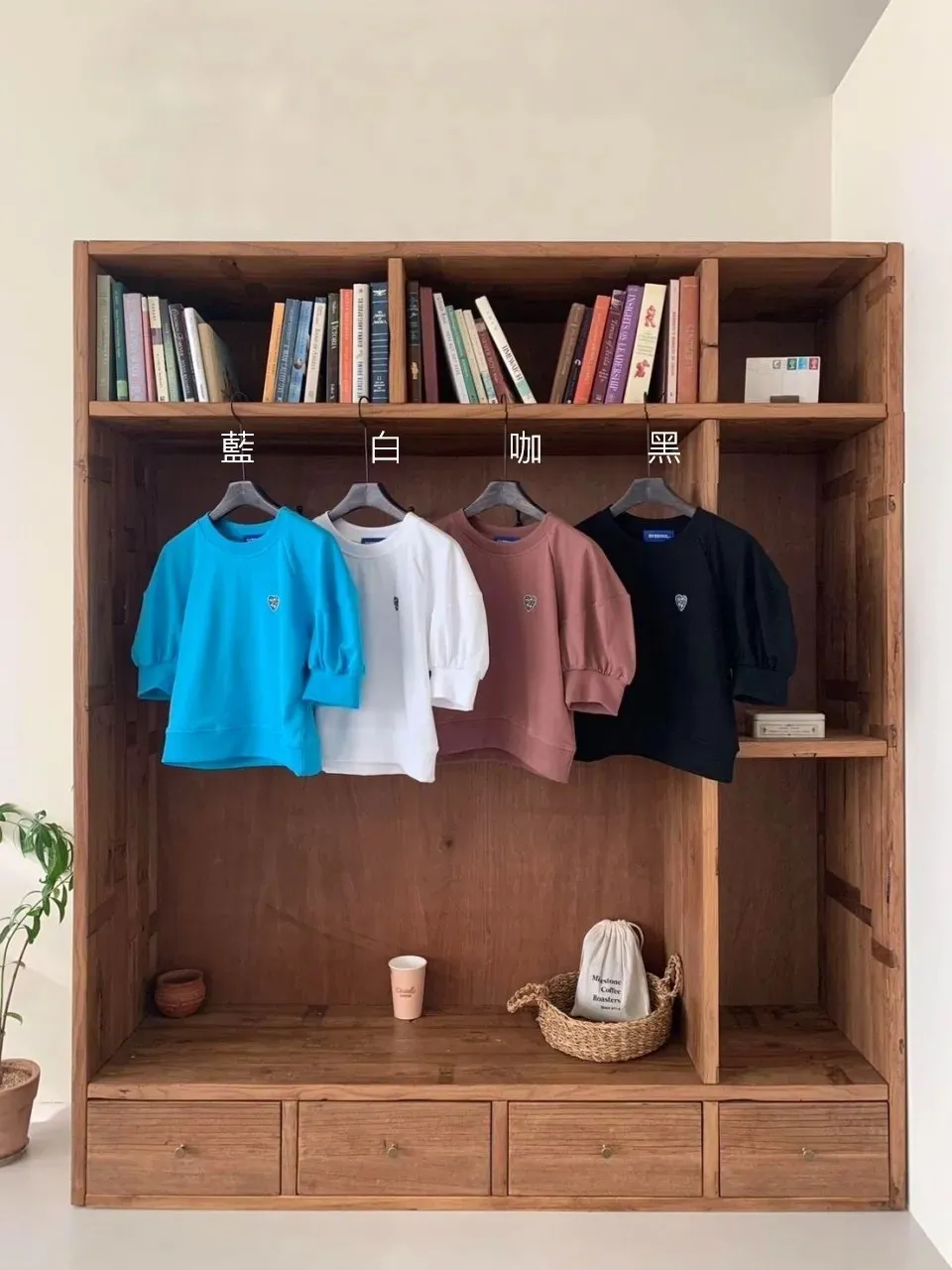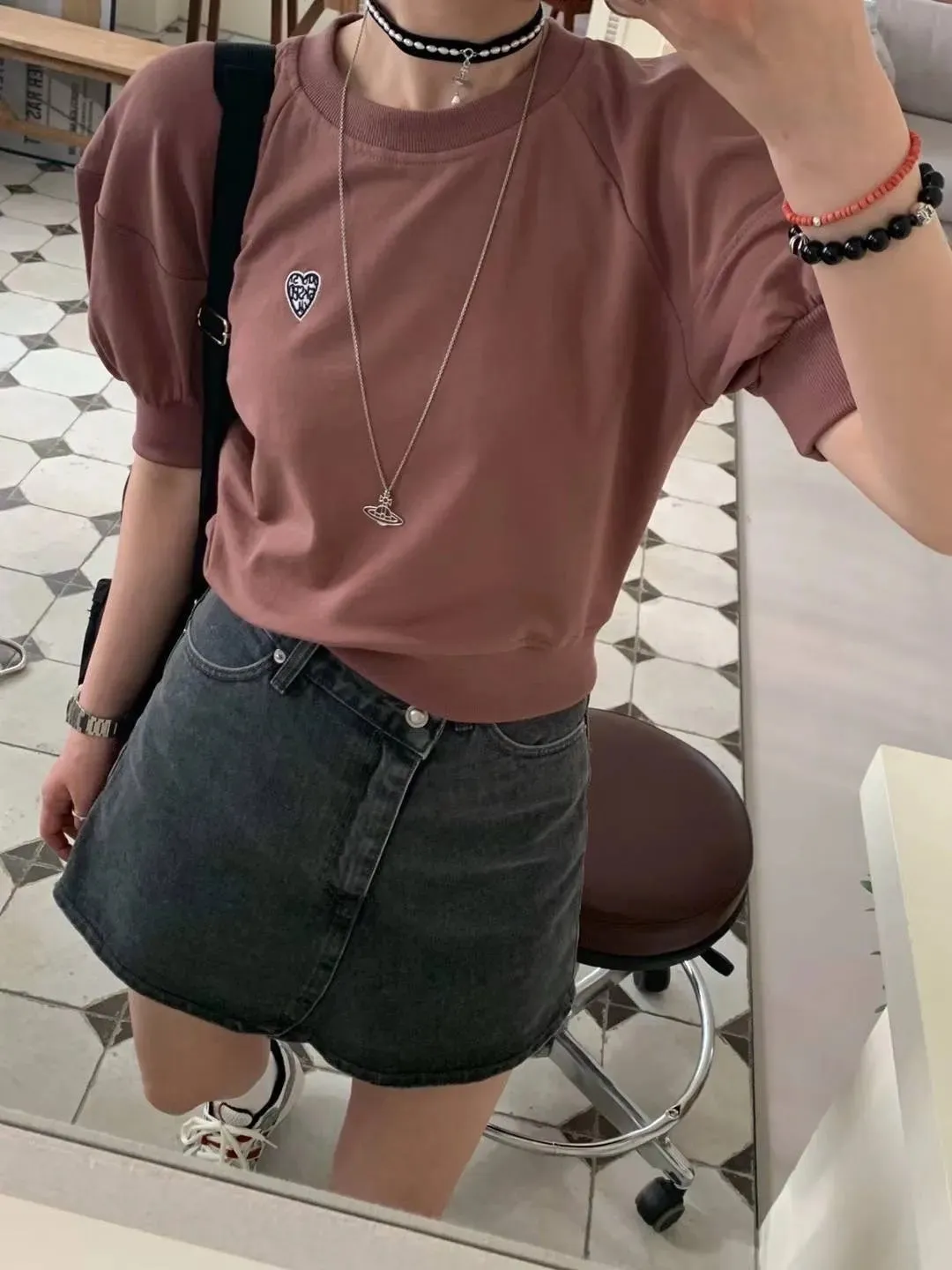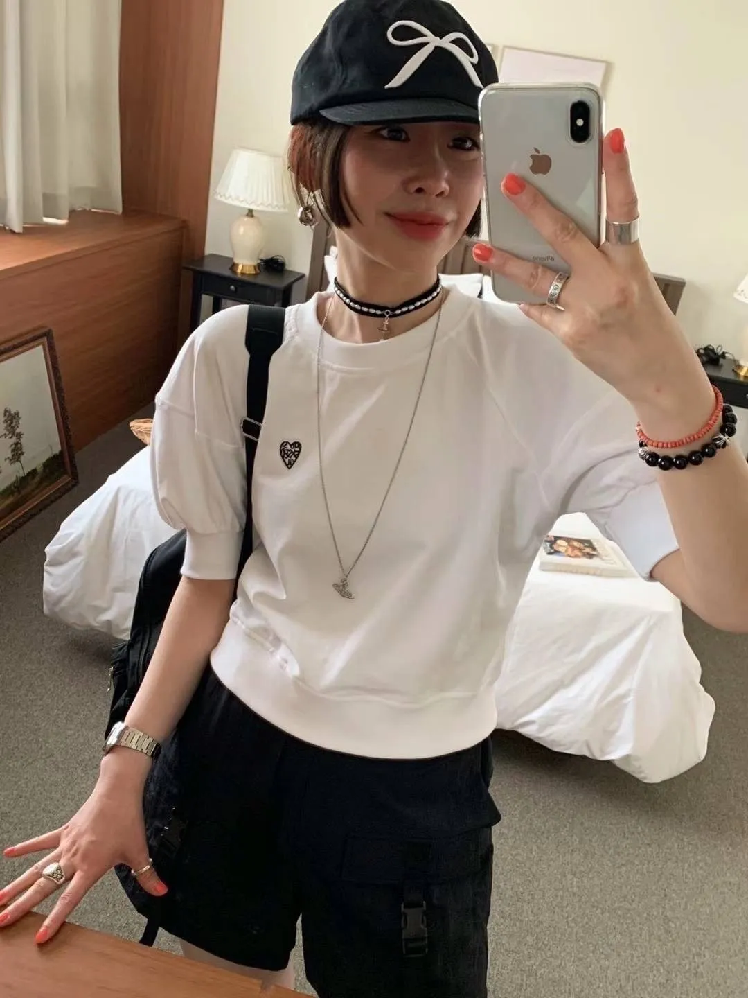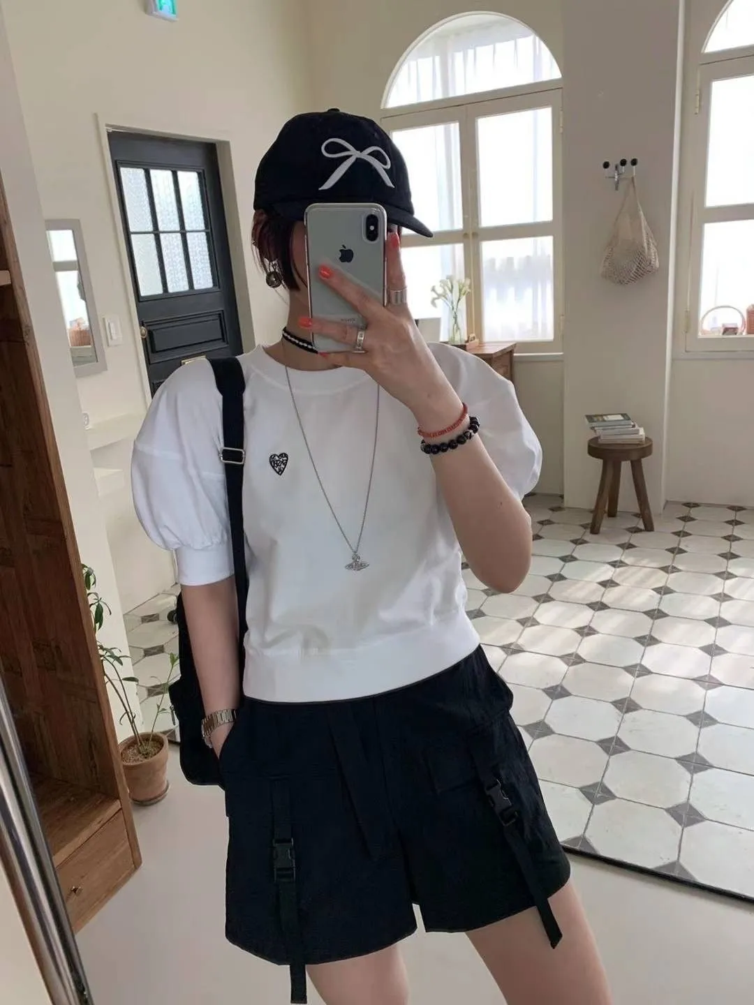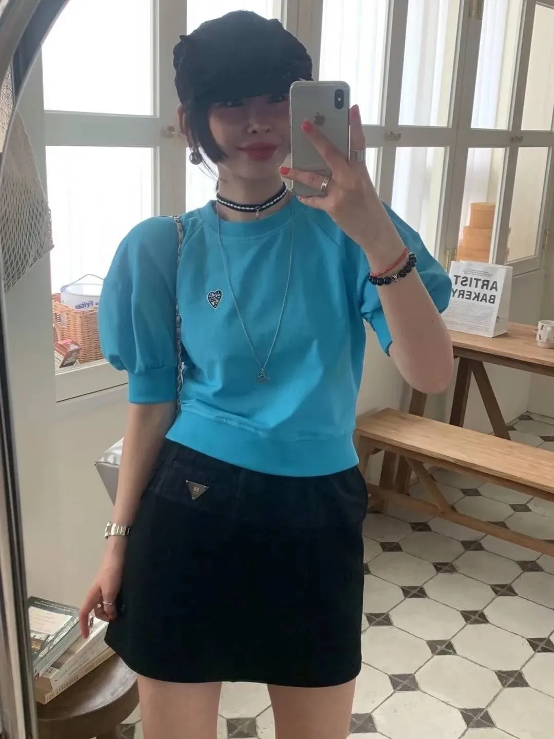 棉 薄款 下擺鬆緊 可愛蓬蓬袖 短版好比例 刺繡愛心小LOGO