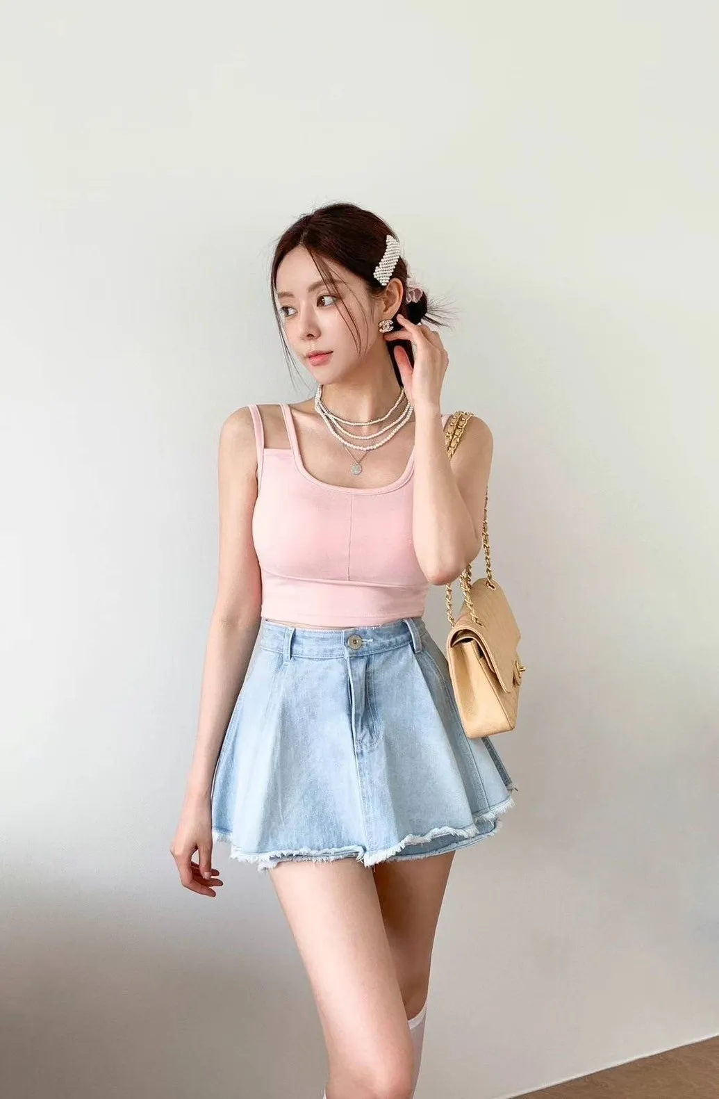 棉+彈力 淺藍刷色 釦鍊穿脫 是褲裙唷 Aline顯瘦