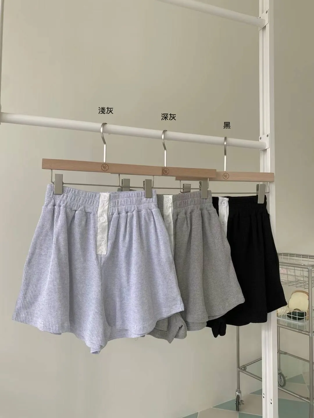 棉 華夫格紋 全腰鬆緊 裝飾釦 有口袋 適合夏天