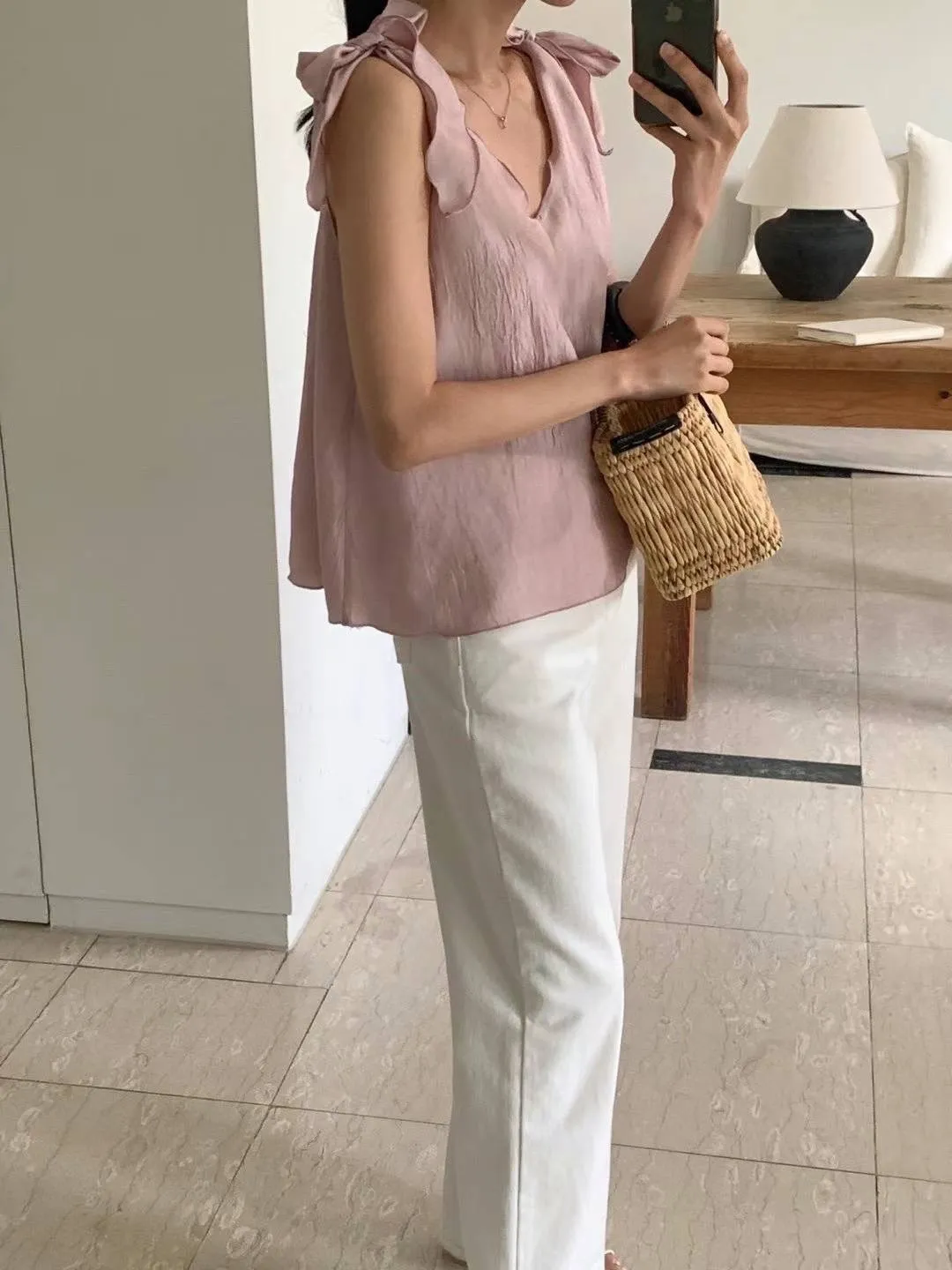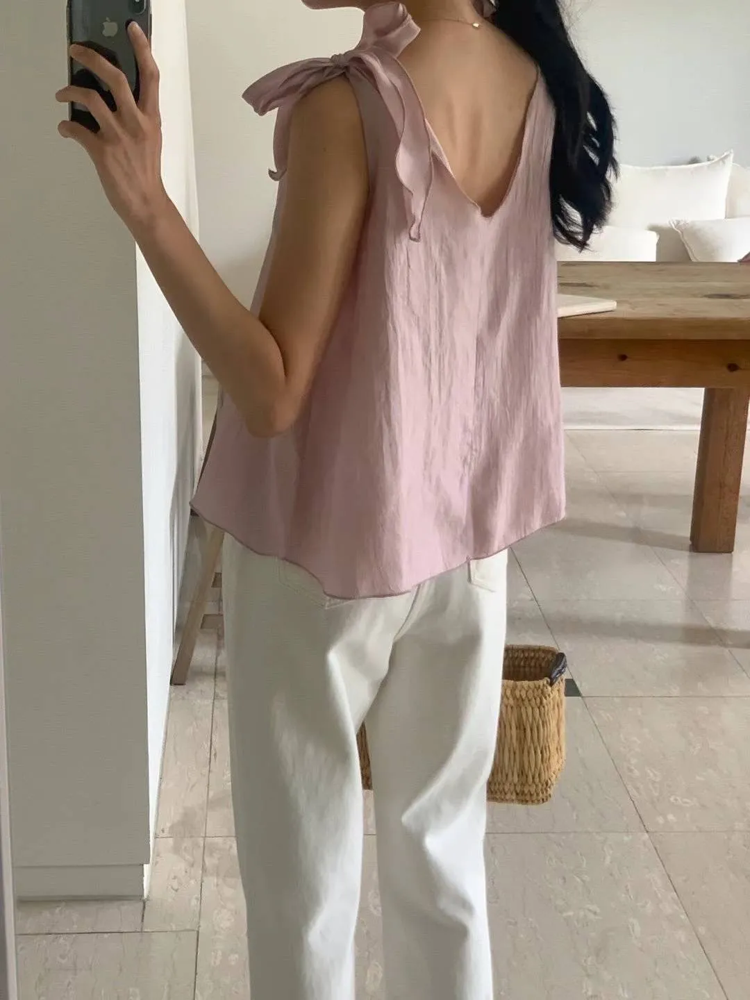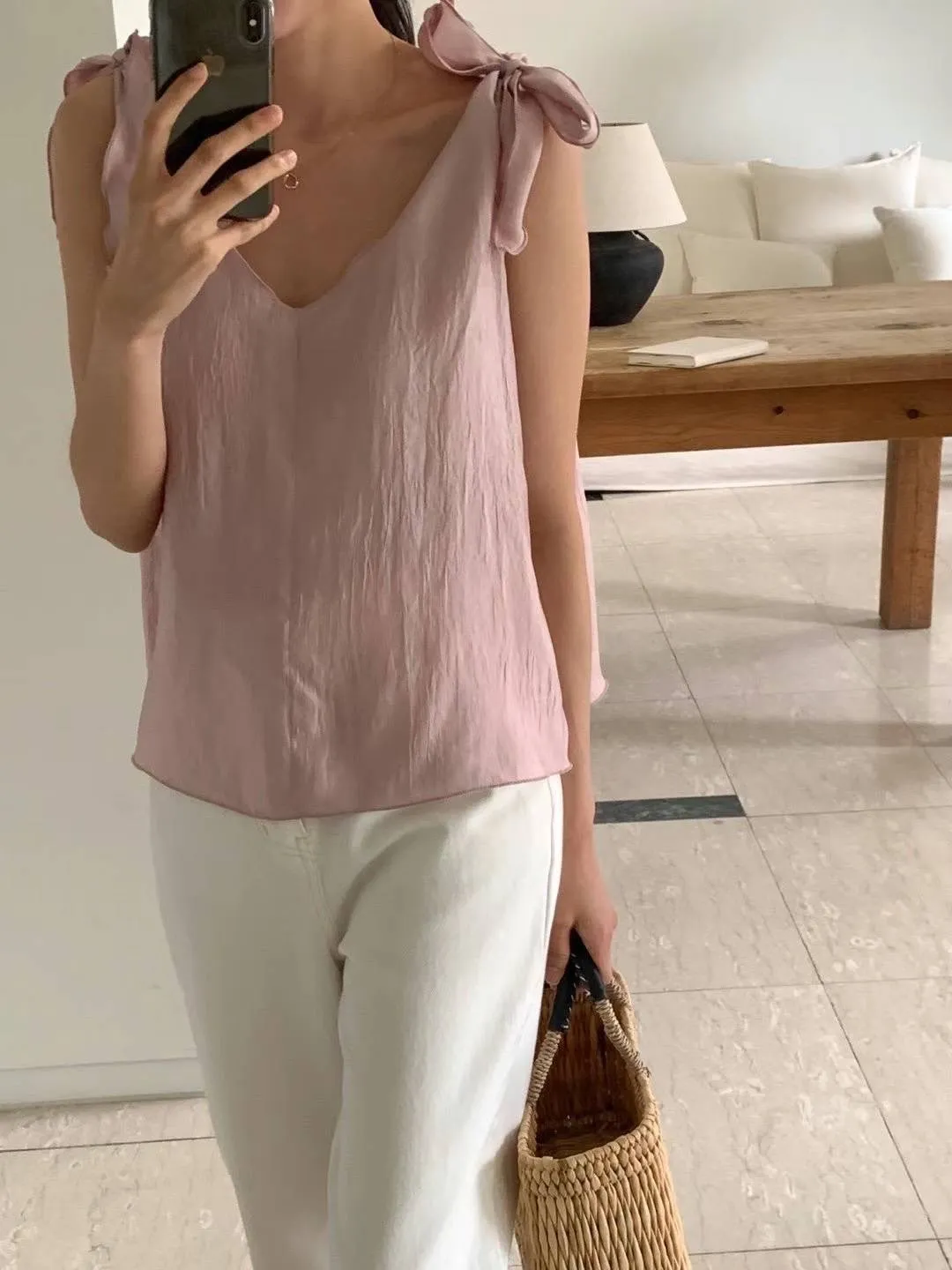 聚酯 輕盈薄款 蝴蝶結肩綁帶 微光澤面料 V領顯瘦 百搭純色