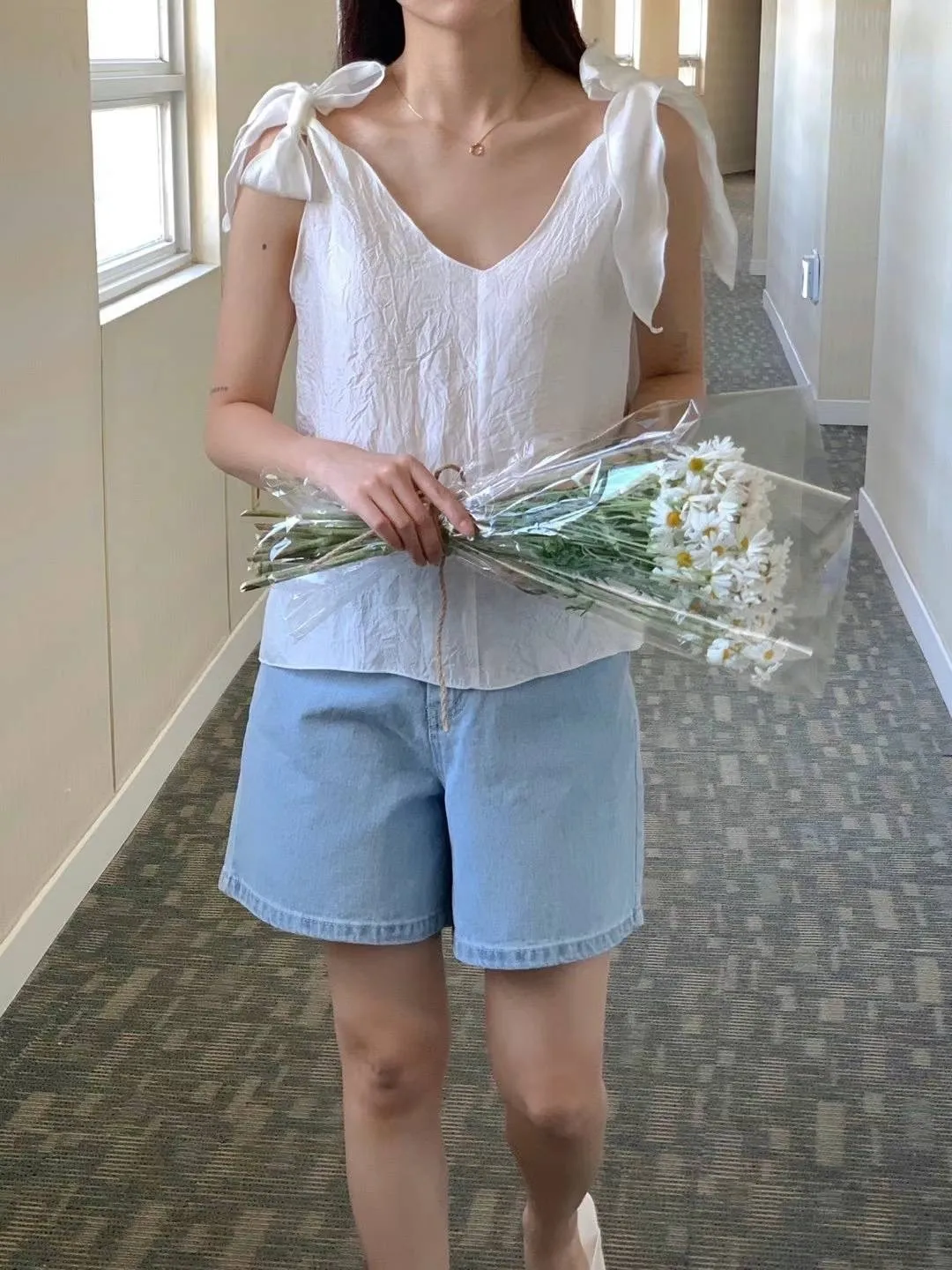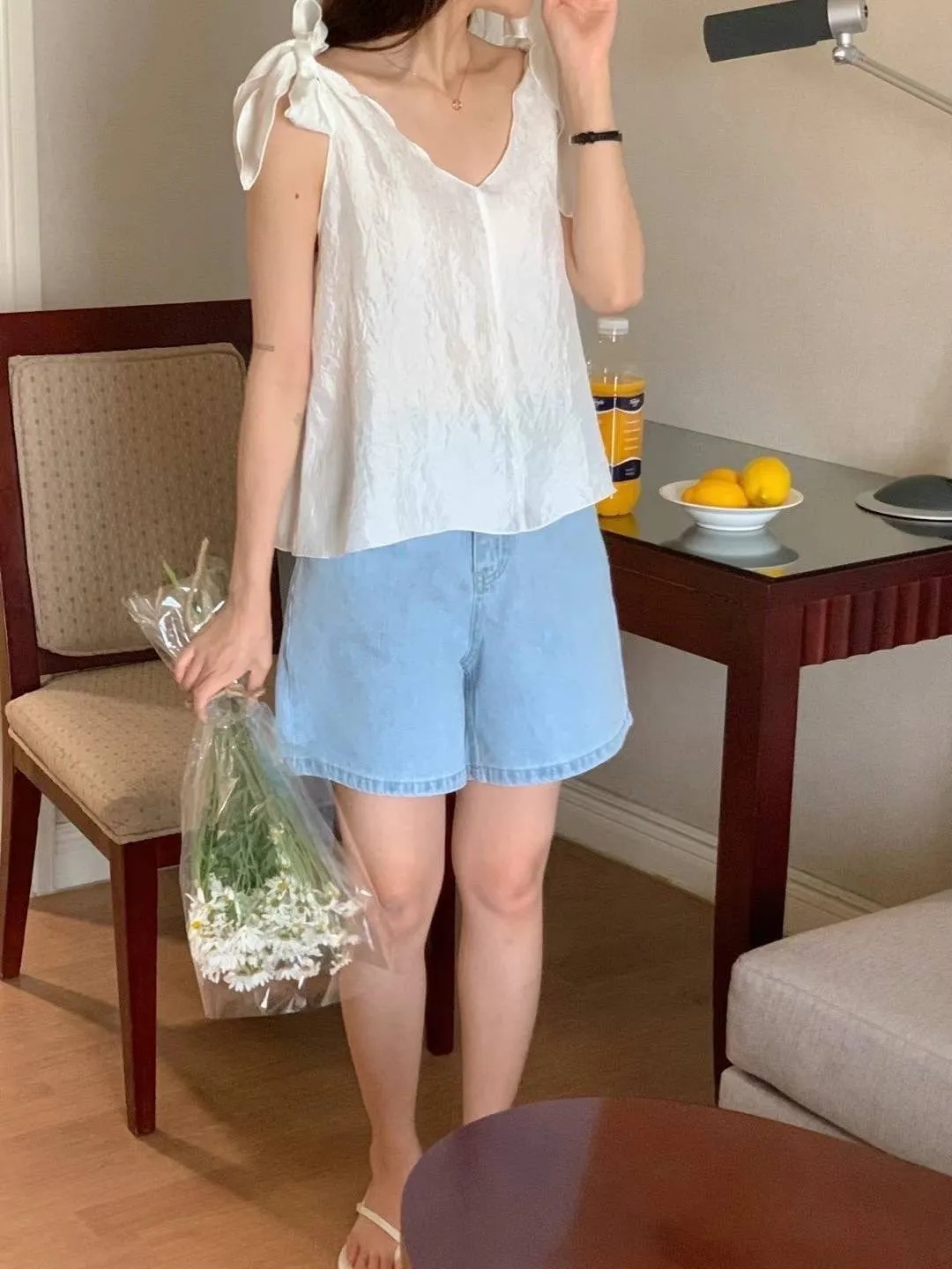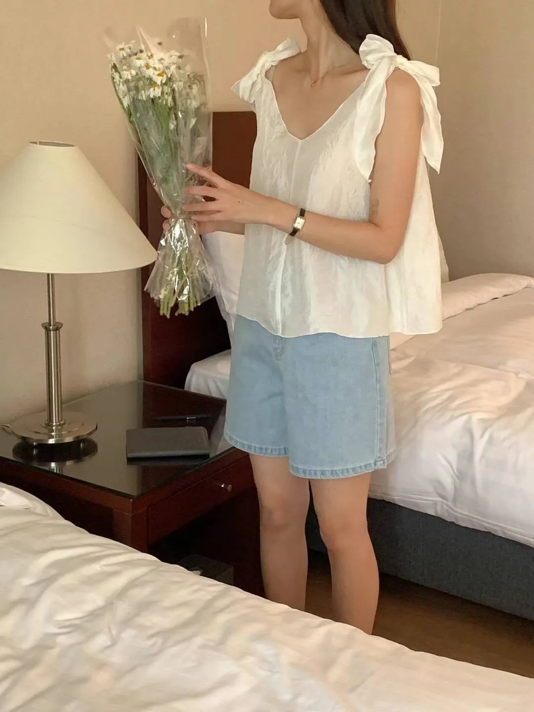 聚酯 輕盈薄款 蝴蝶結肩綁帶 微光澤面料 V領顯瘦 百搭純色
