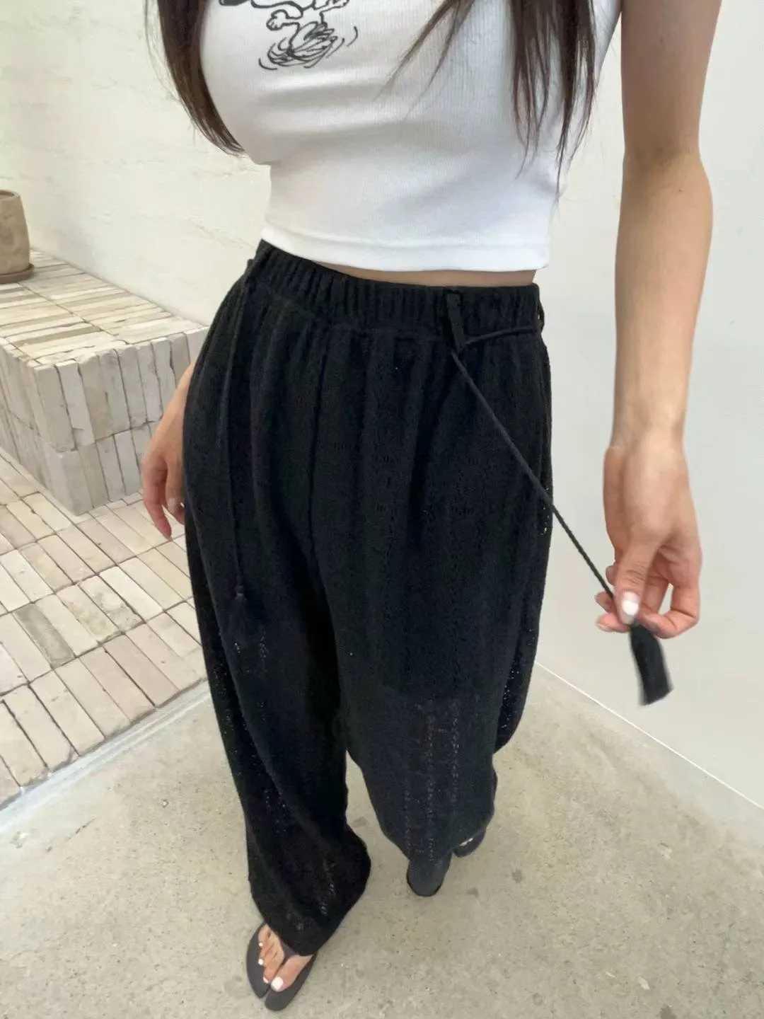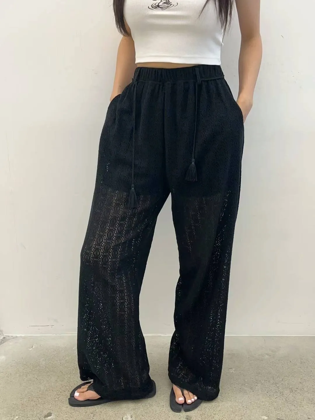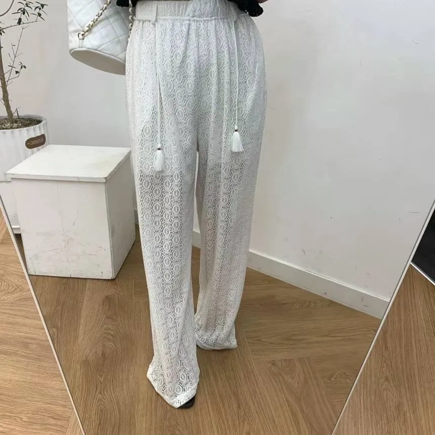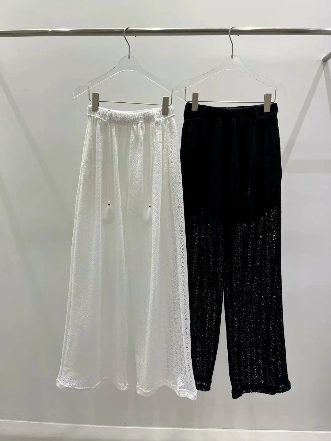 AA524新款簍空透光流蘇抽繩長褲 白 黑 官網價$1220 線上價$1190