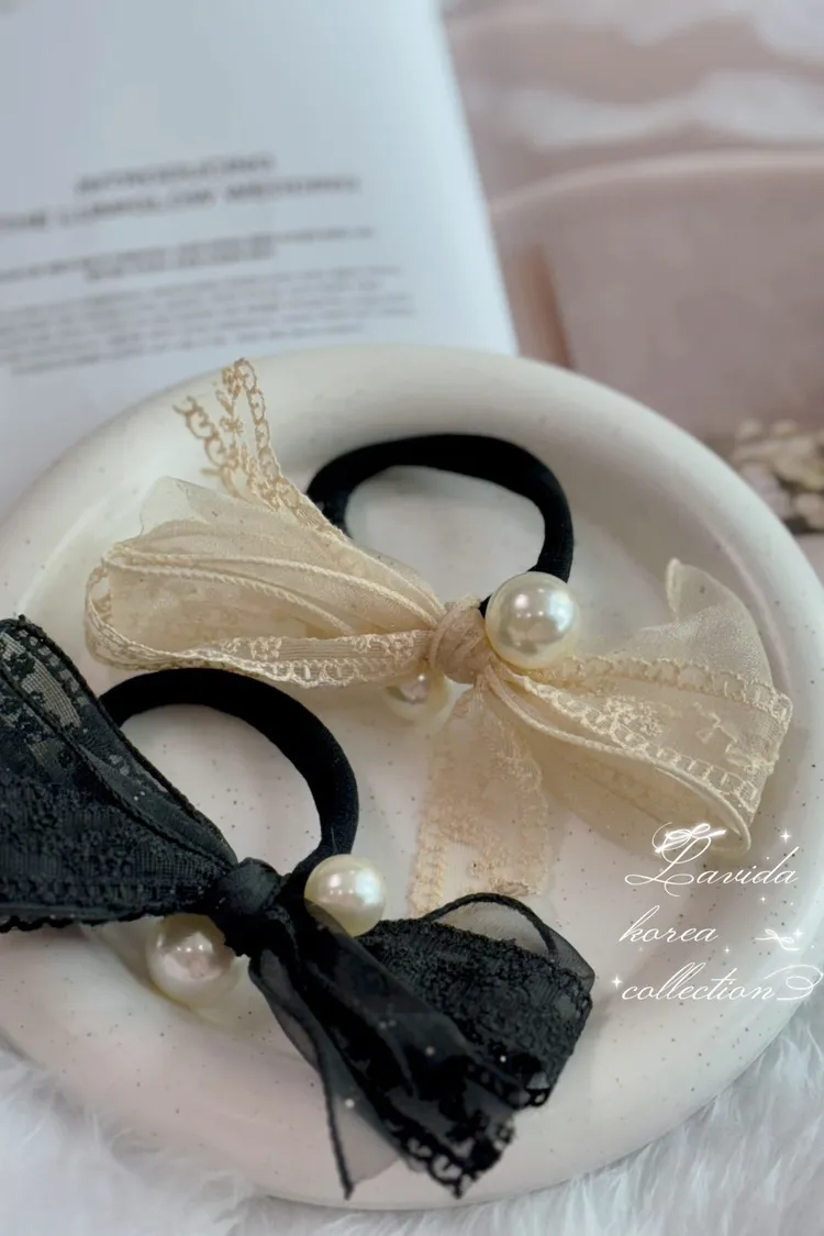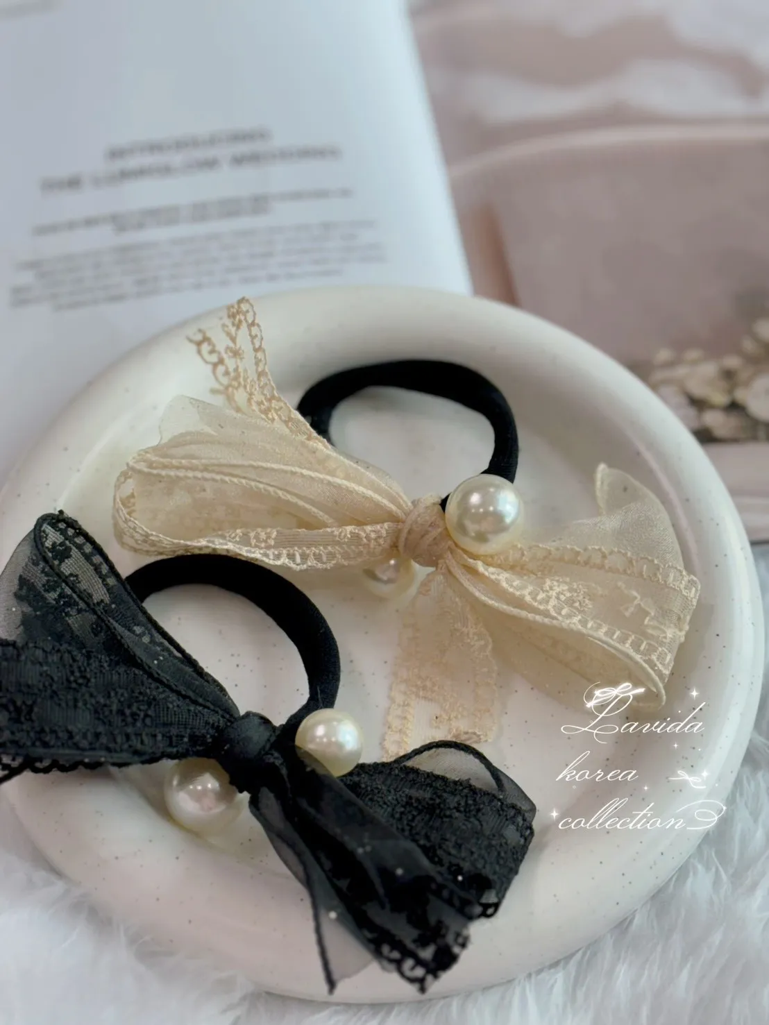 AF198鑲花蕾絲緞帶歐根紗珍珠髮圈 米 黑 官網價$155 線上價$125