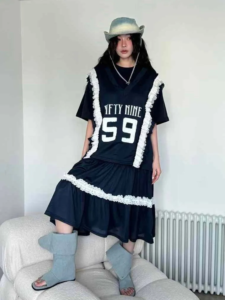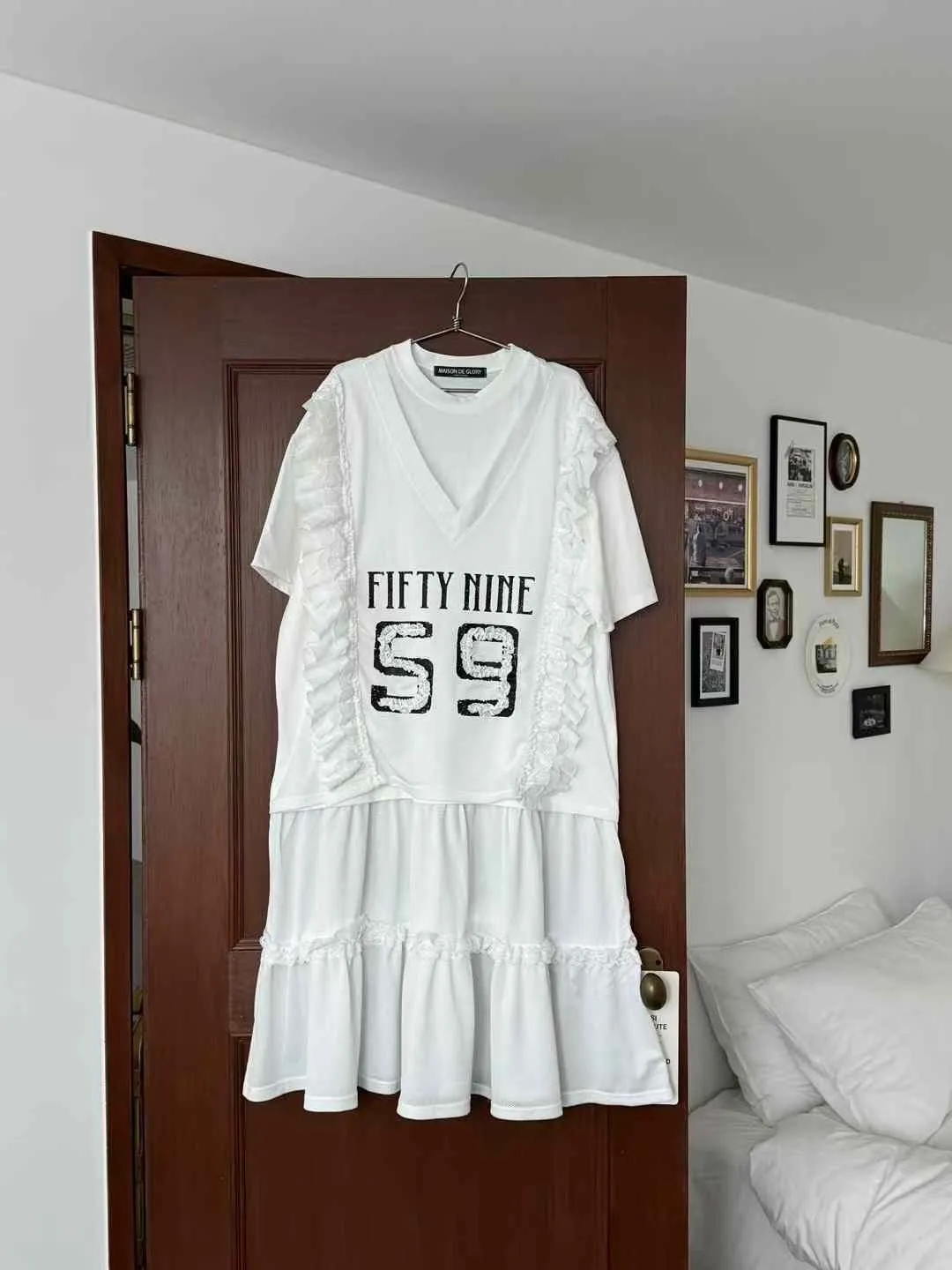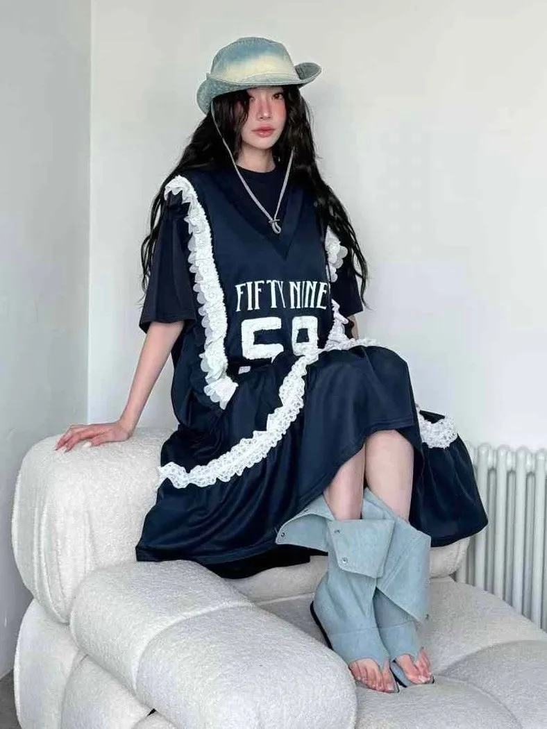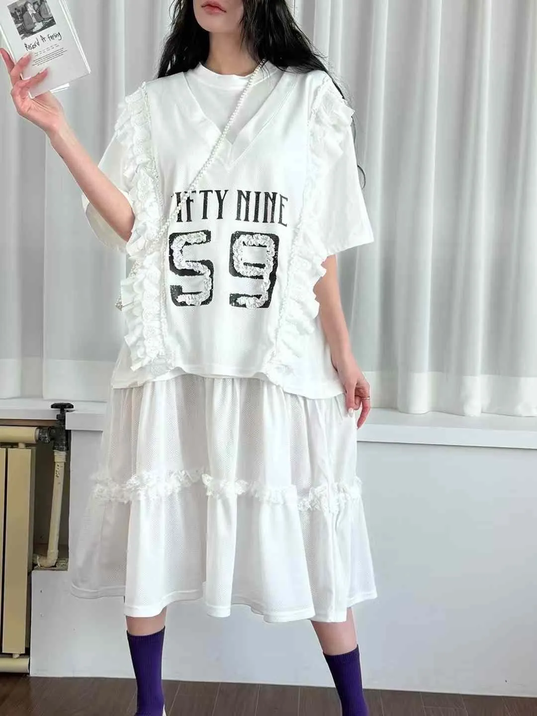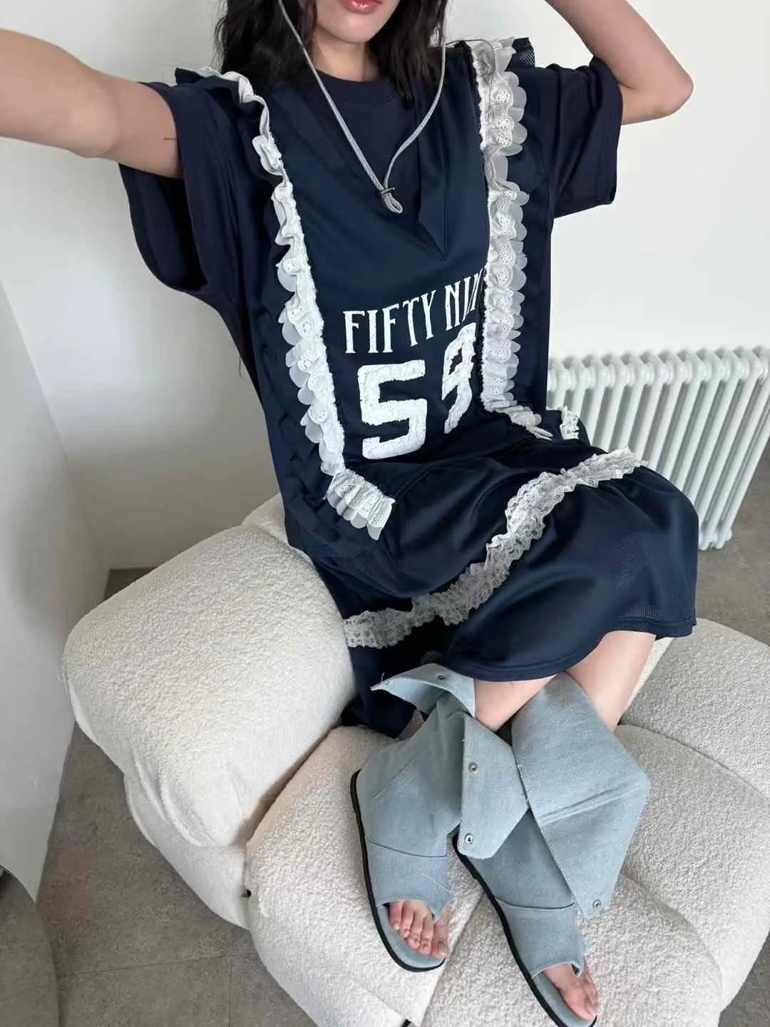 棉 薄款舒適 假兩件拼接 運動風 蕾絲鑲嵌 立體59數字 XXL友善