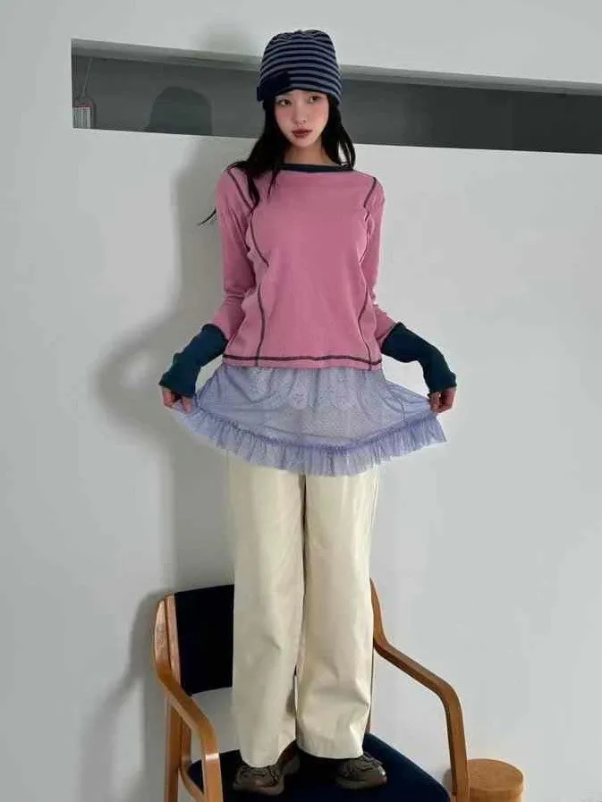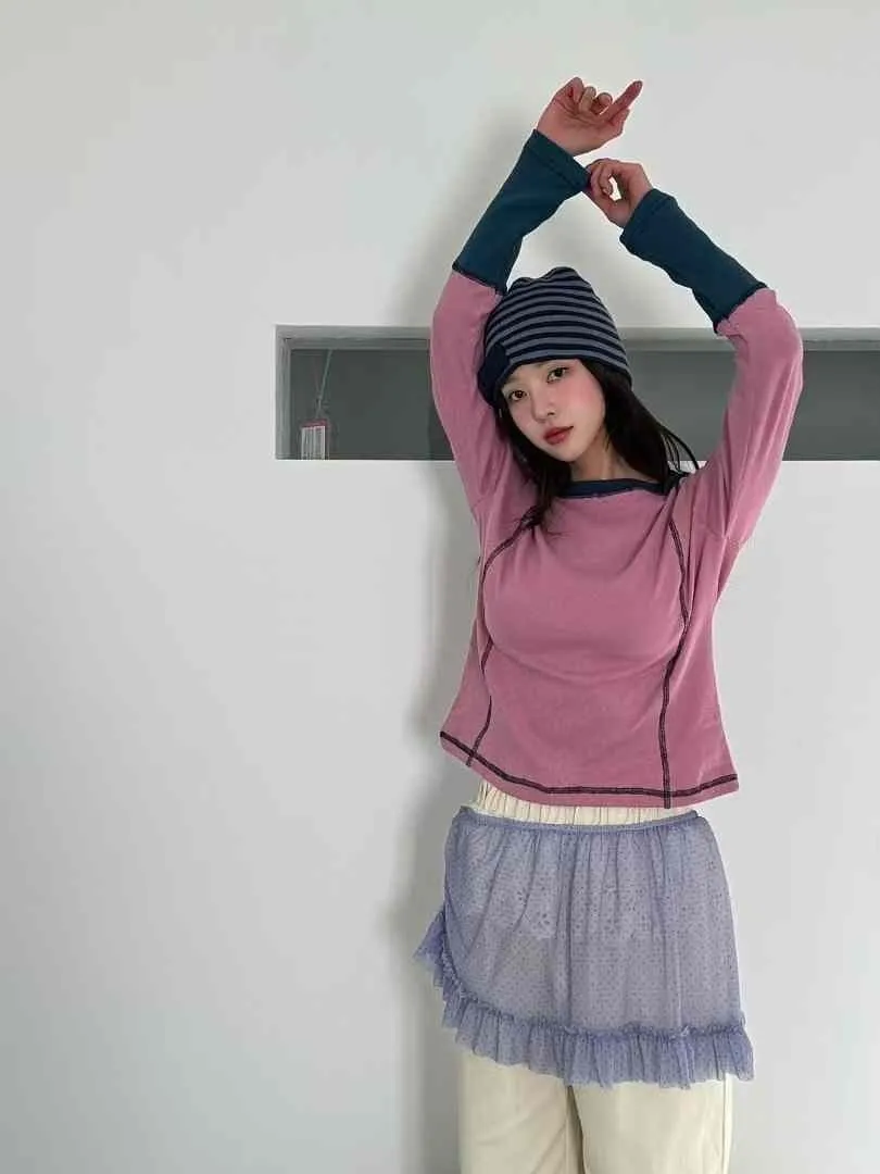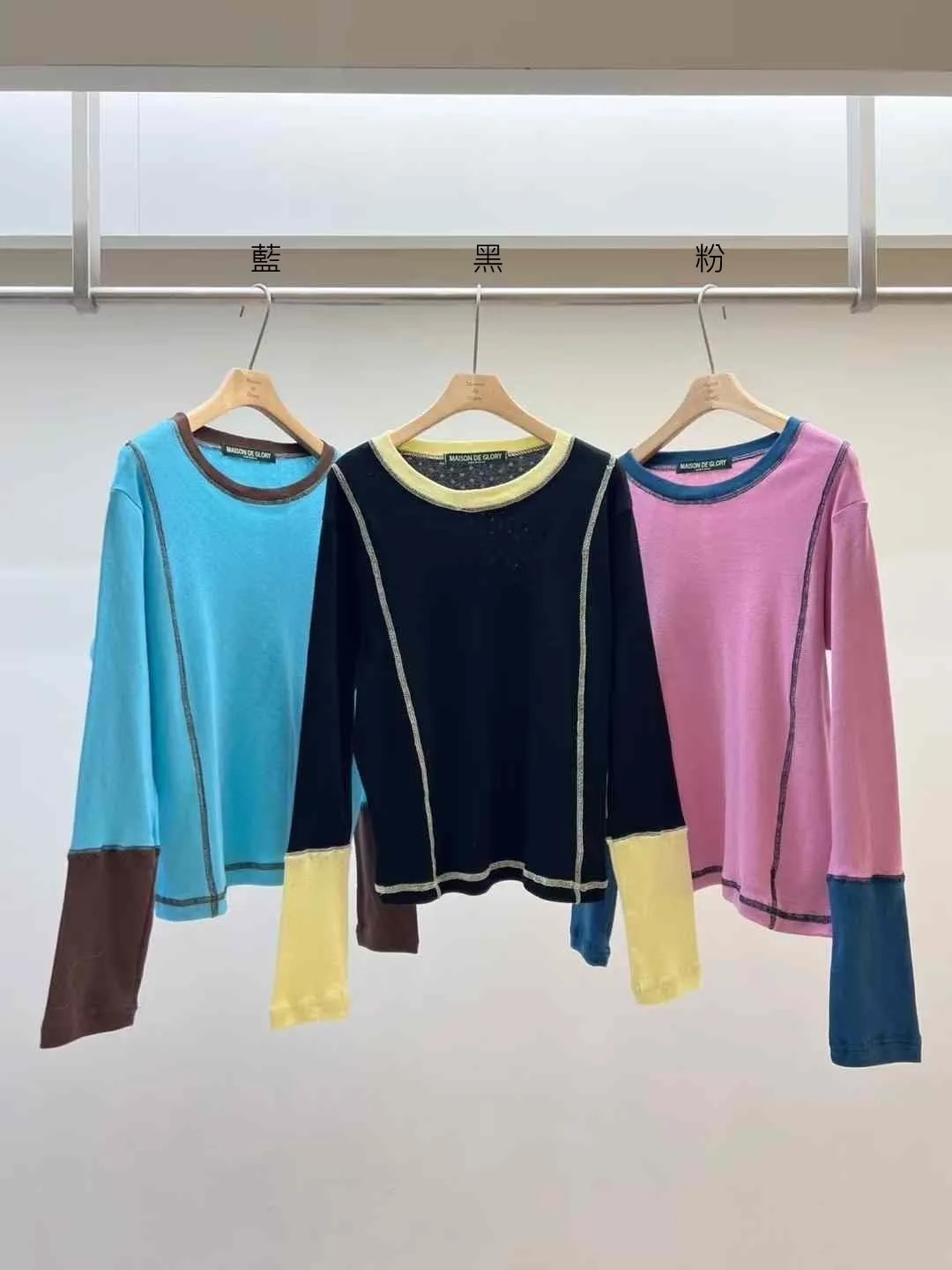 AK426跳色車線手接拼接上衣 粉 藍 黑 官網價$699 線上價$669