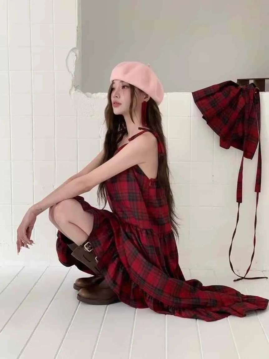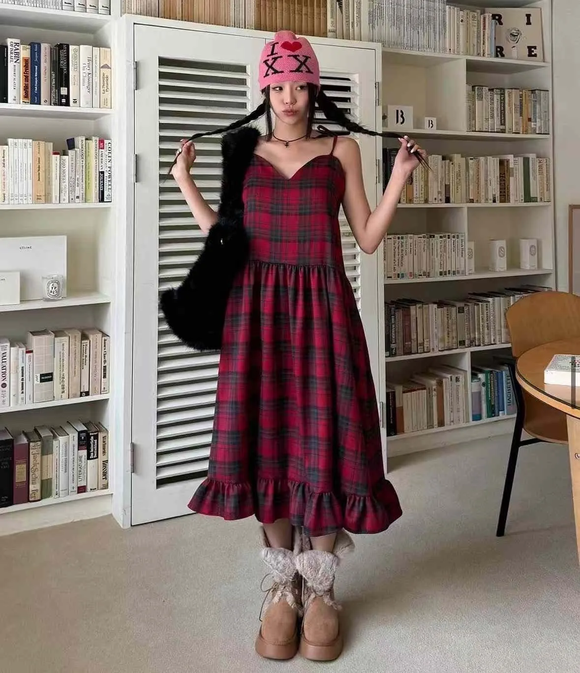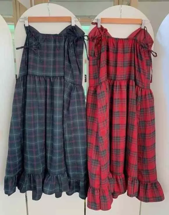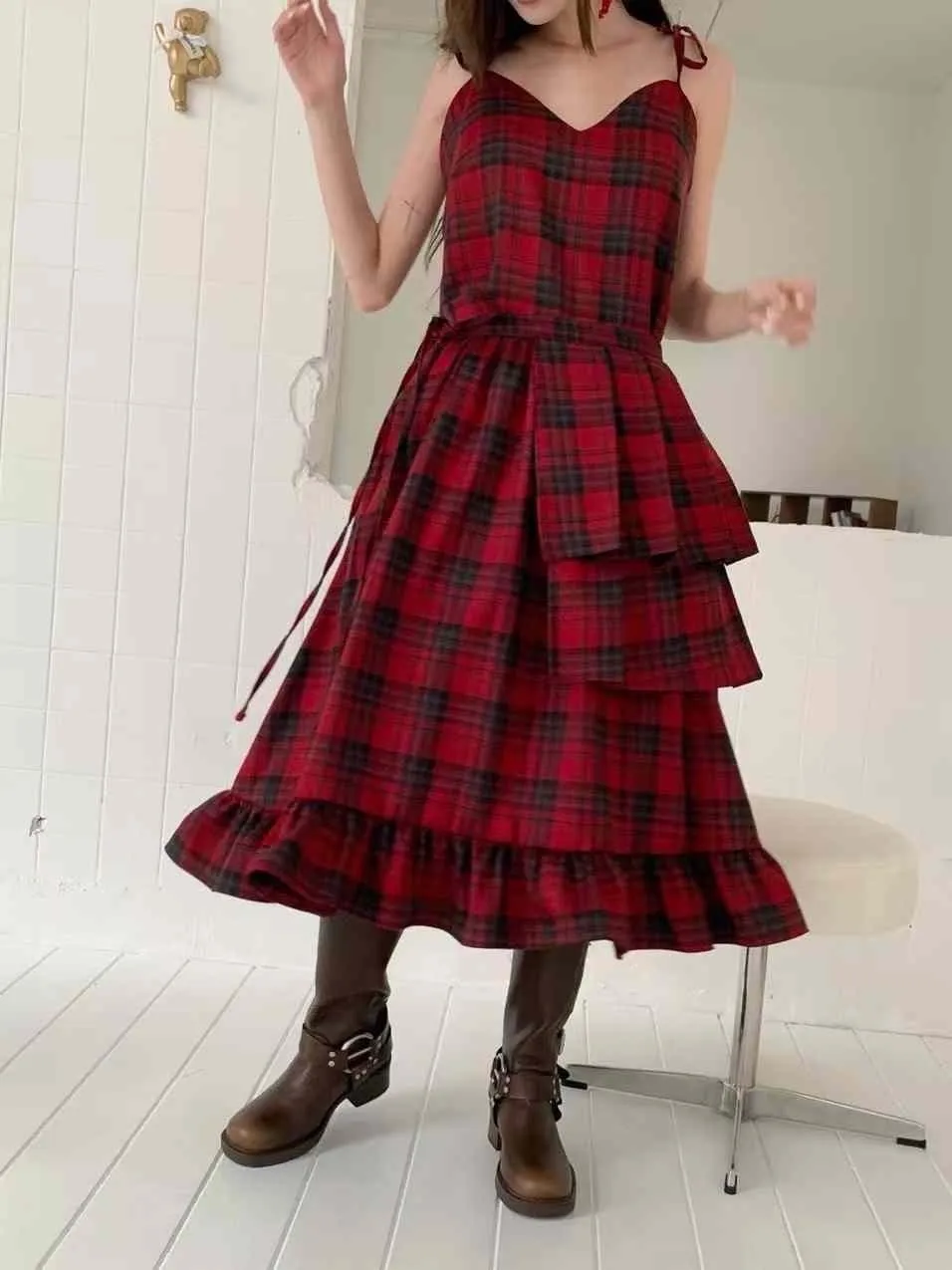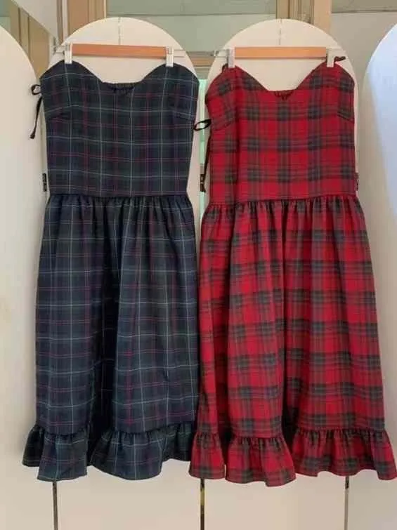 AK428套裝的細肩帶桃心領格紋洋裝 紅 灰 官網價$1780 線上價$1750