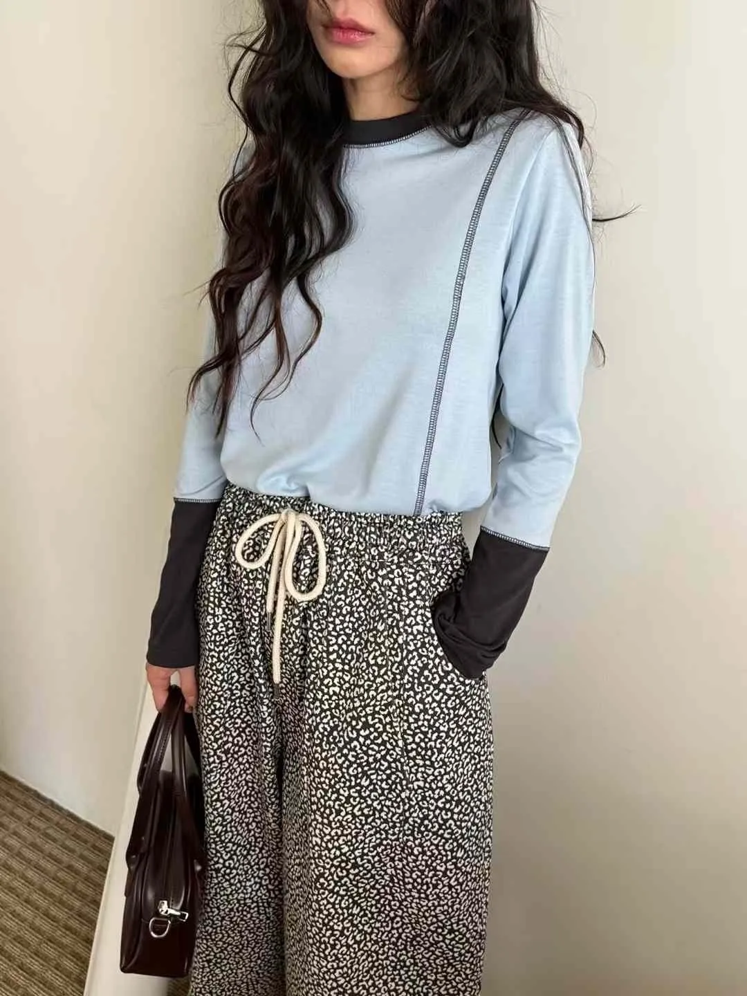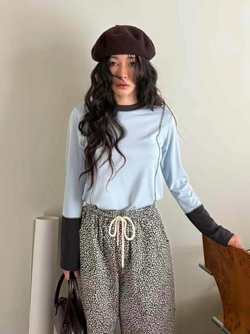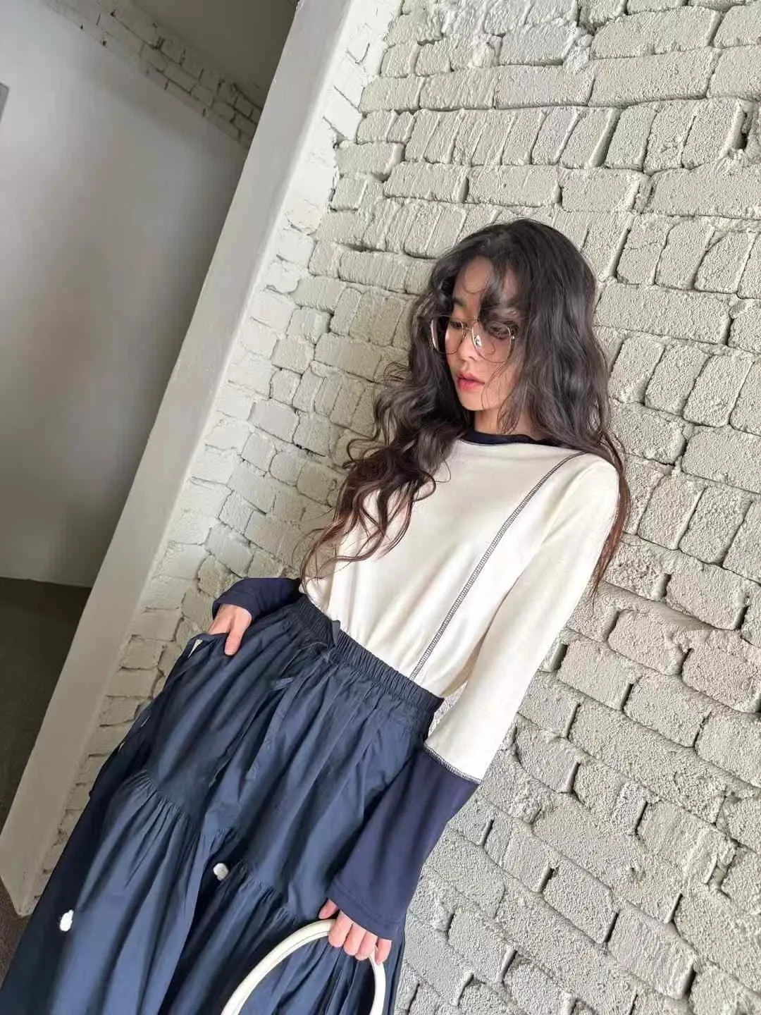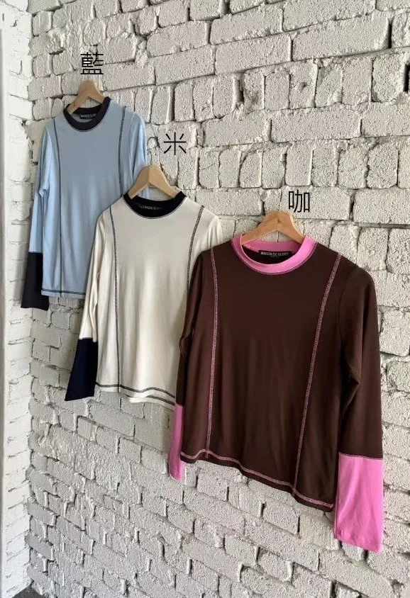 AK439車線外翻設計跳色手袖上衣 米 咖 藍 官網價$670 線上價$640