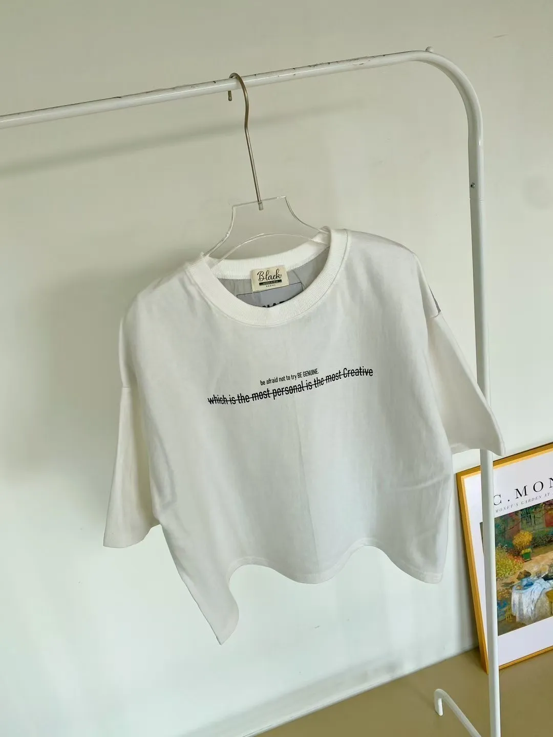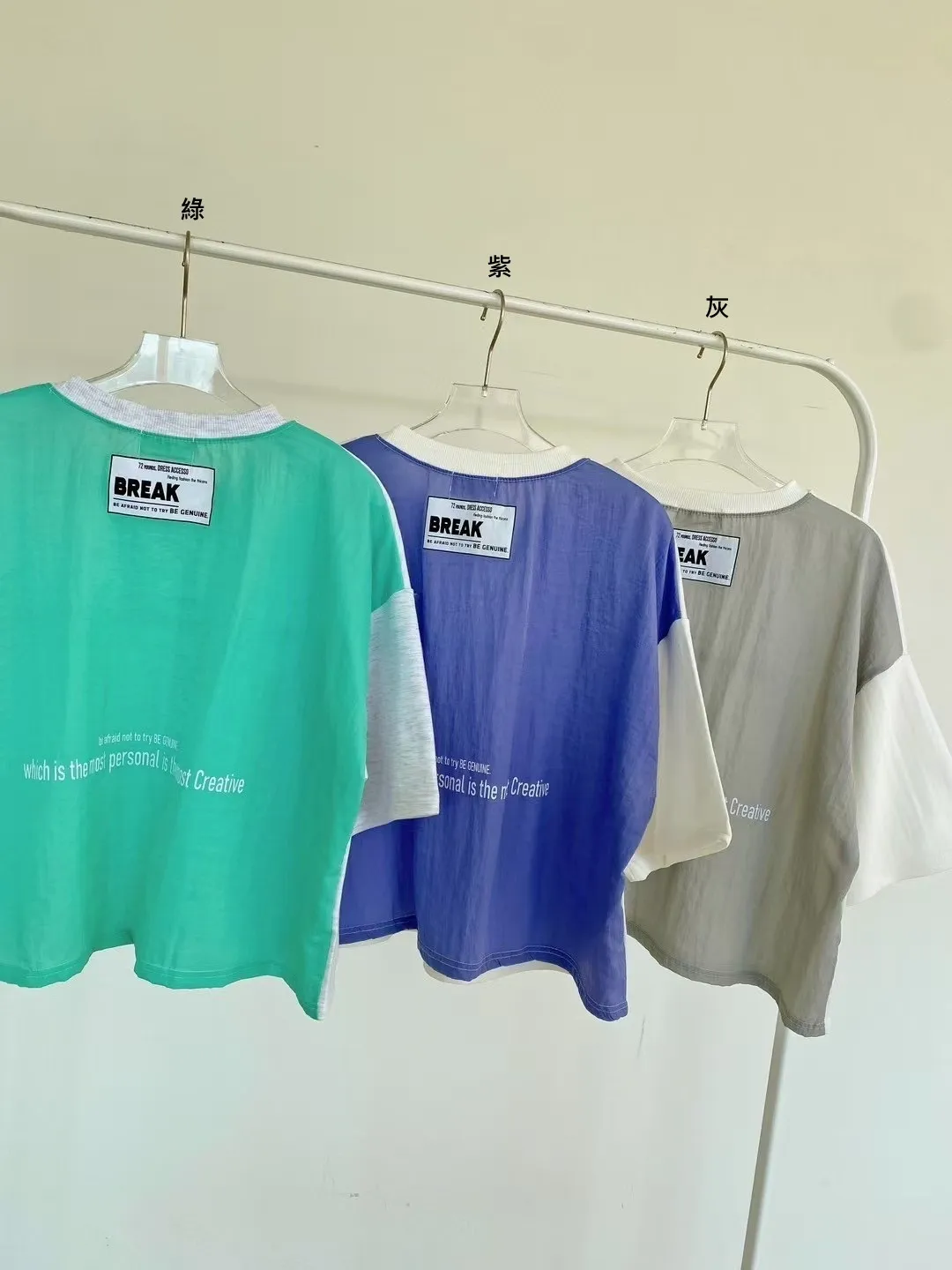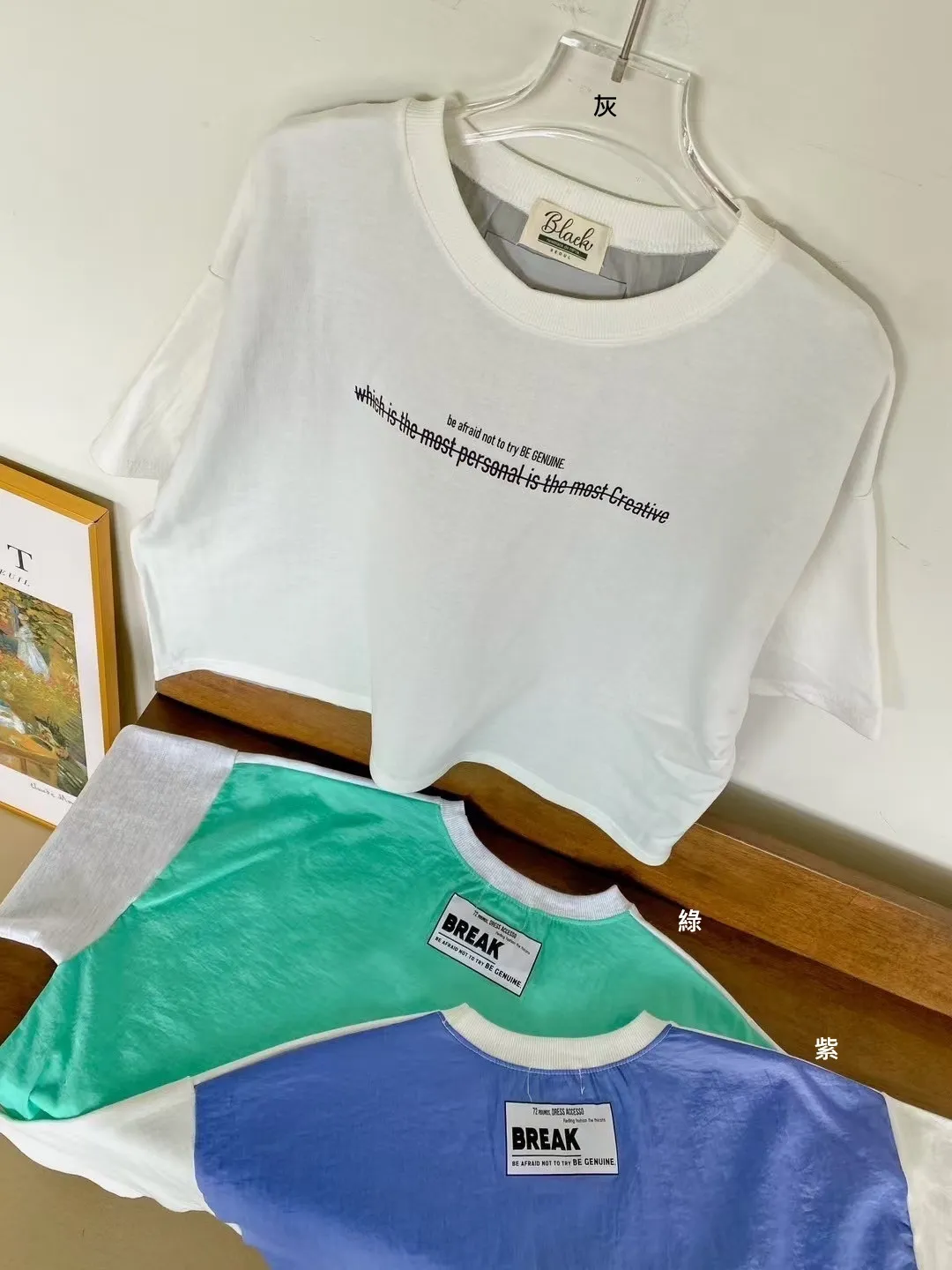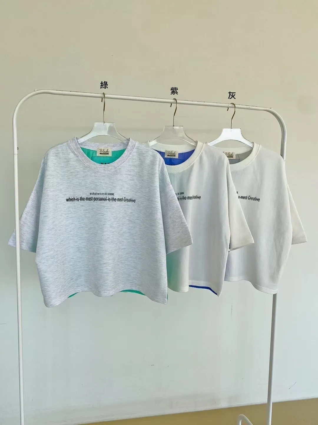 棉前+聚酯背後 異材質拼接 短版好比例 可愛英文刪除線