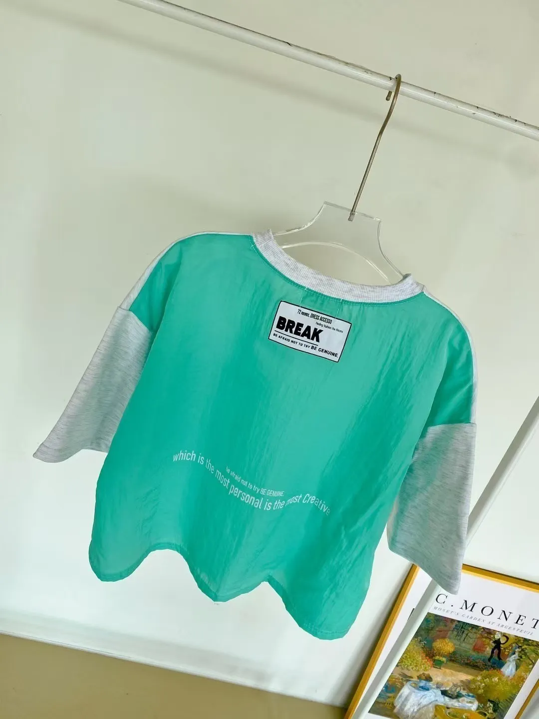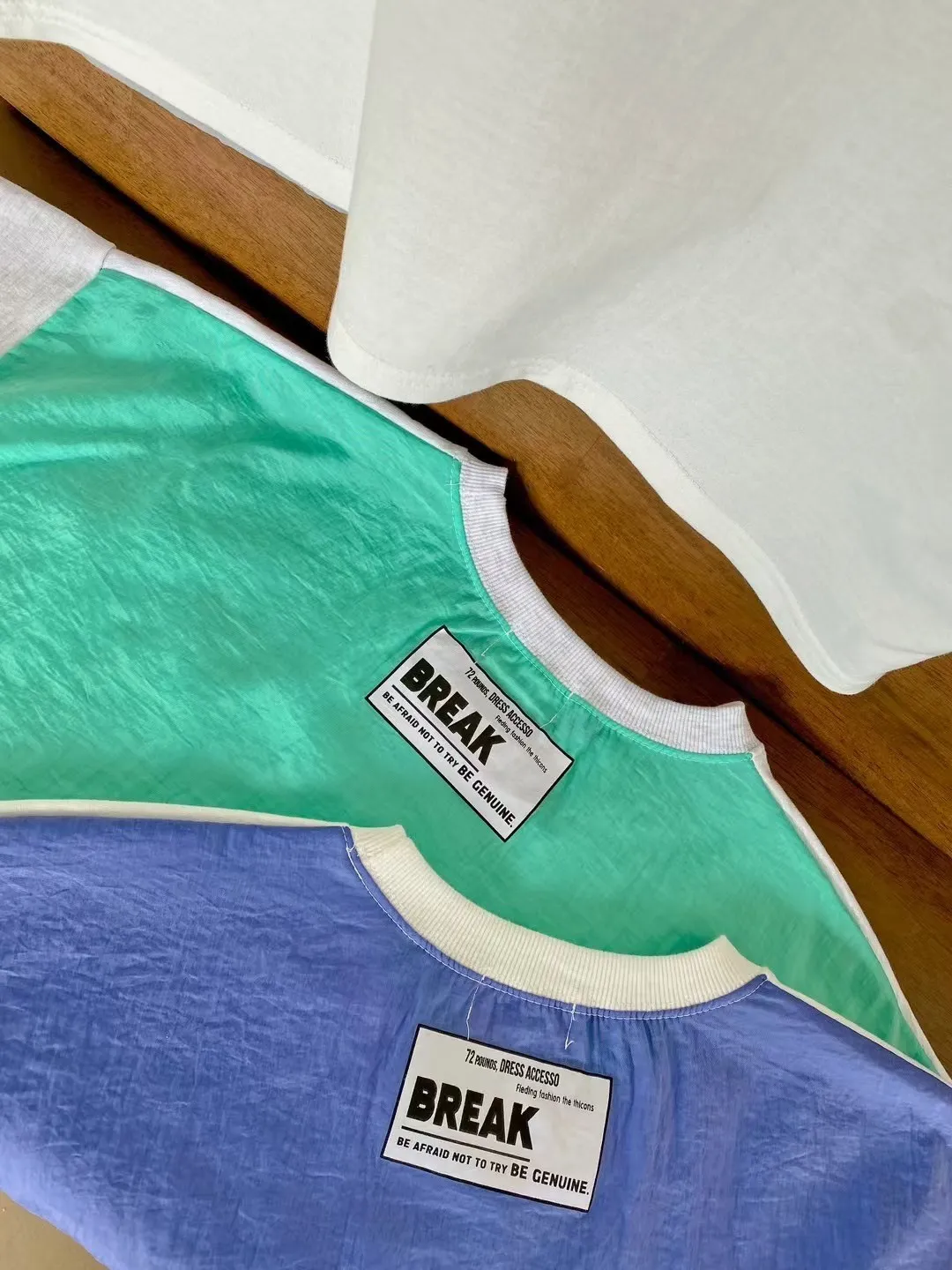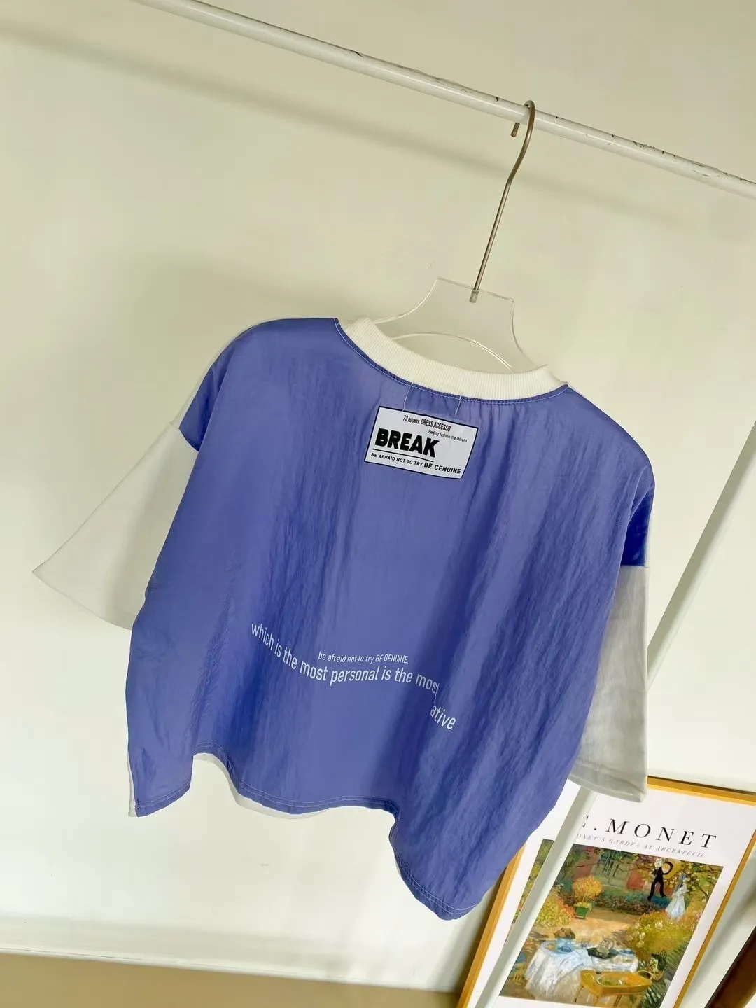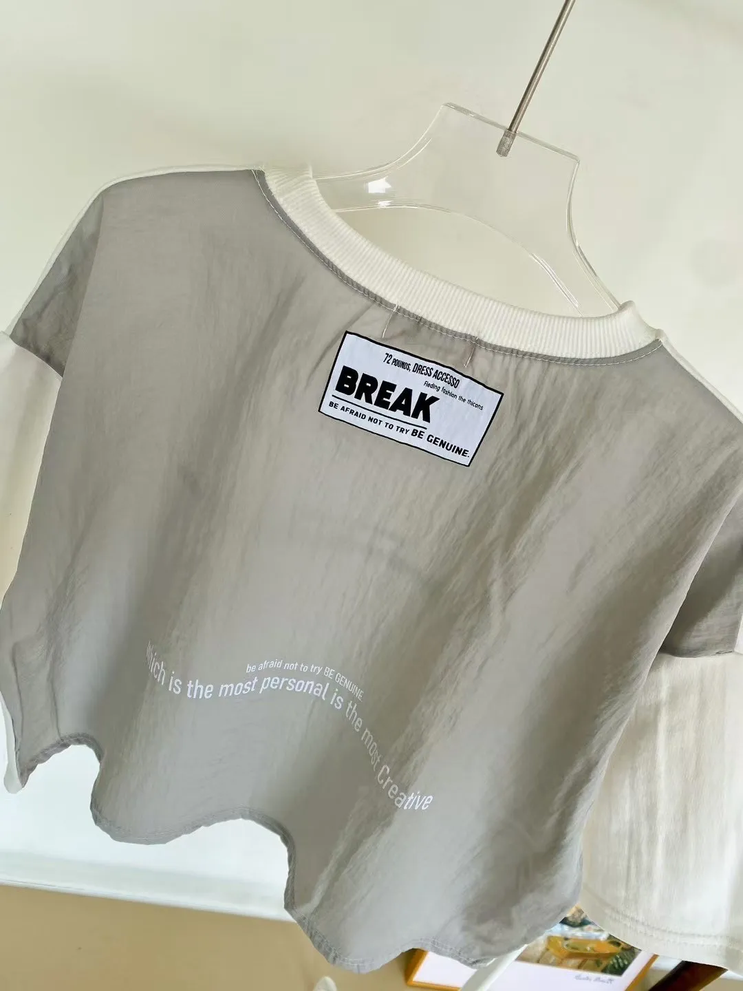 棉前+聚酯背後 異材質拼接 短版好比例 可愛英文刪除線