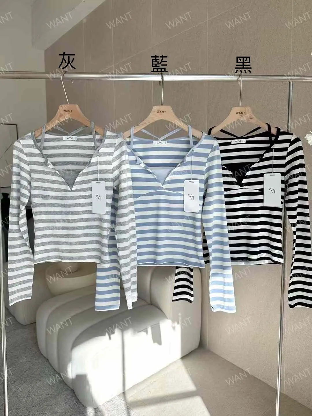 AK513開襟胸型up剪裁條紋上衣 灰 藍 黑 官網價$560 線上價$530