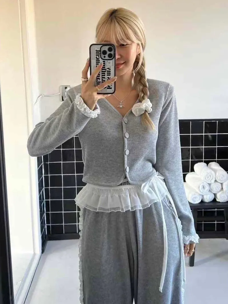 棉+聚酯 有彈性 布包釦 手袖V領蕾絲設計 短版好比例