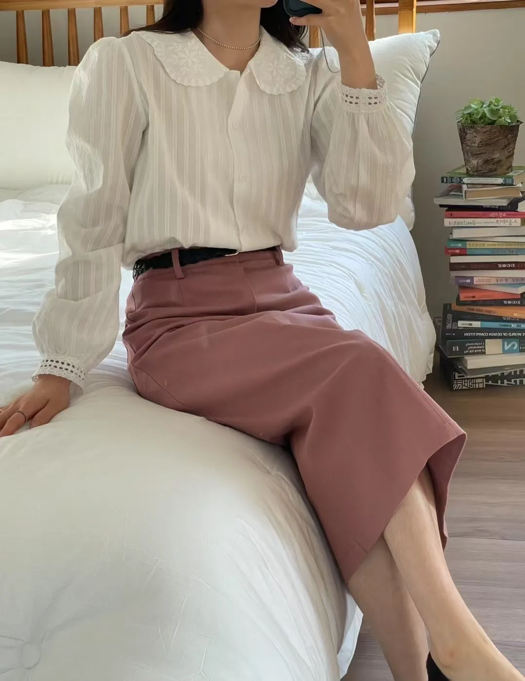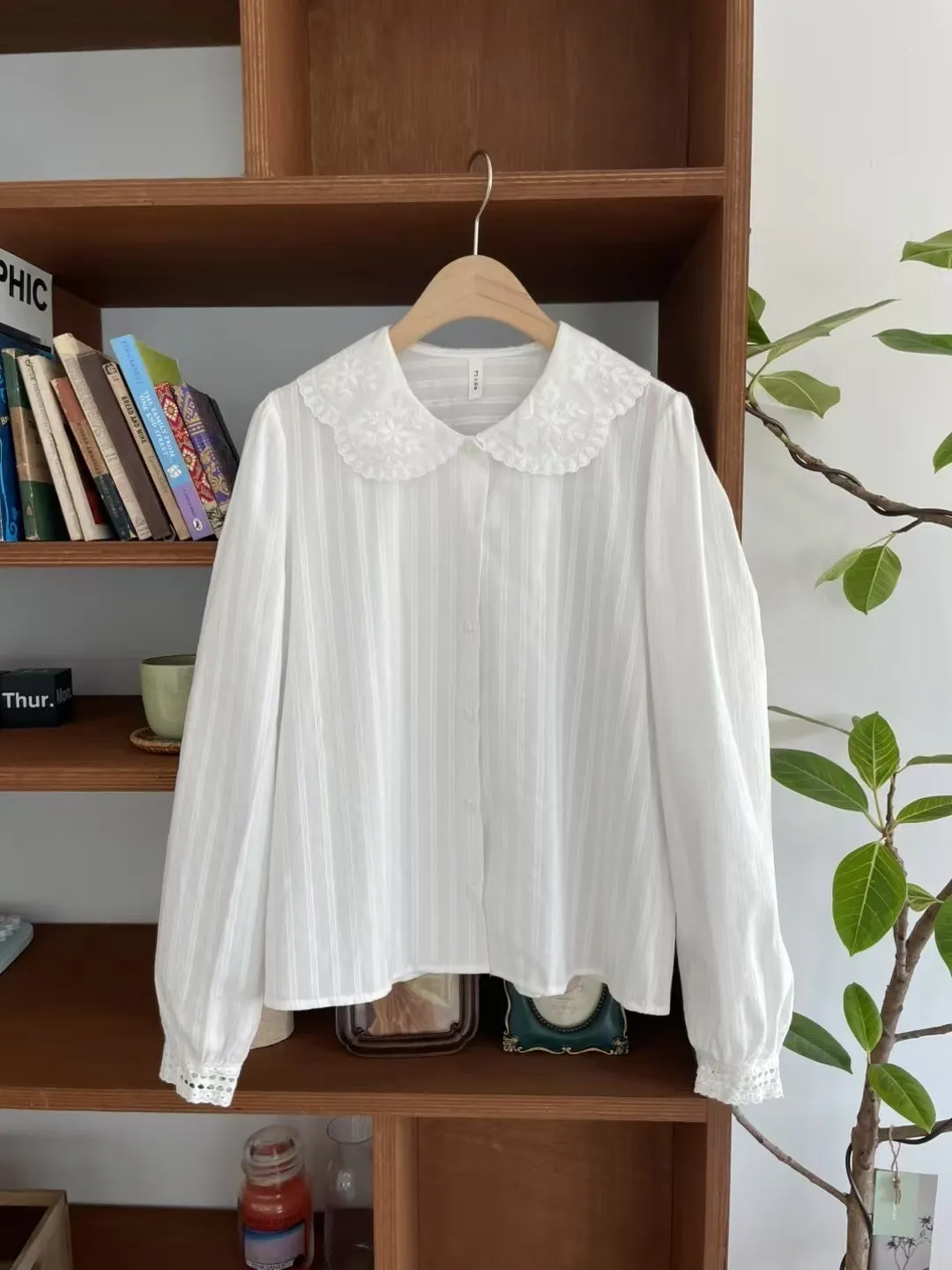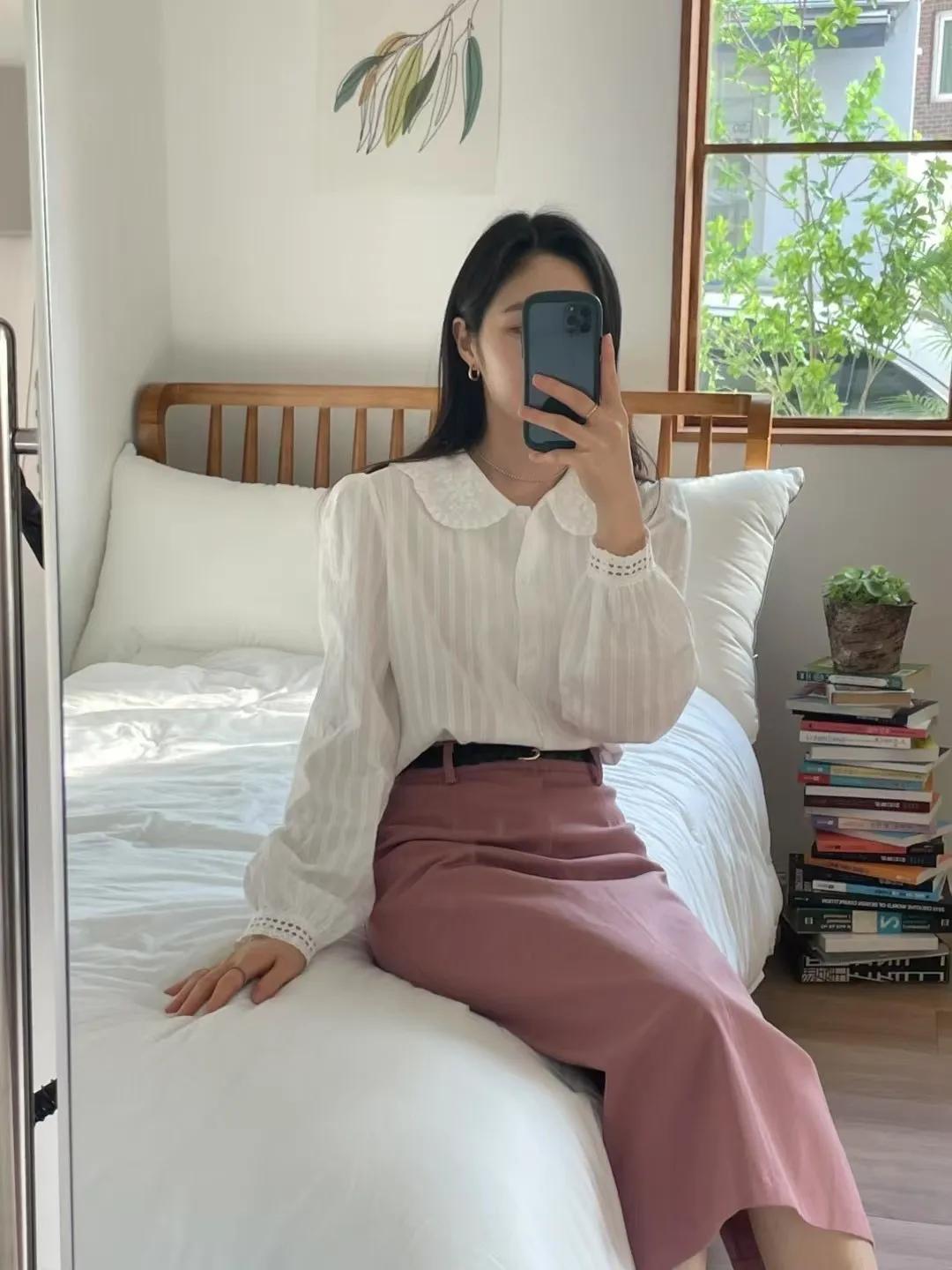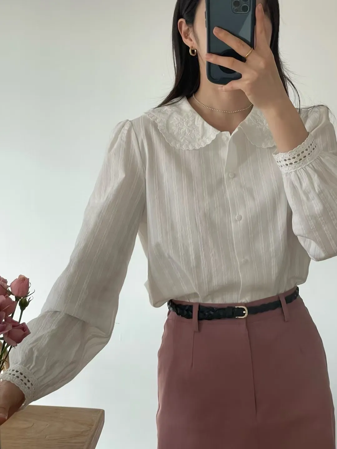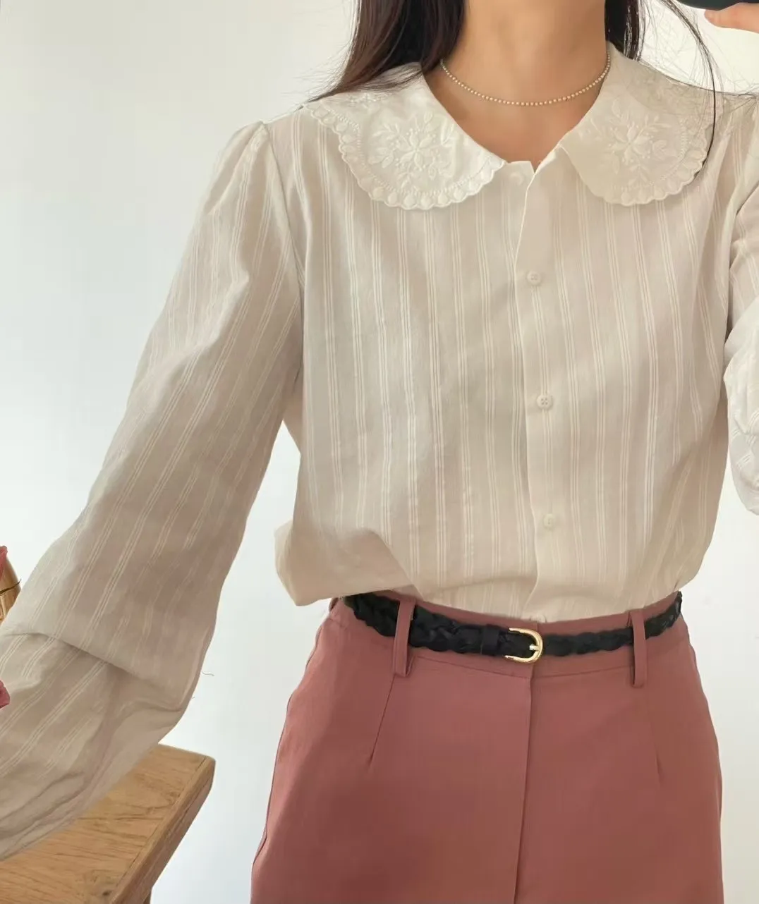 棉 透氣舒適 精緻刺繡蕾絲翻領 隱約條紋面料