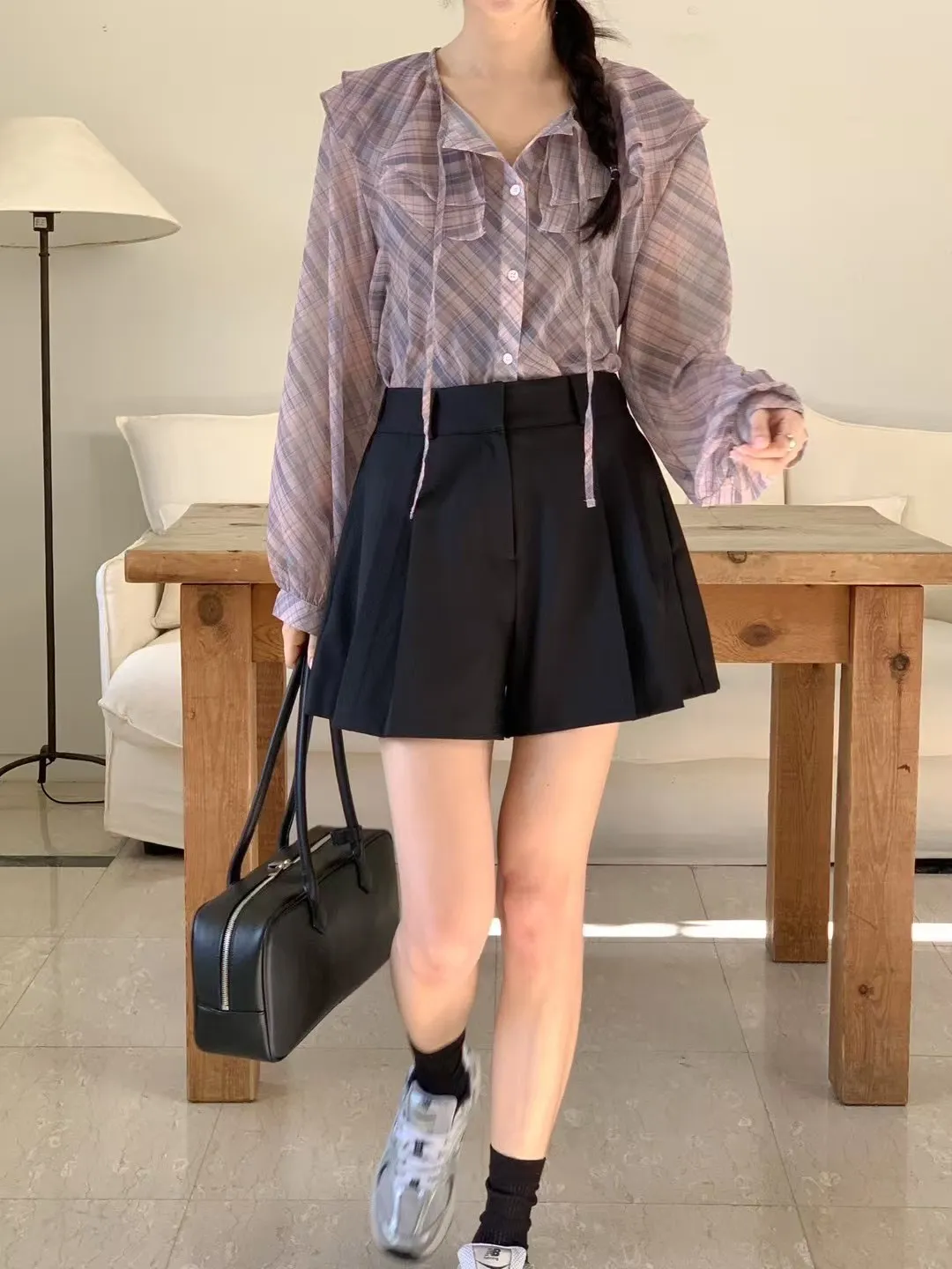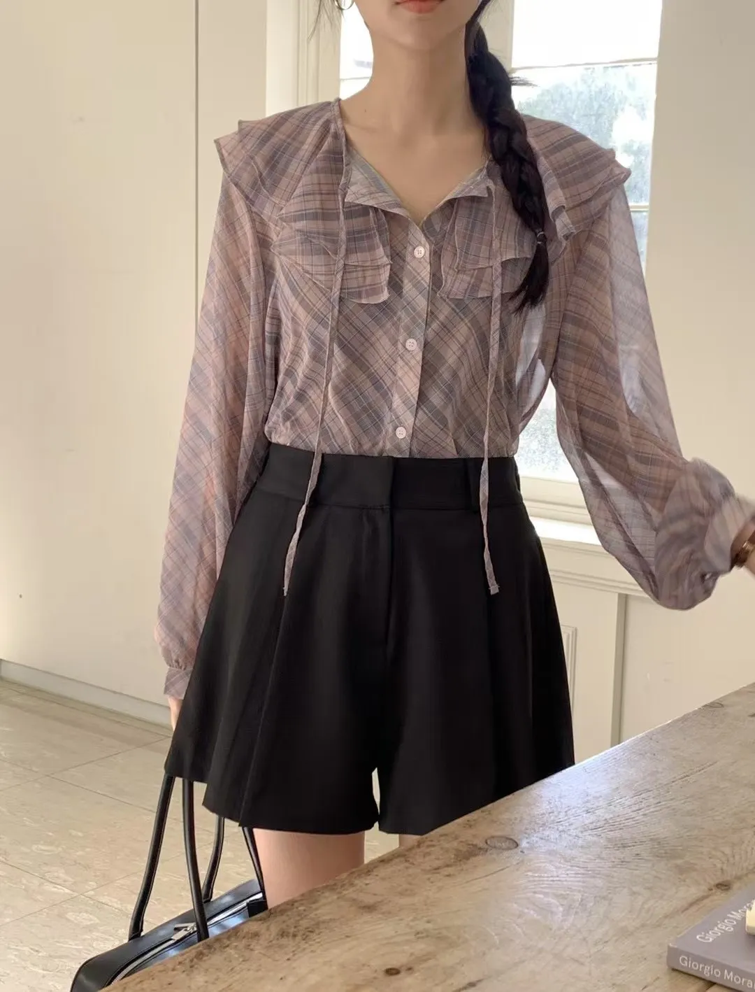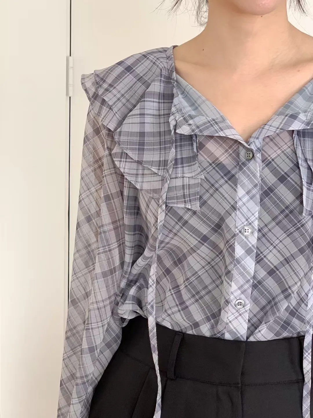 雪紡 推薦款 薄款透光 貝殼釦 雙層荷葉翻領 胸綁帶