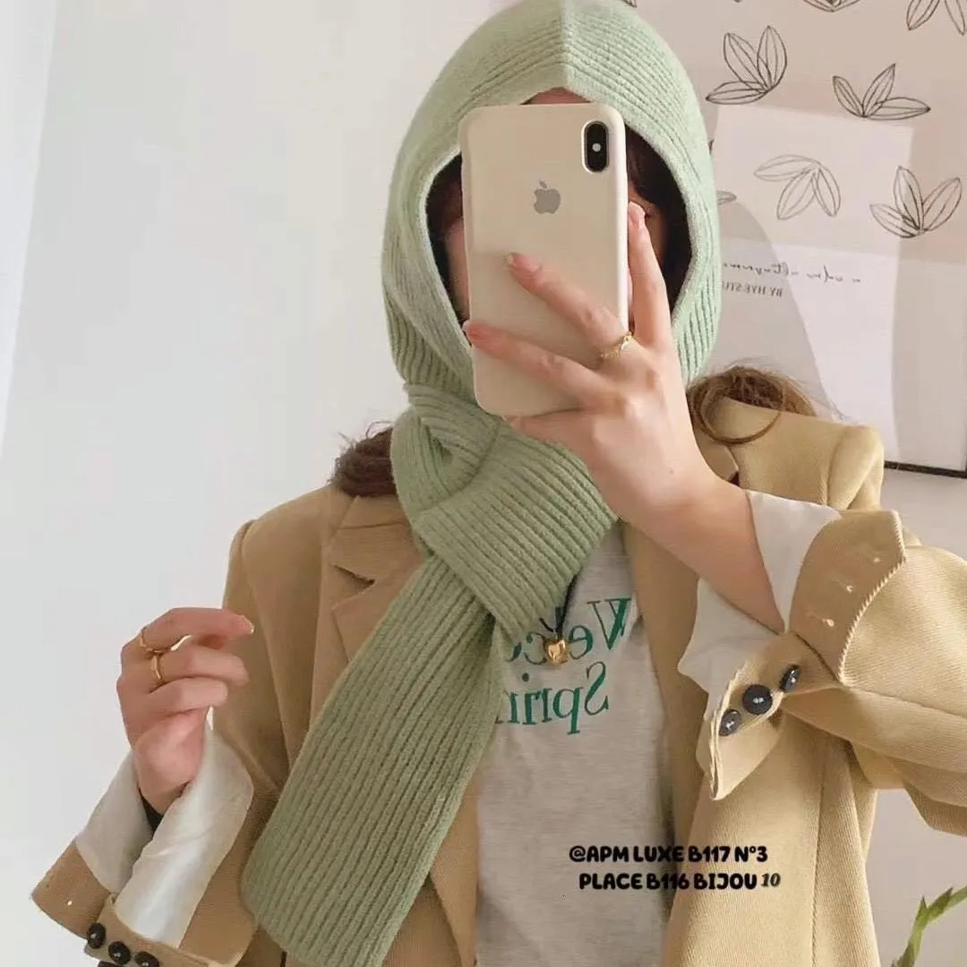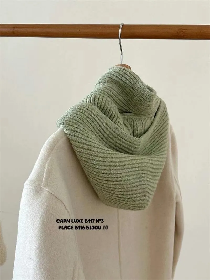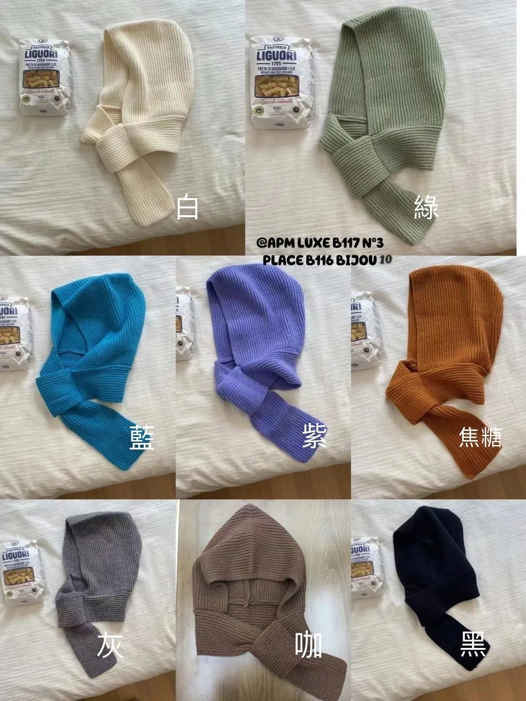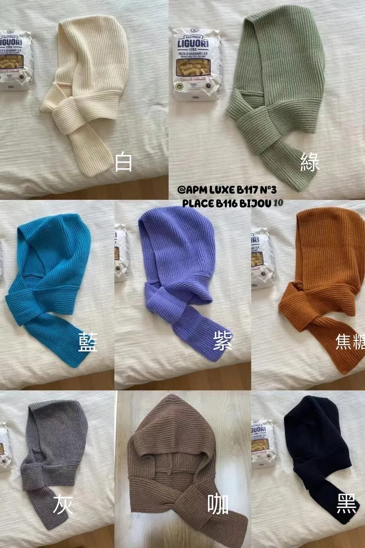 AN017可愛圍巾造型款坑條針織帽 白 綠 藍 紫 焦糖 灰 咖 黑 線上價$390 官網價$420