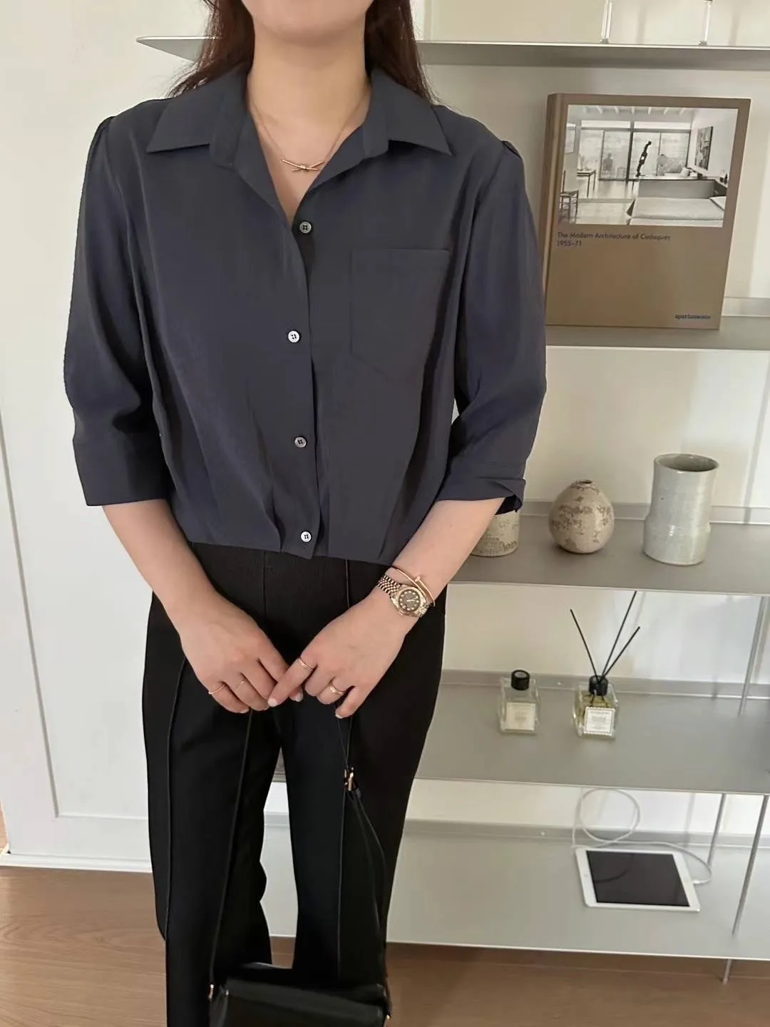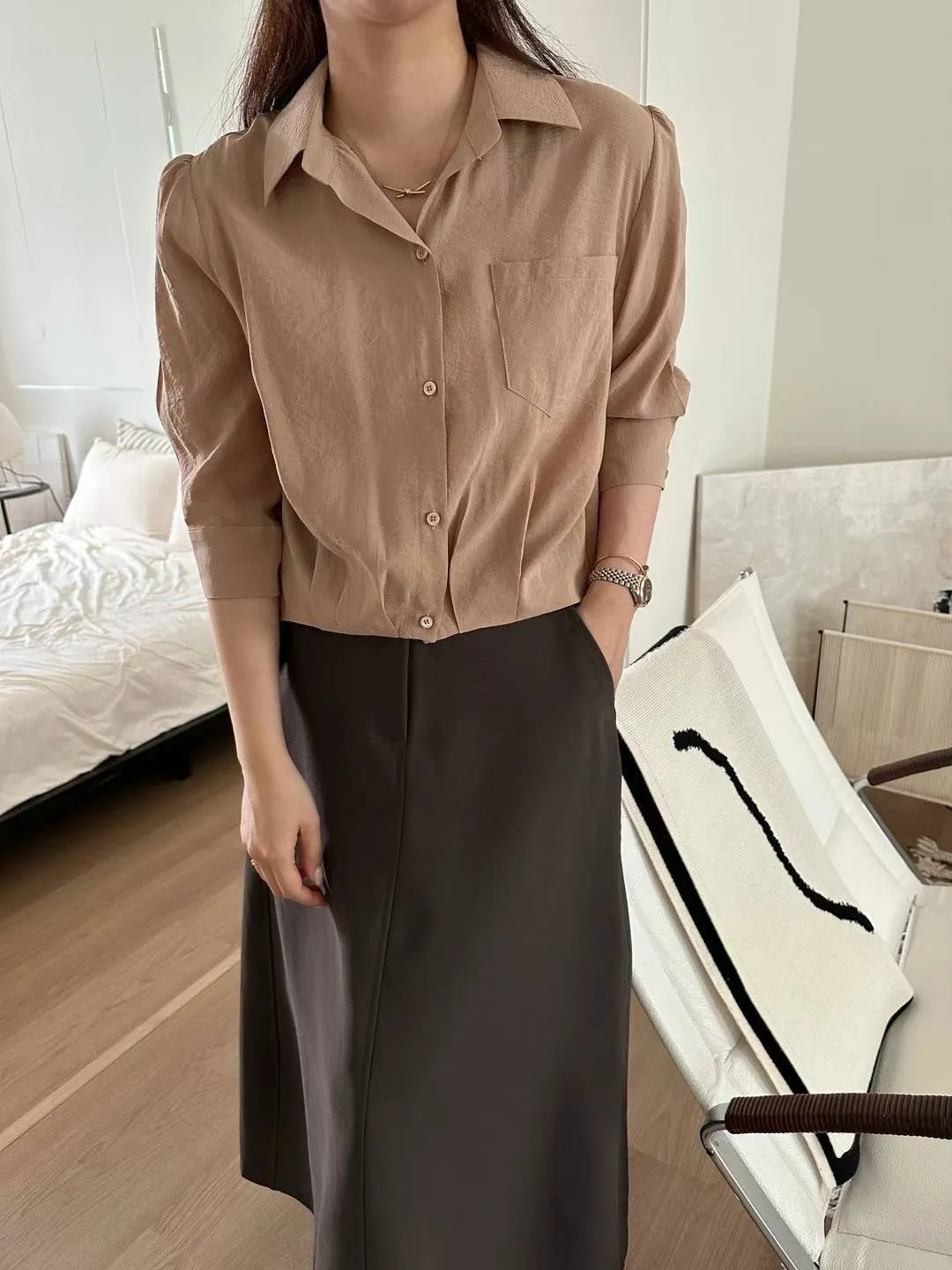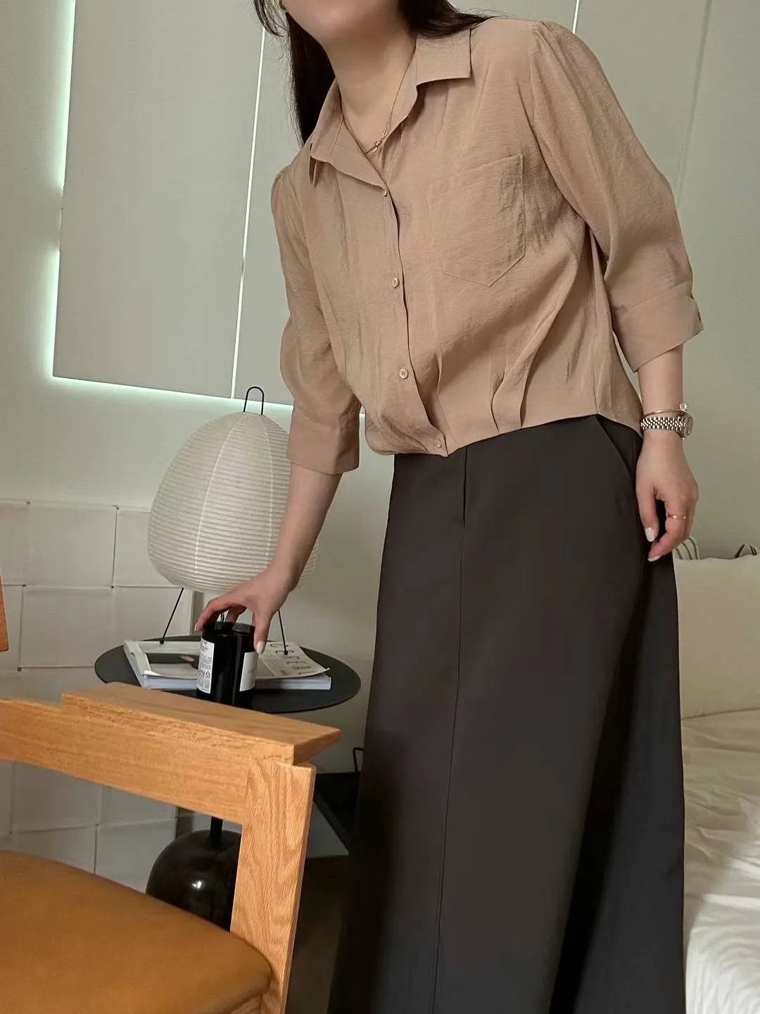 縲縈+聚酯 薄款舒適 涼感單口袋 自然皺褶下擺 貝殼釦 適合夏天