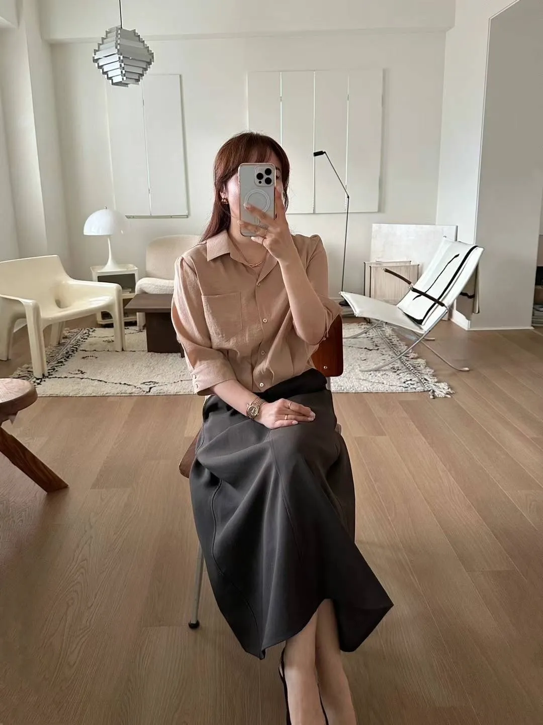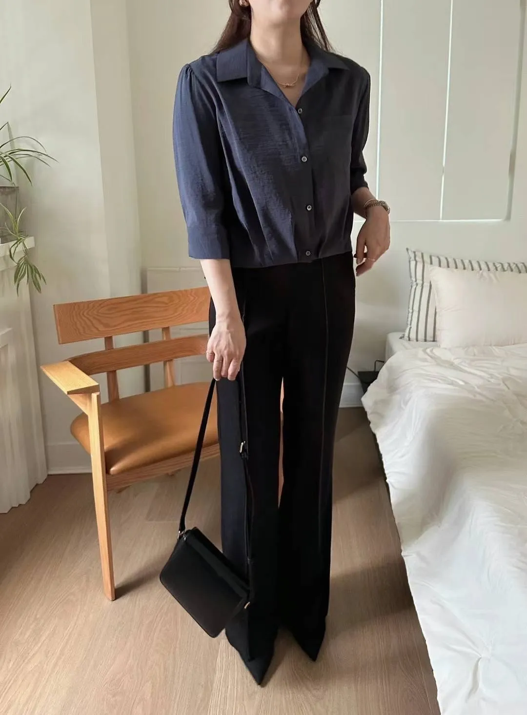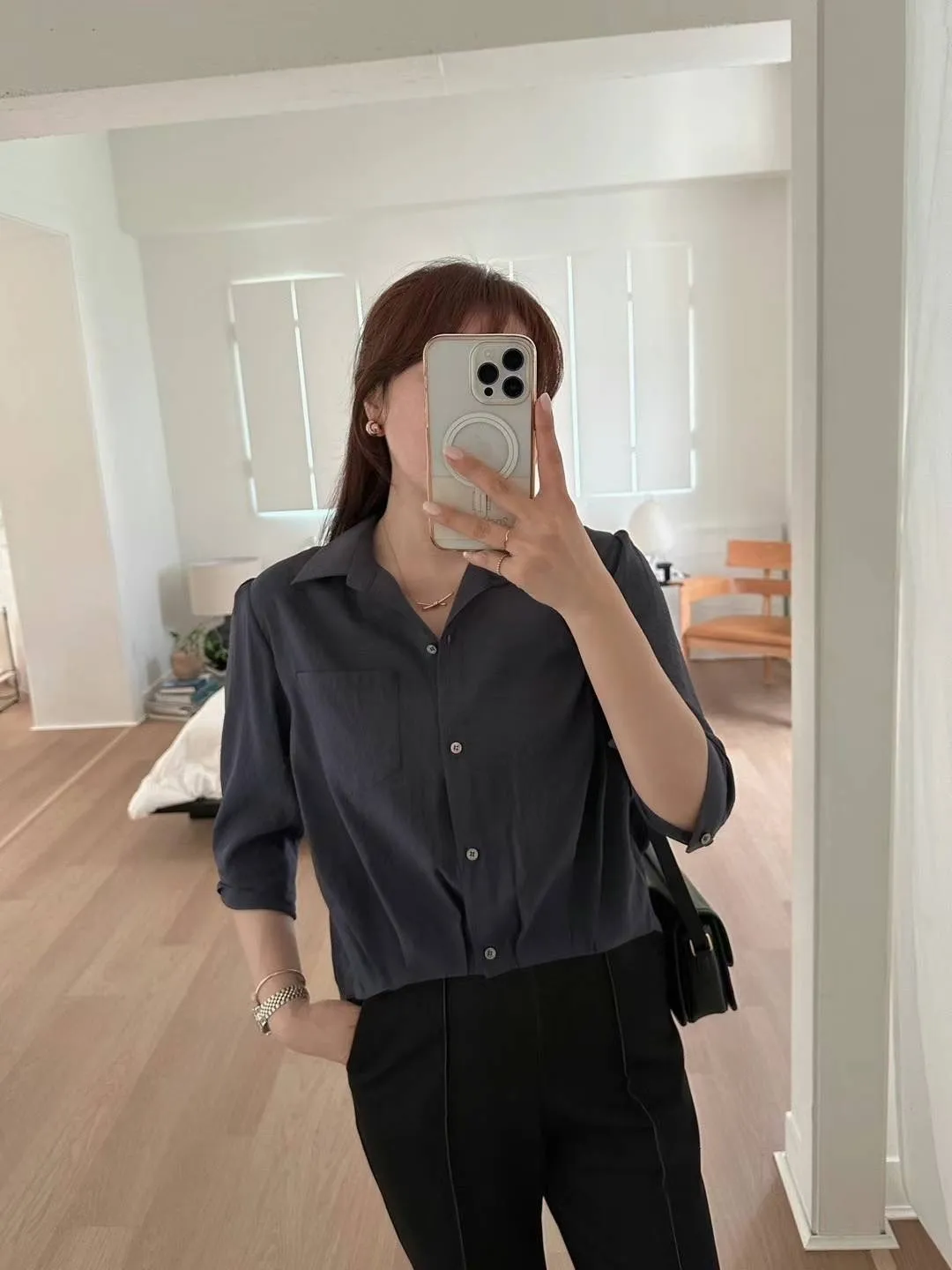 縲縈+聚酯 薄款舒適 涼感單口袋 自然皺褶下擺 貝殼釦 適合夏天