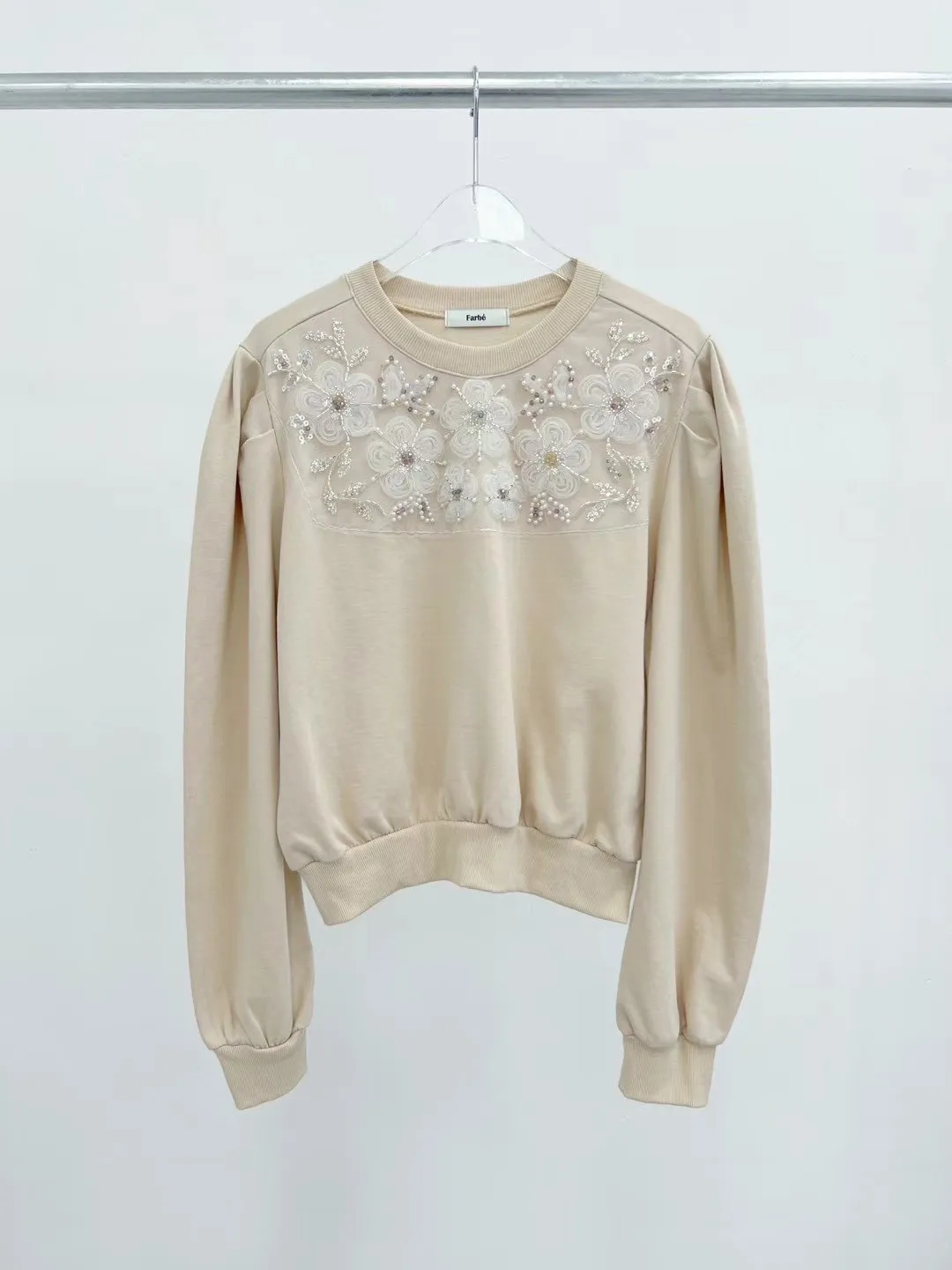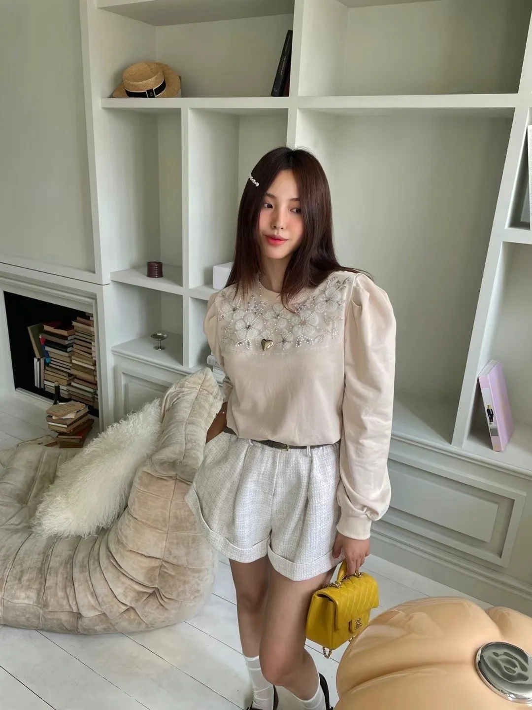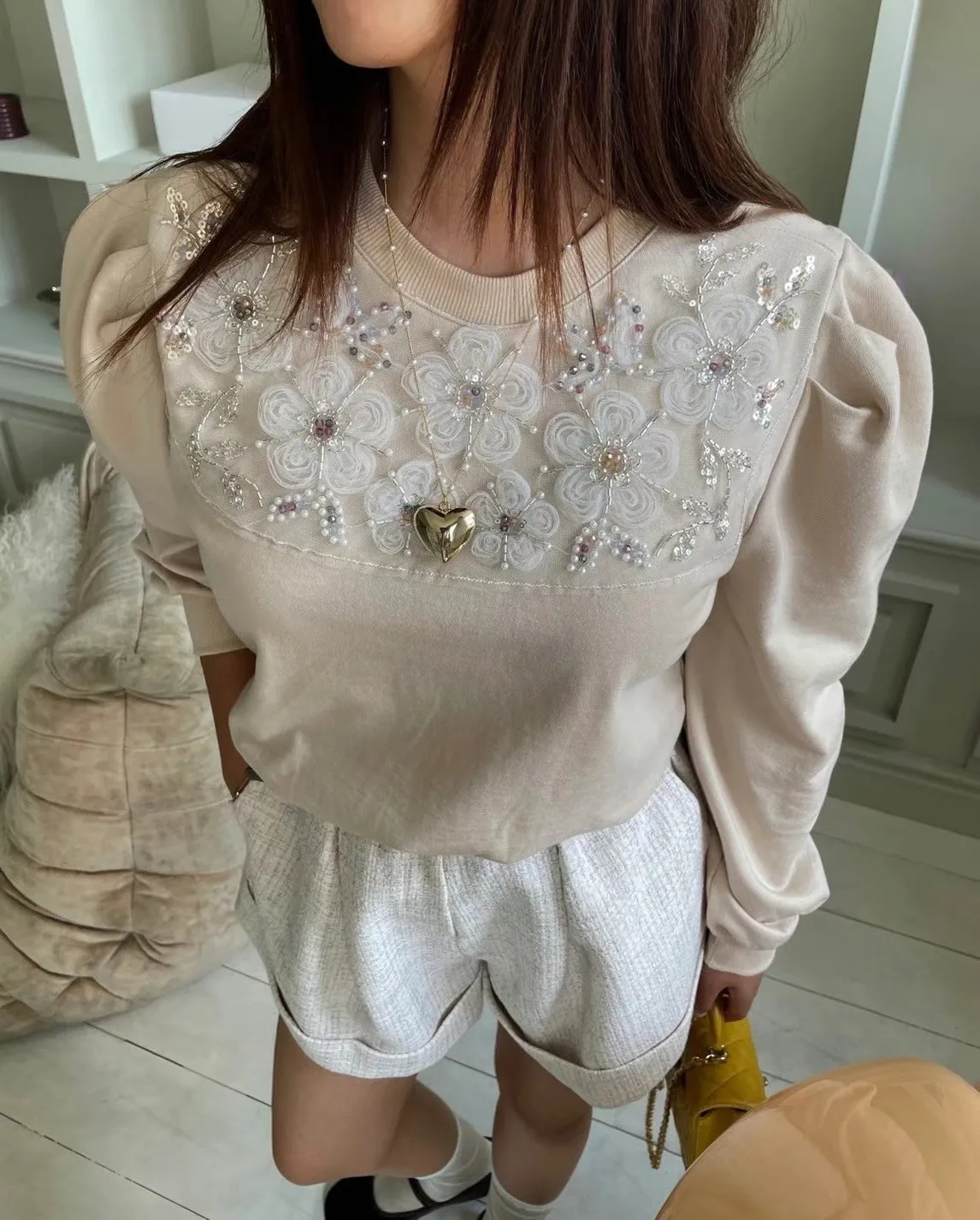 棉 精緻珍珠亮絲美花 視覺高級 薄款舒適 公主蓬蓬袖 手袖鬆緊