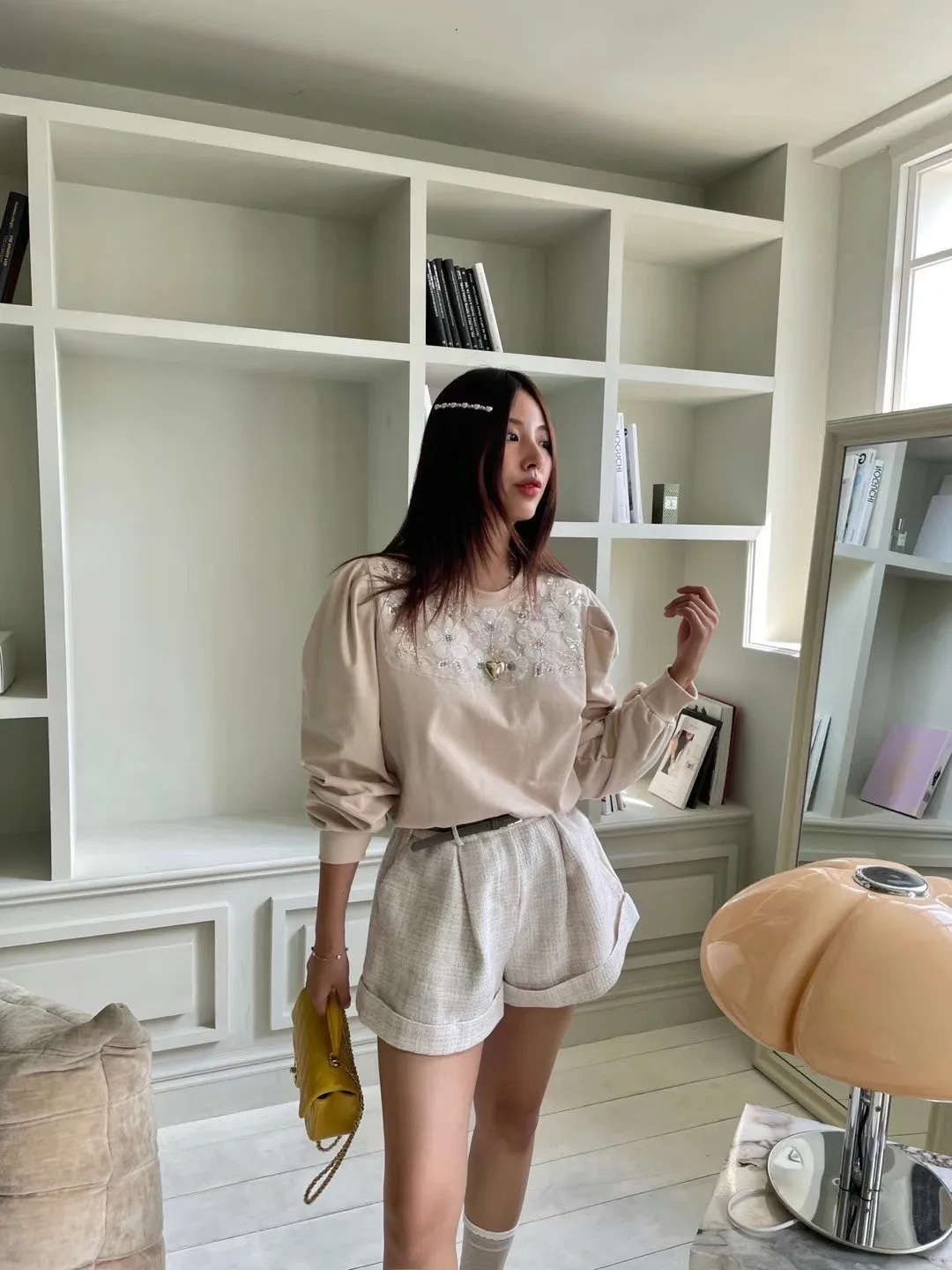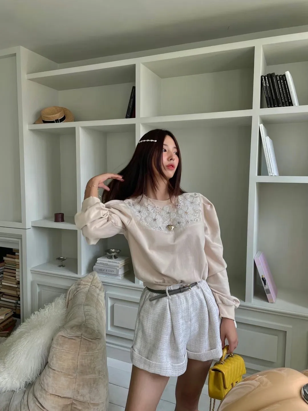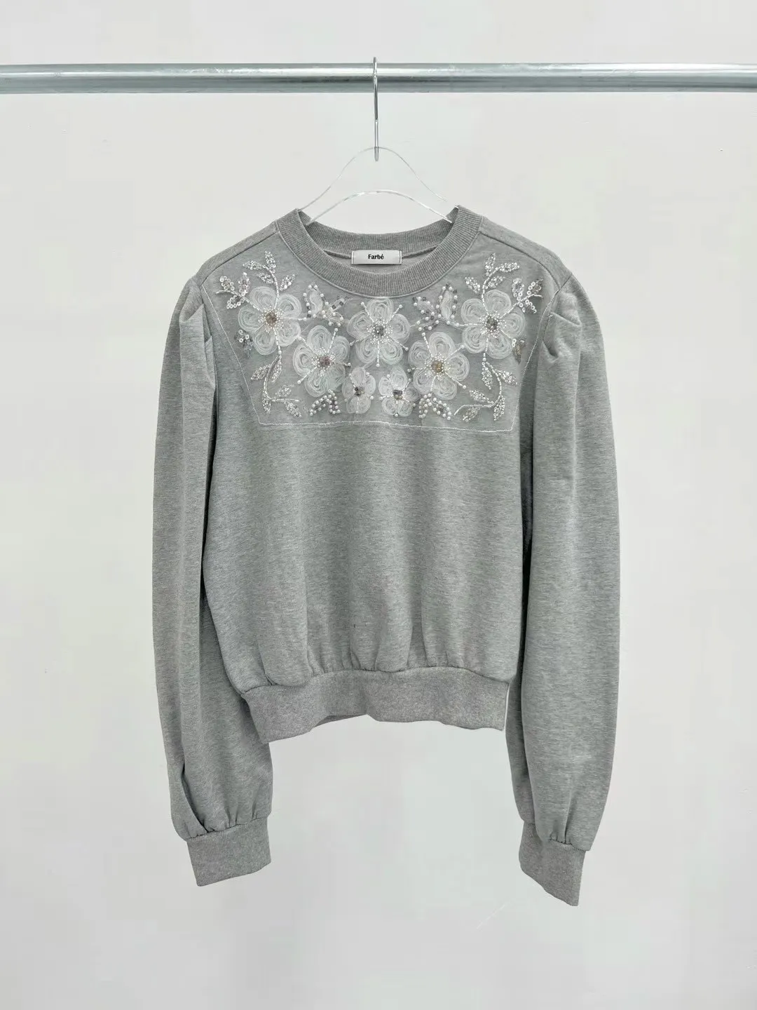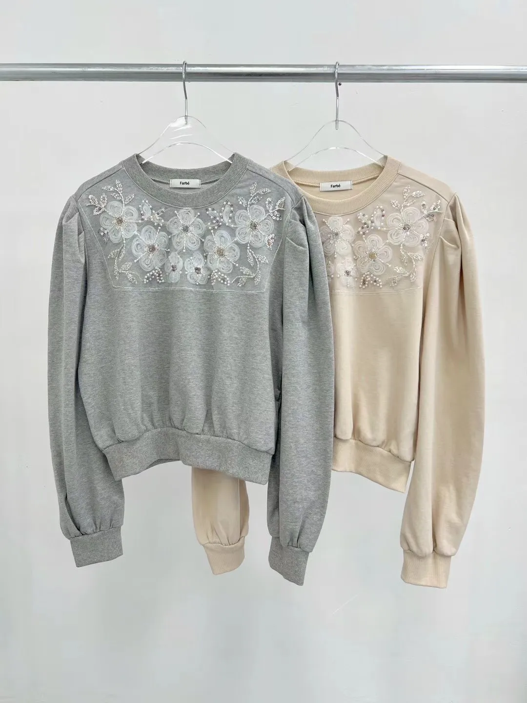 棉 精緻珍珠亮絲美花 視覺高級 薄款舒適 公主蓬蓬袖 手袖鬆緊