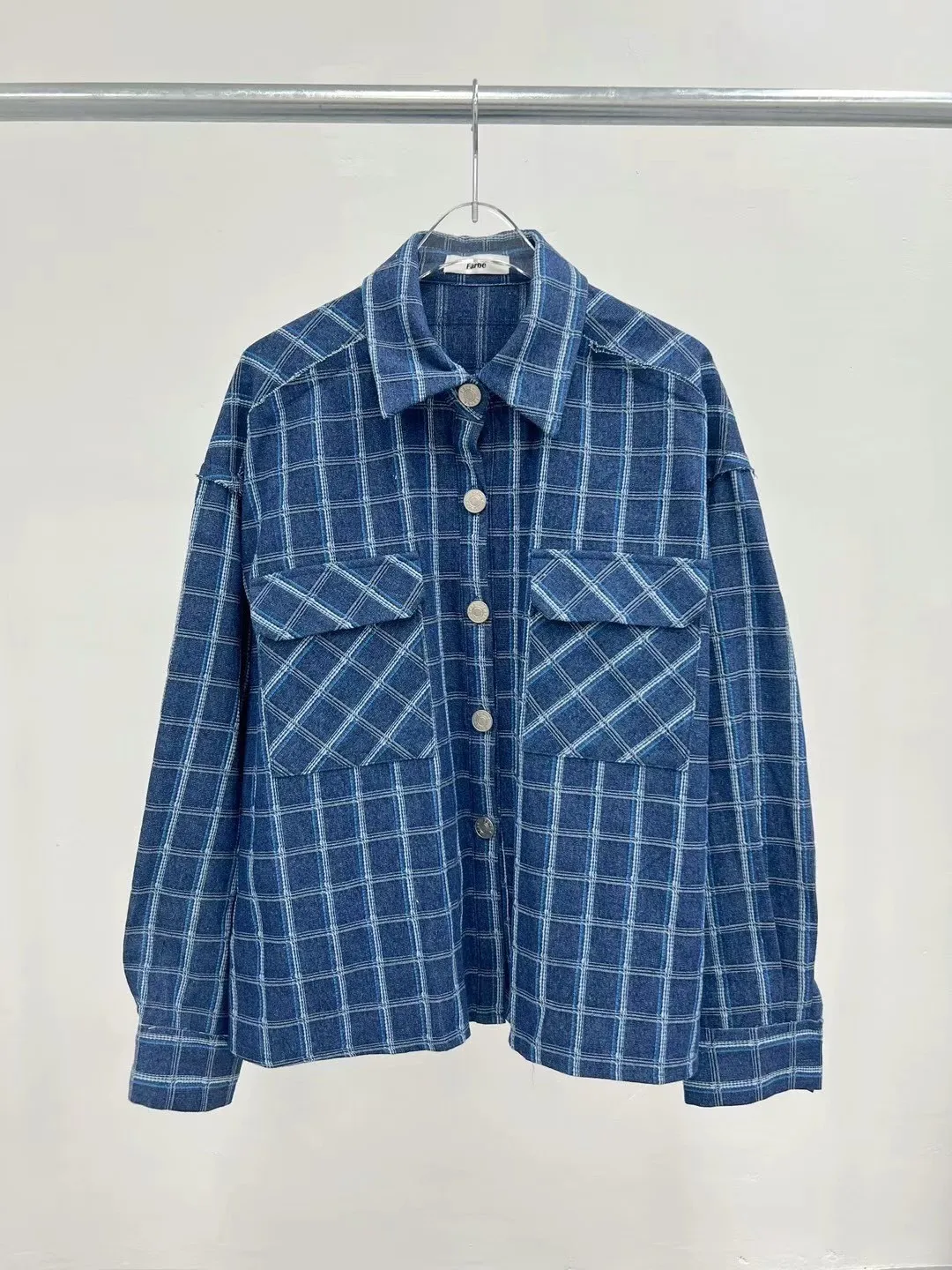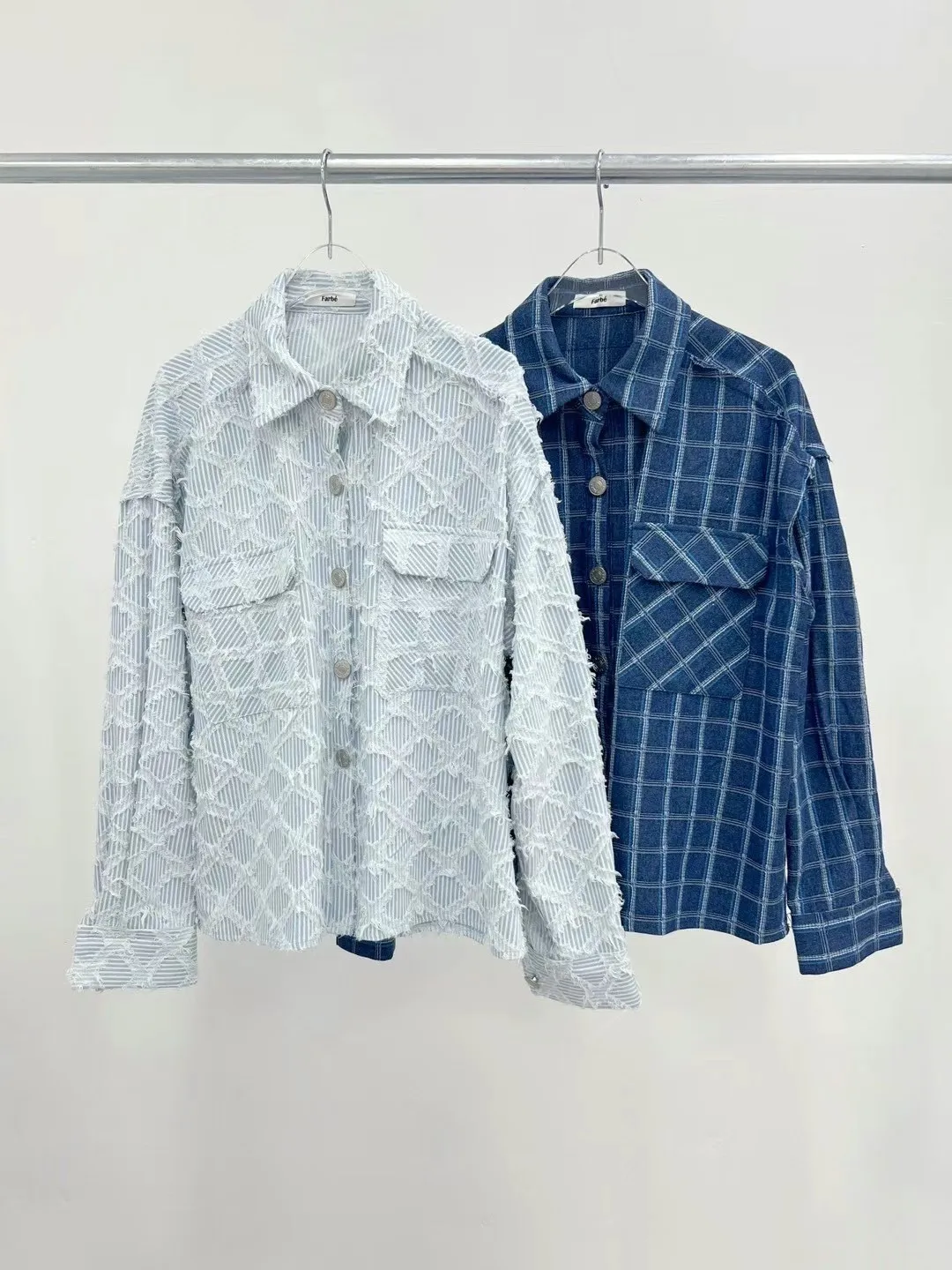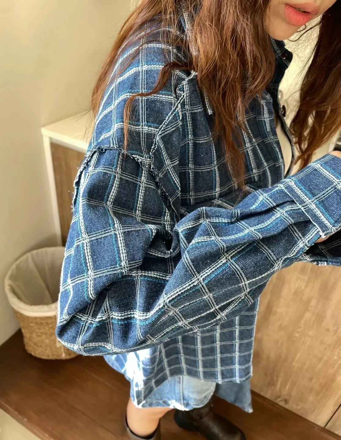 棉 柔軟面料 淺藍刷鬚感 深藍格紋 釦子穿脫 有口袋 側開叉