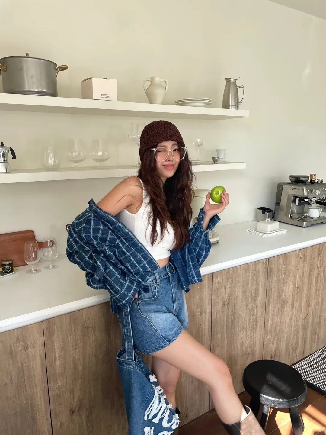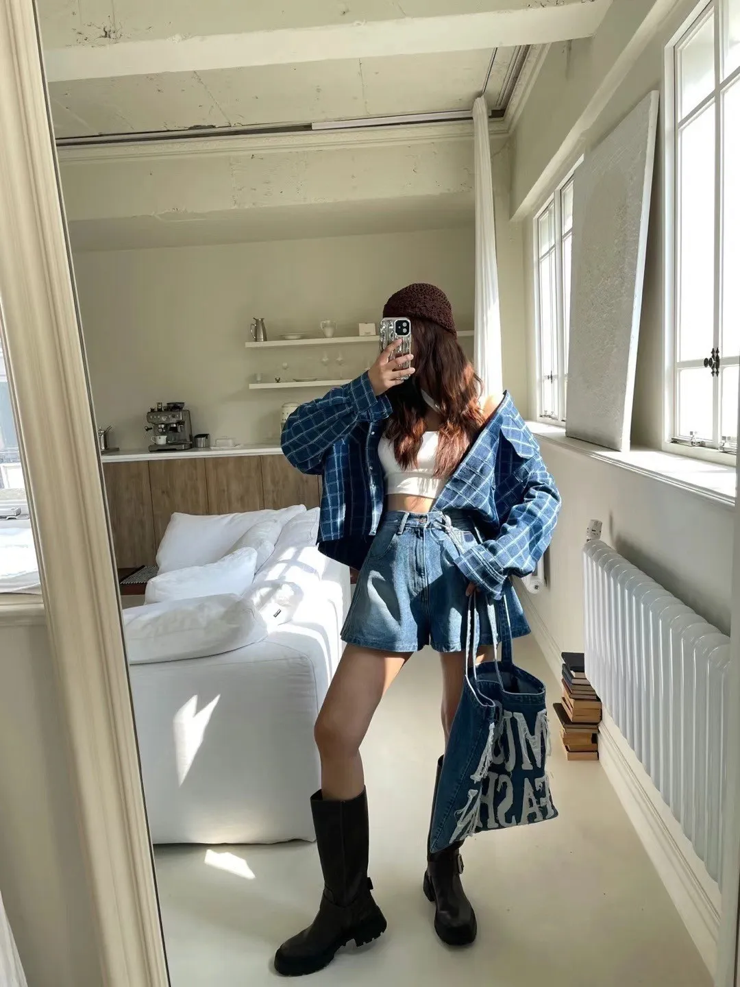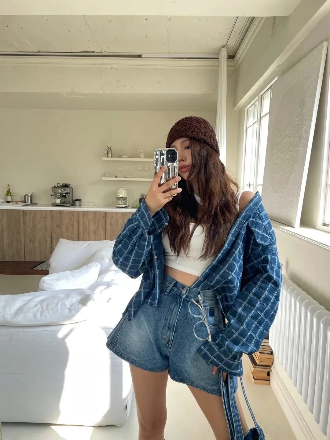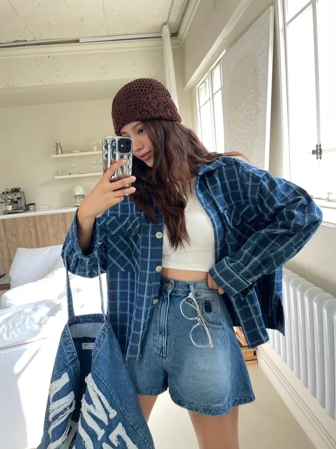 棉 柔軟面料 淺藍刷鬚感 深藍格紋 釦子穿脫 有口袋 側開叉