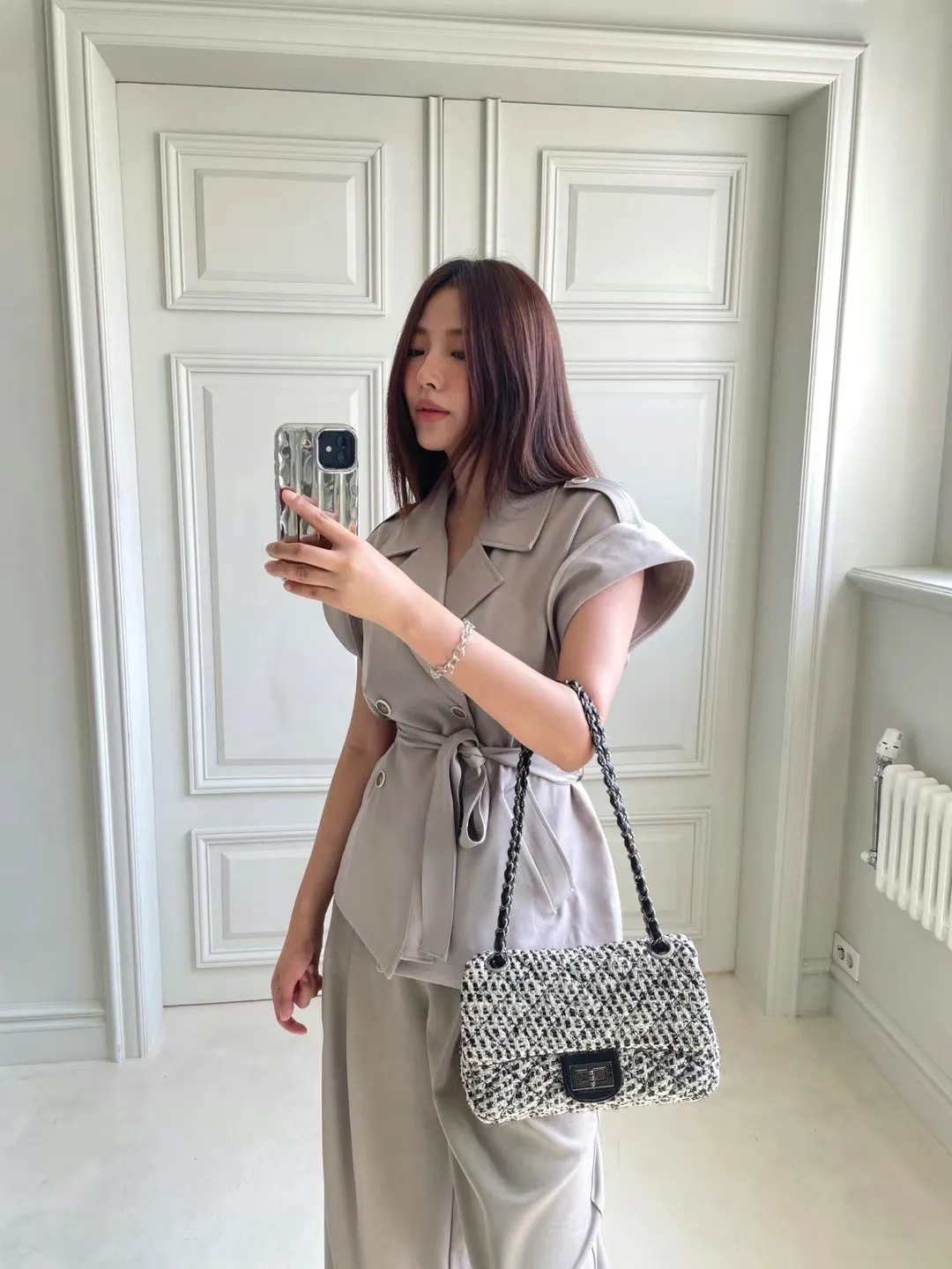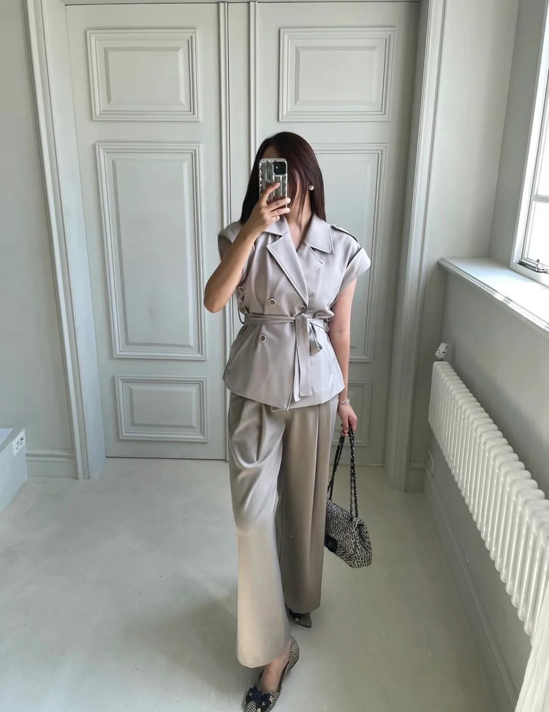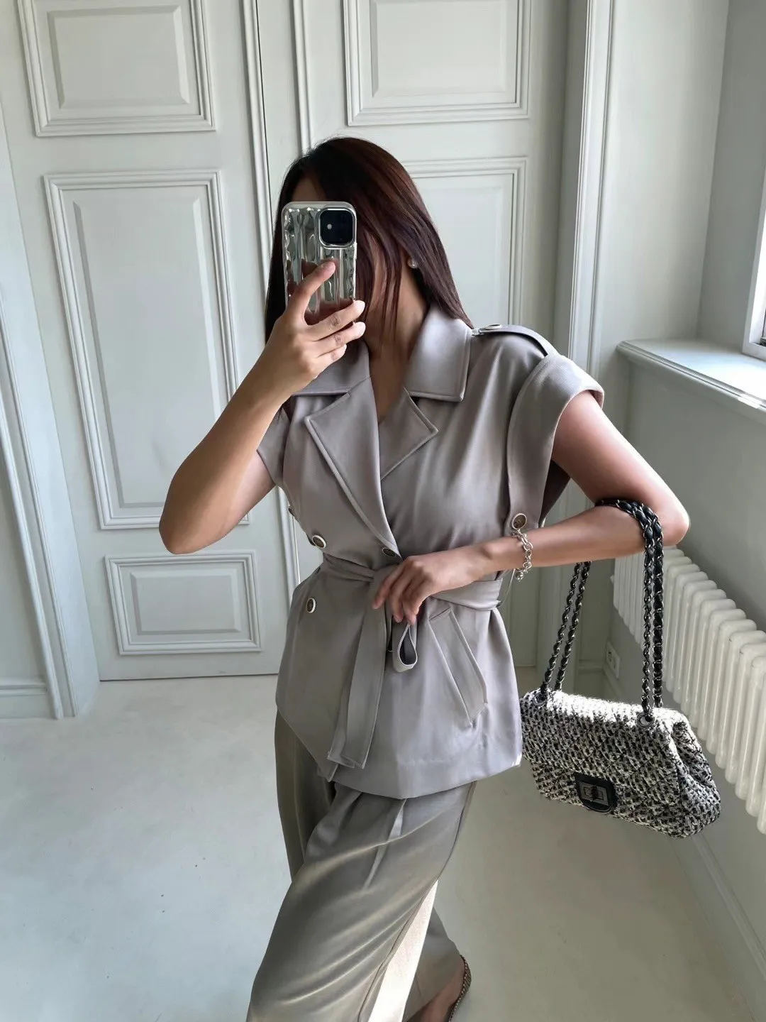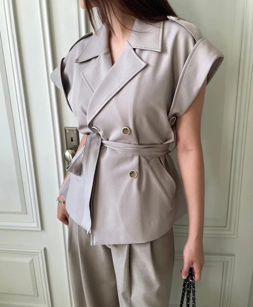 聚酯 西裝領 顯瘦翻袖 精緻雙排釦 腰綁帶 有口袋
