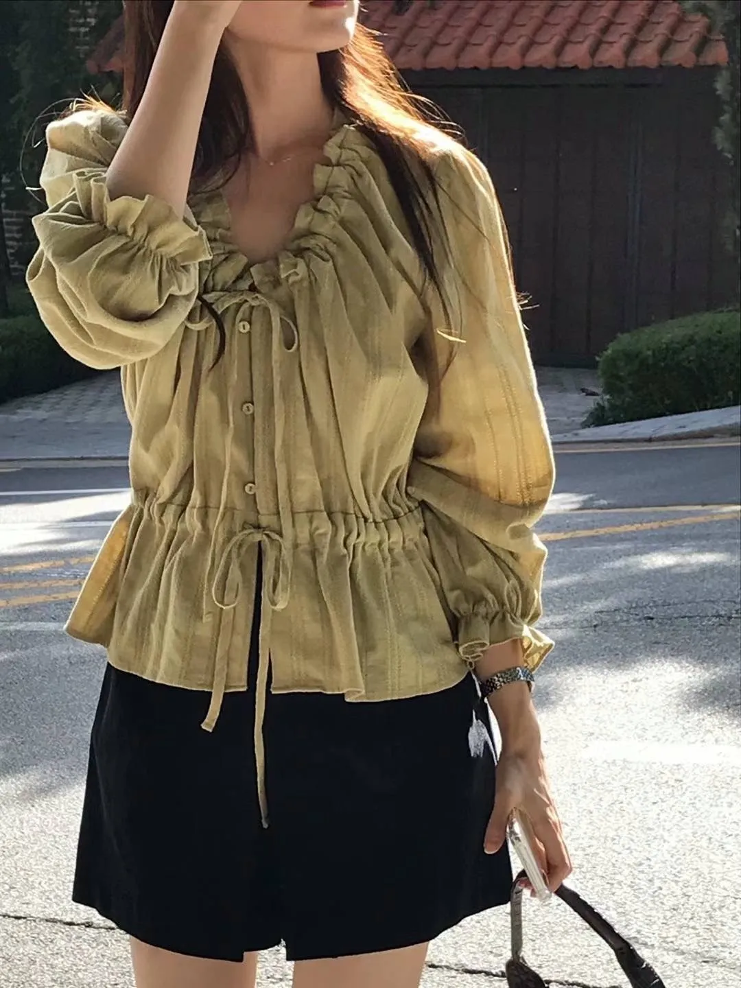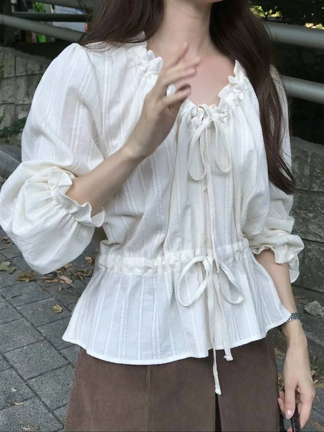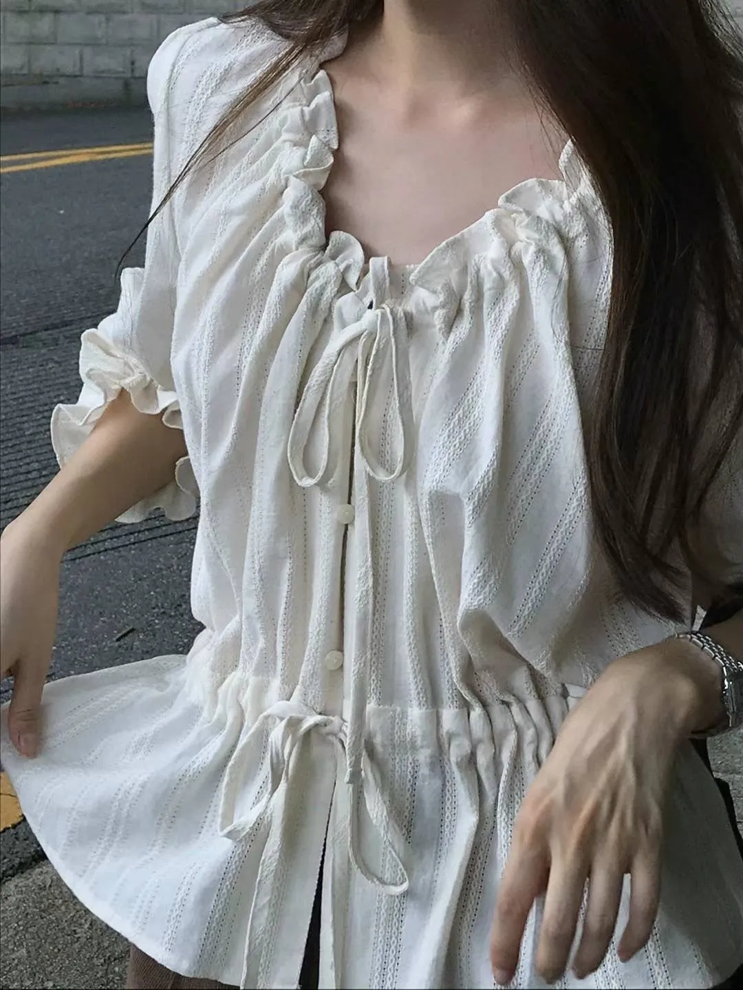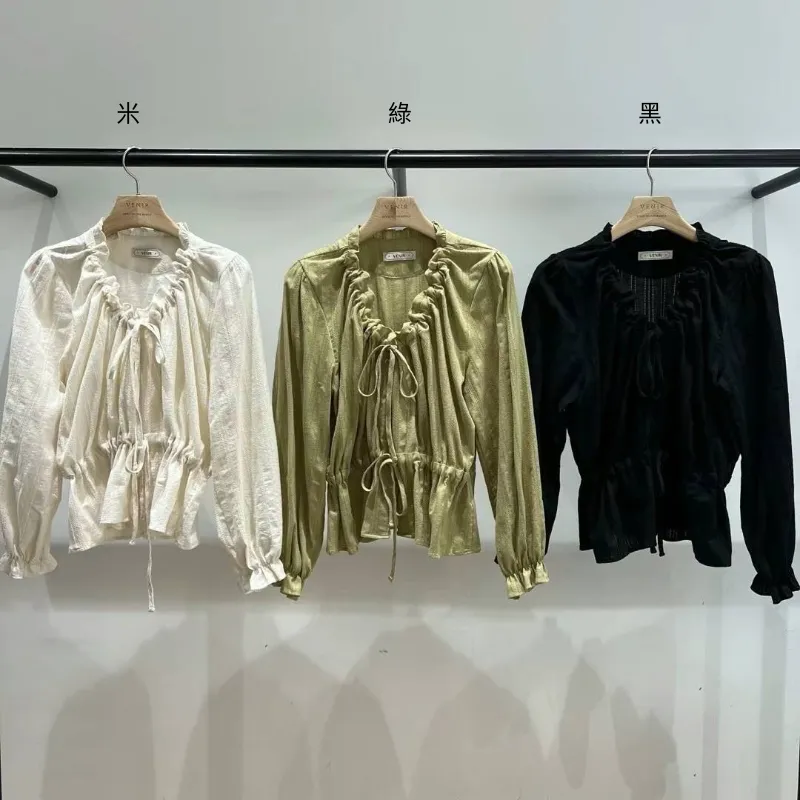 棉 透氣舒適 細緻布蕾絲面料 胸腰雙綁帶 荷葉V領 袖口鬆緊