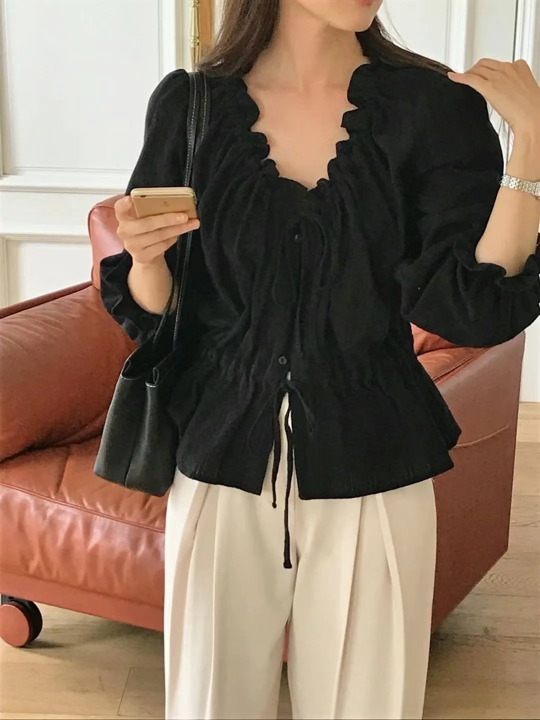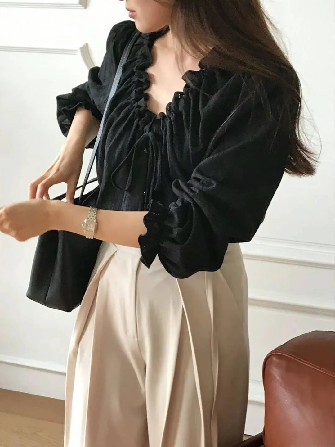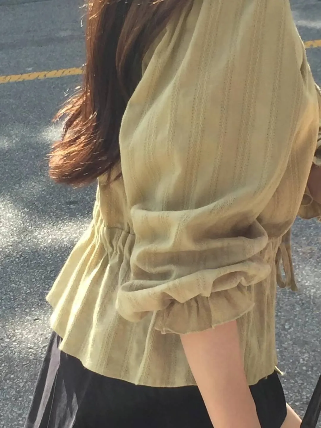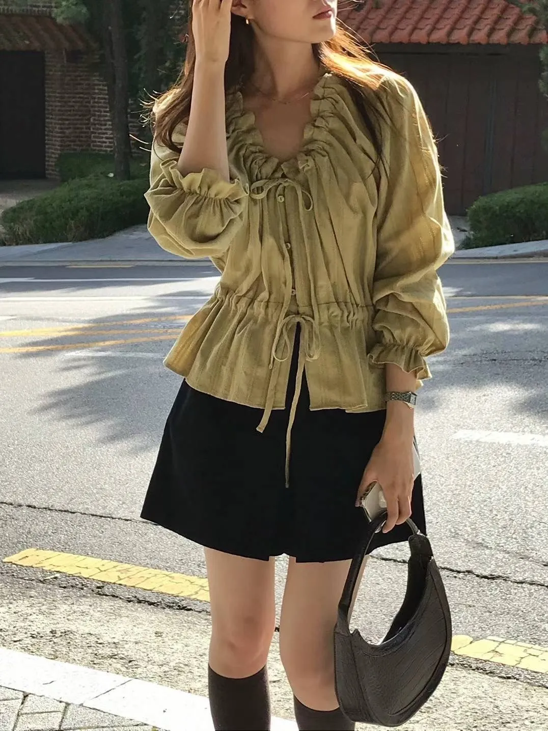 棉 透氣舒適 細緻布蕾絲面料 胸腰雙綁帶 荷葉V領 袖口鬆緊