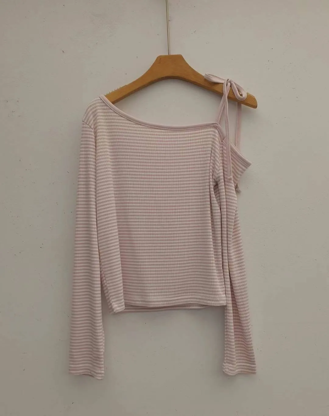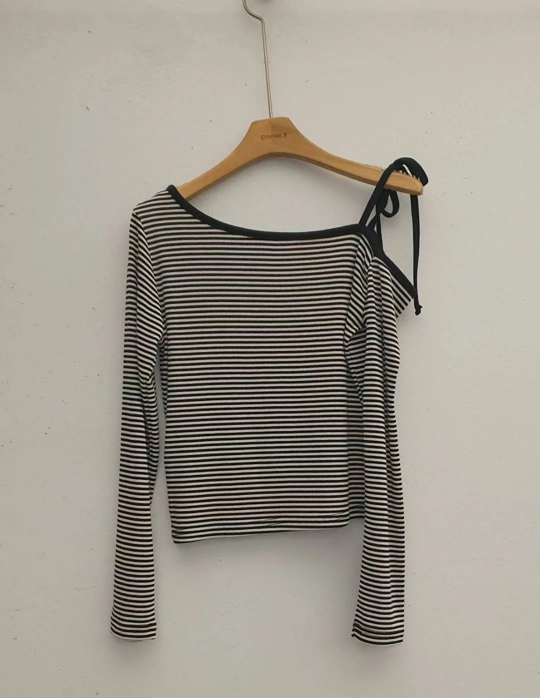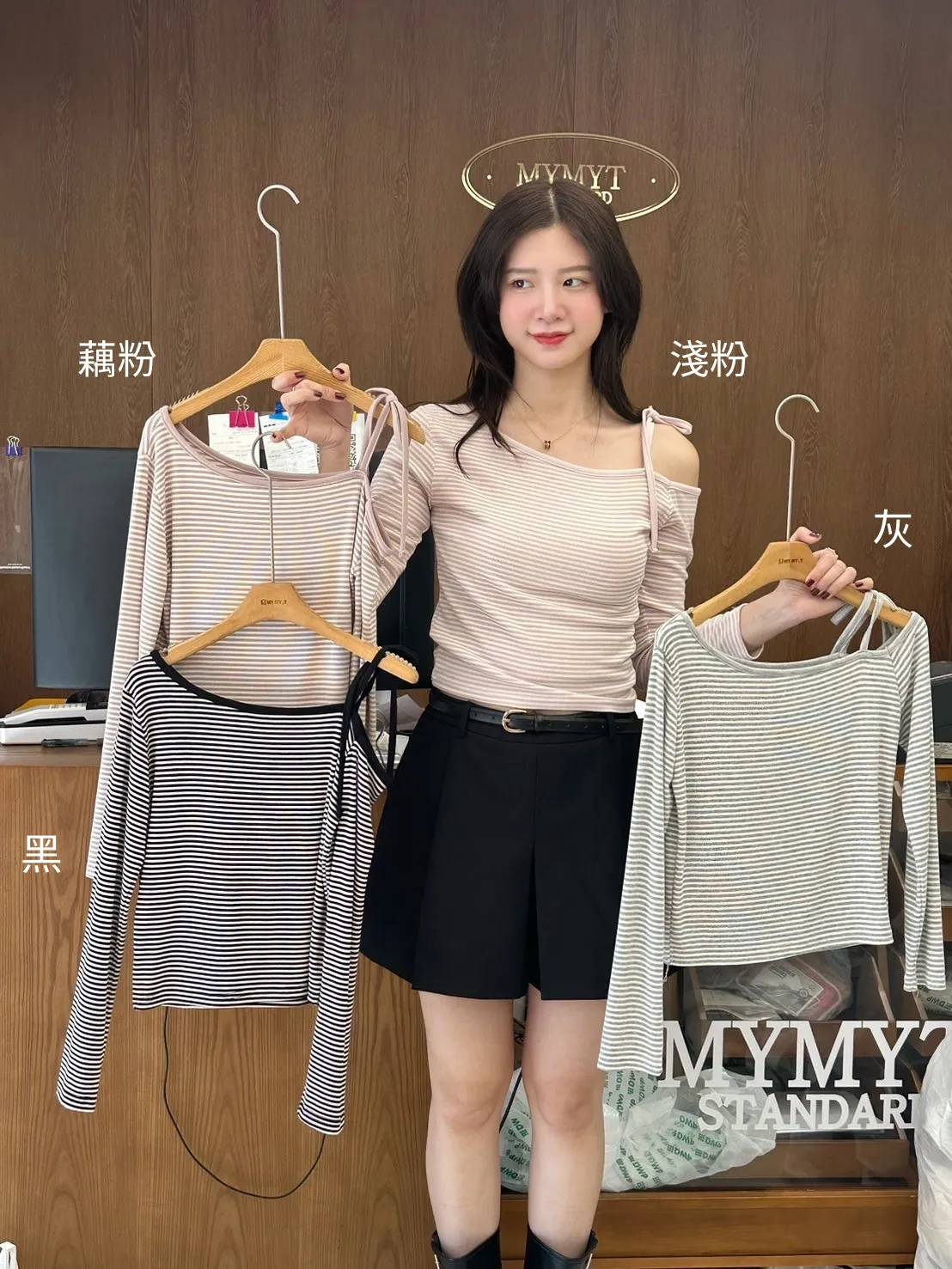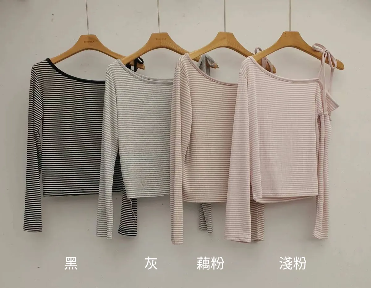 BS456單肩綁帶女神斜領條紋上衣 淺粉 藕粉 灰 黑 官網價$280 線上價$250