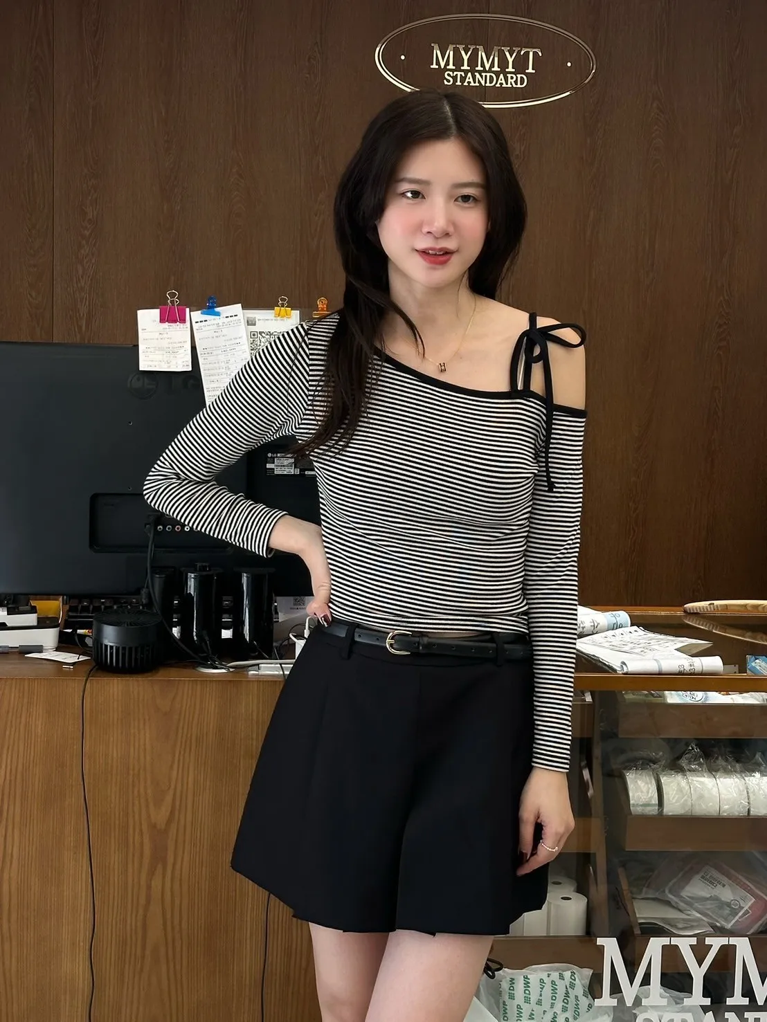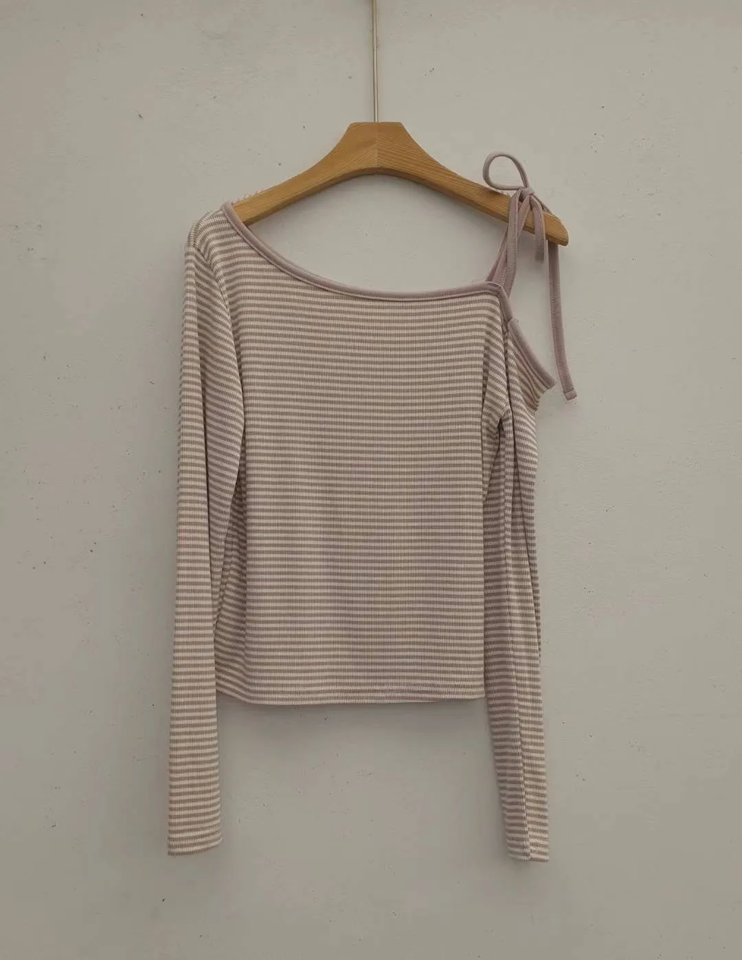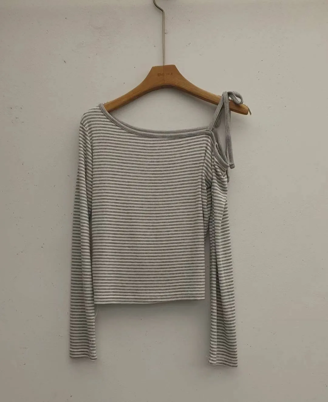 BS456單肩綁帶女神斜領條紋上衣 淺粉 藕粉 灰 黑 官網價$280 線上價$250
