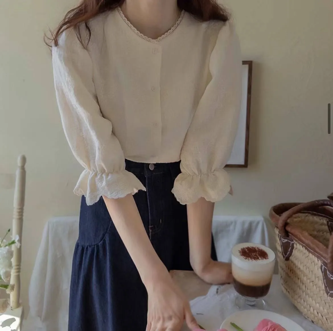 棉 薄款透氣 柔軟不刺 布蕾絲領口下擺 排釦穿脫 溫柔奶油色
