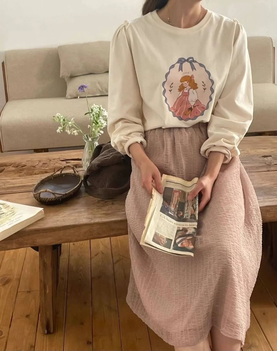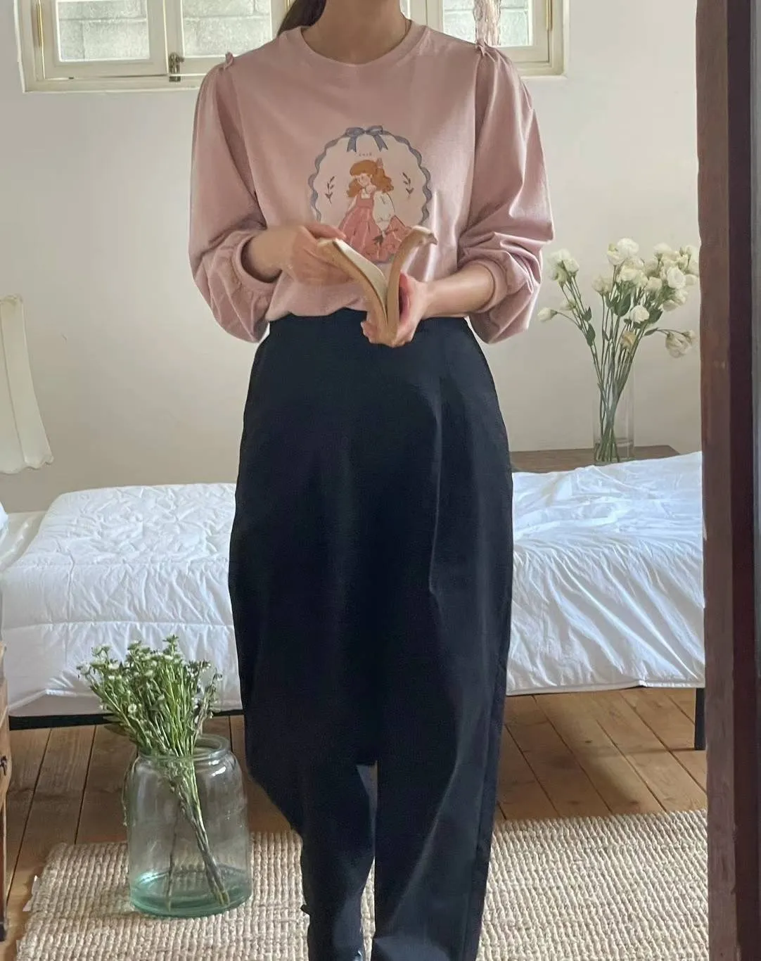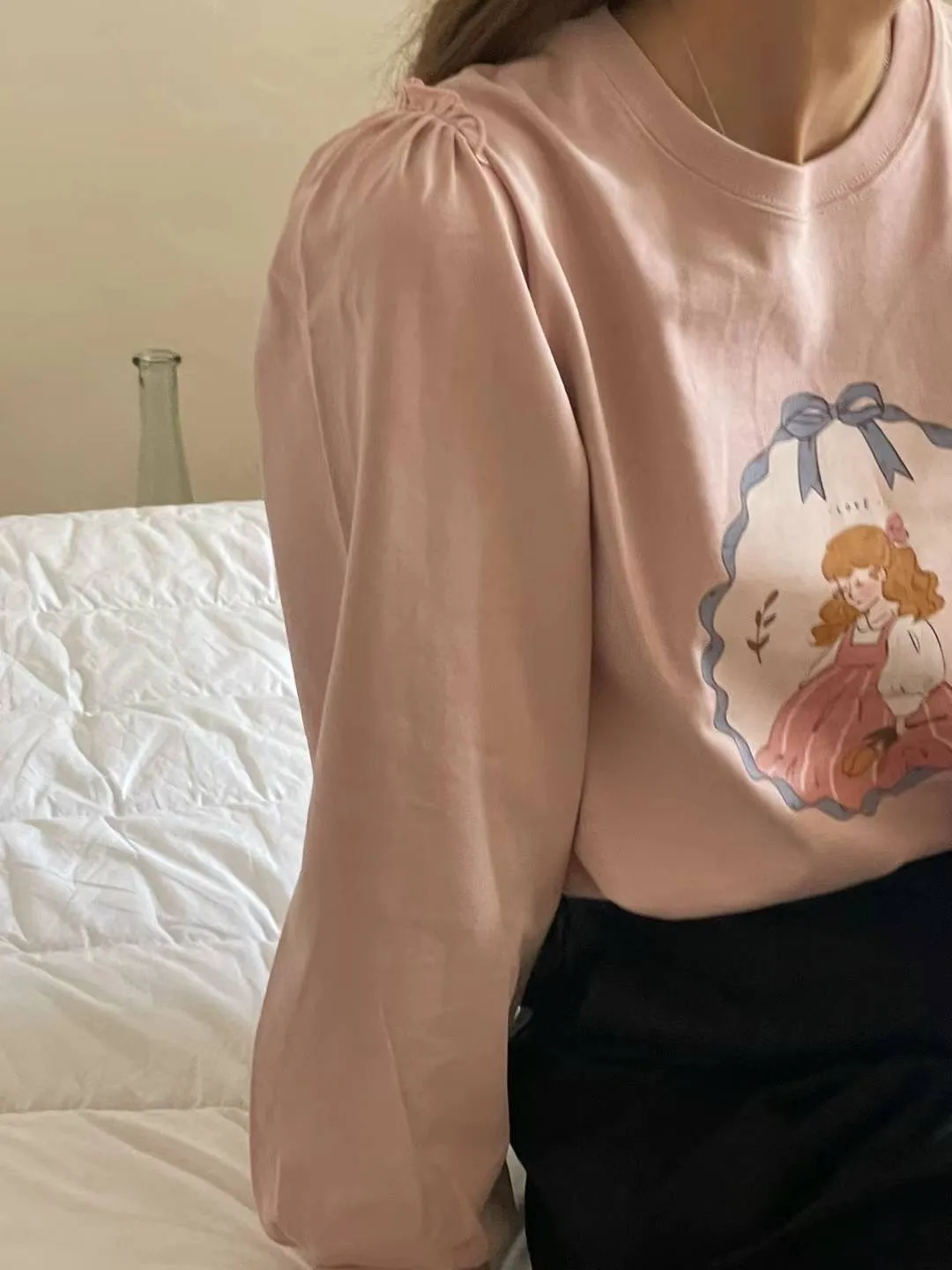 棉 透氣舒適 無刷毛 肩袖荷葉 轉印圖 領口舒適 手袖鬆緊