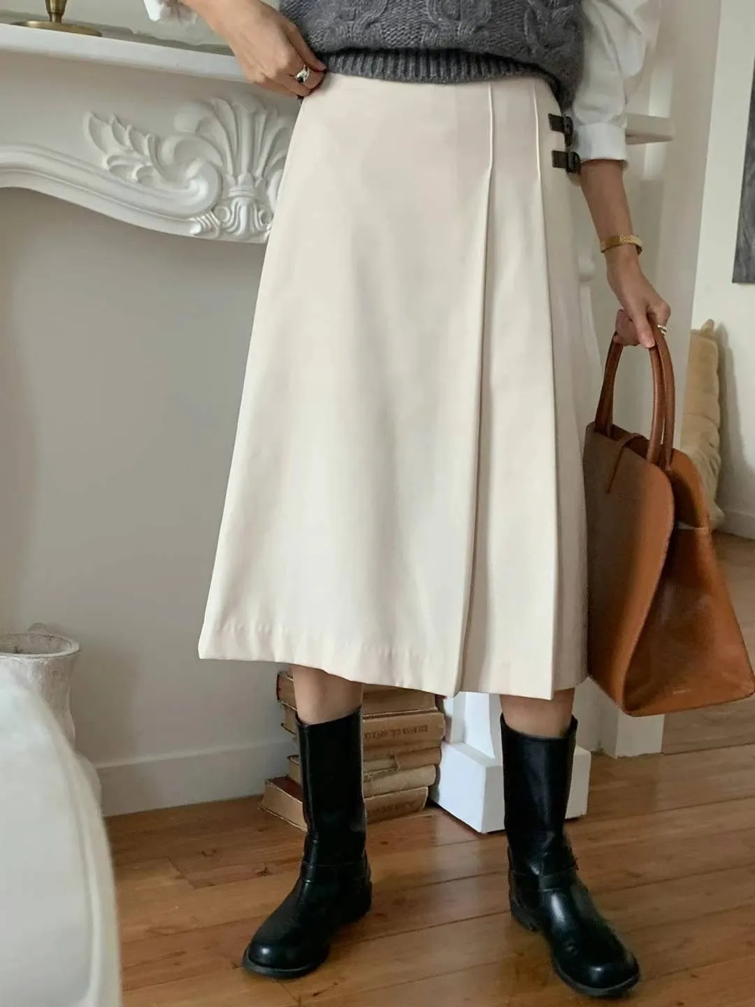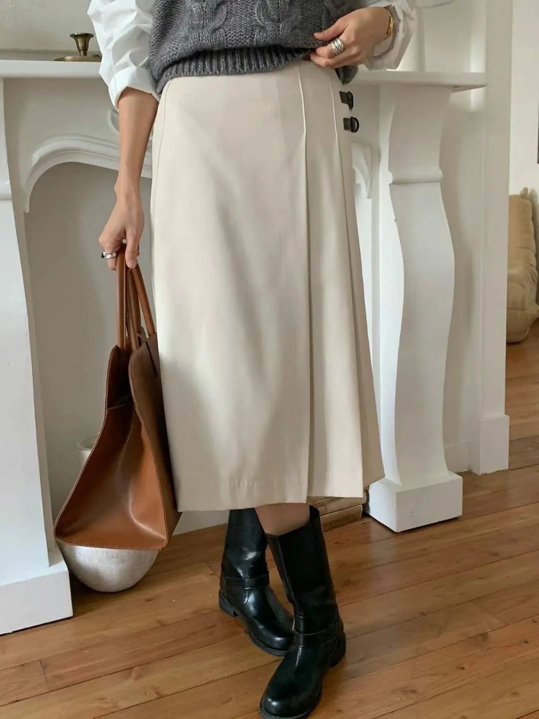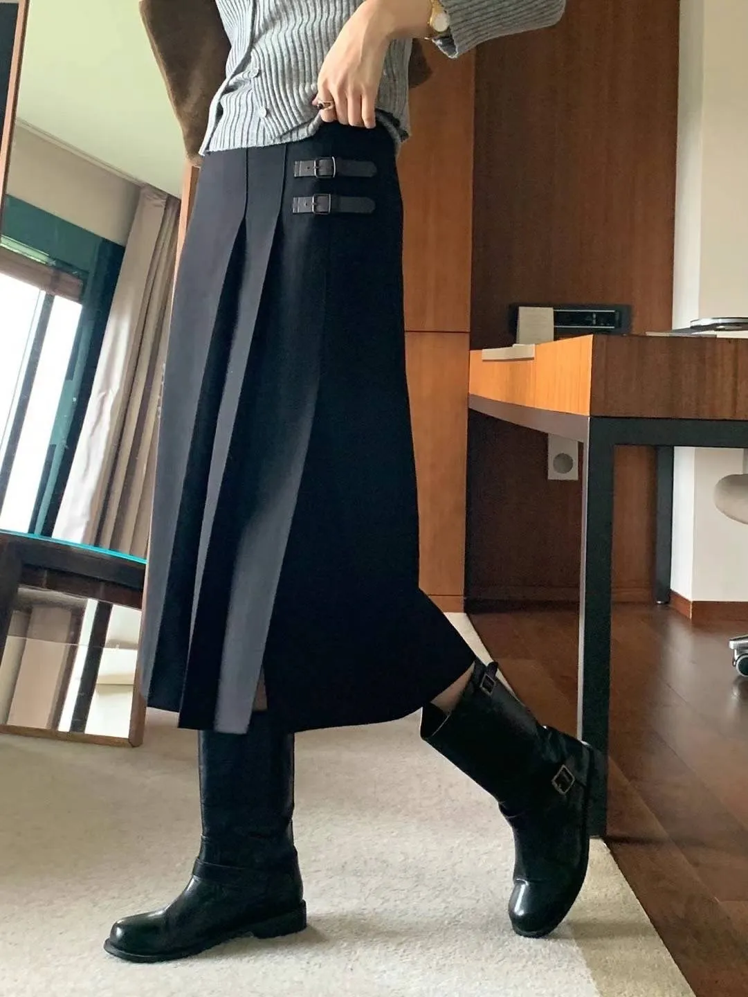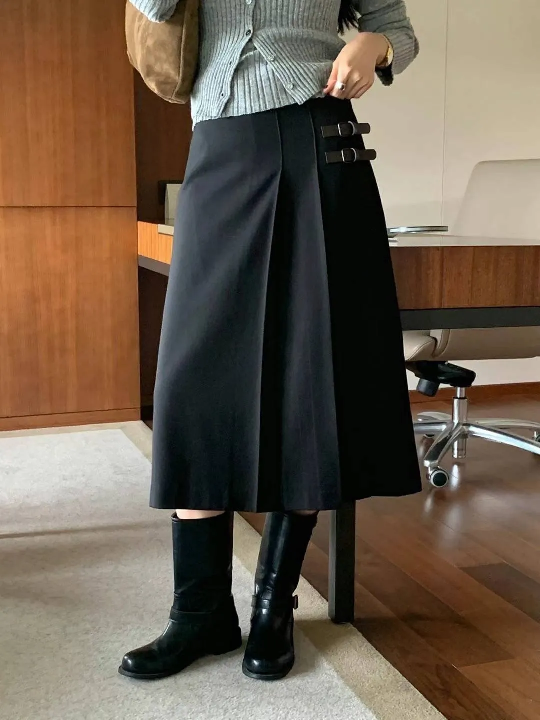 西裝面料 後拉鍊穿脫 單側百摺設計 皮革不可拆 無口袋有內理 夏天可