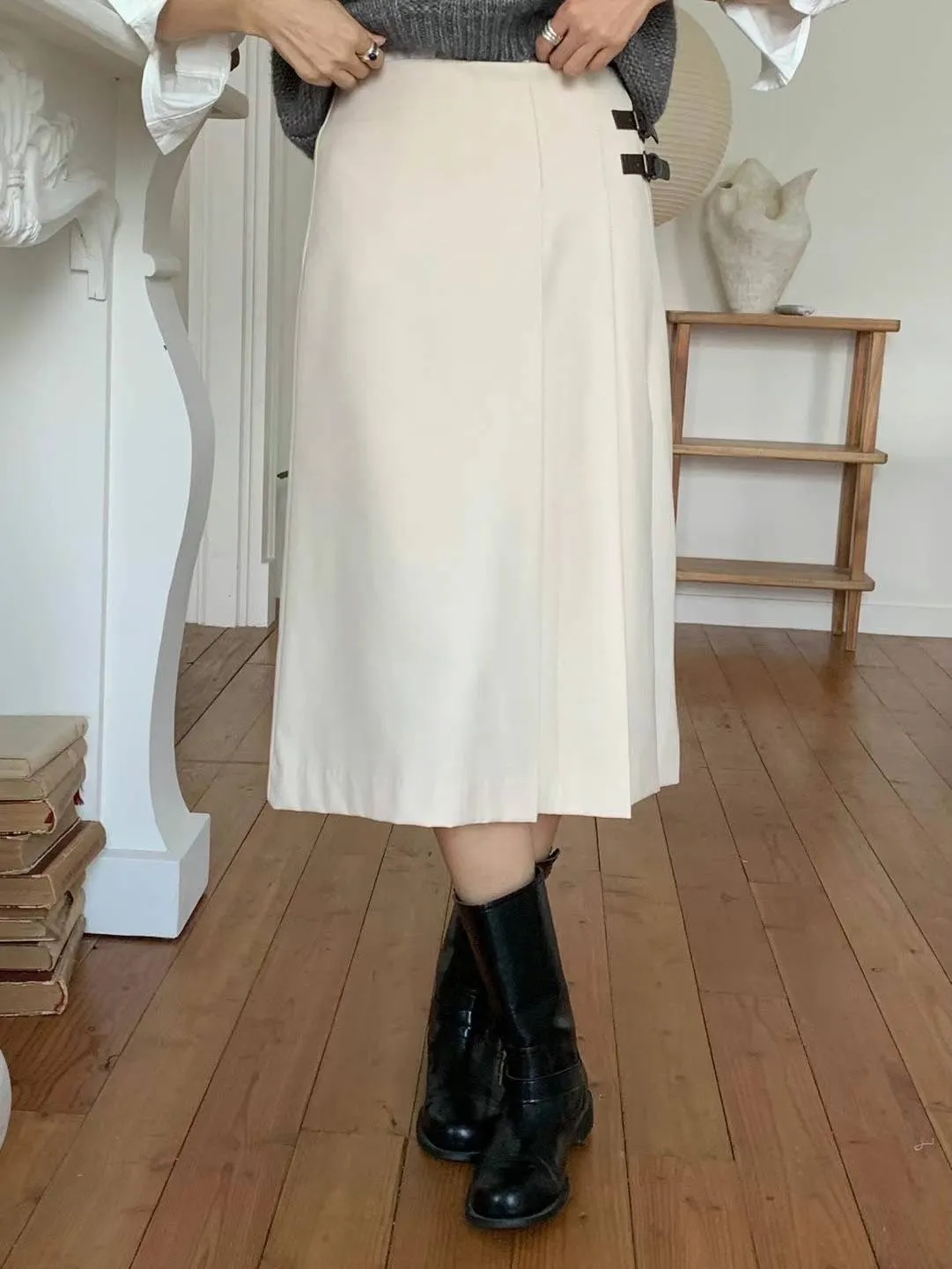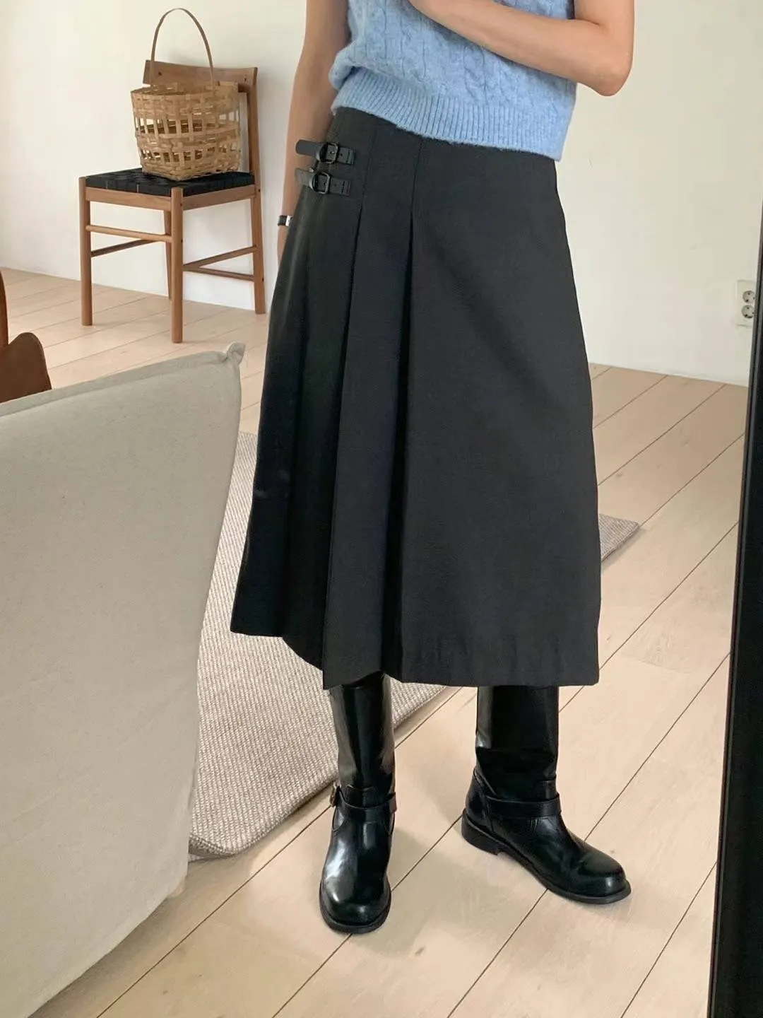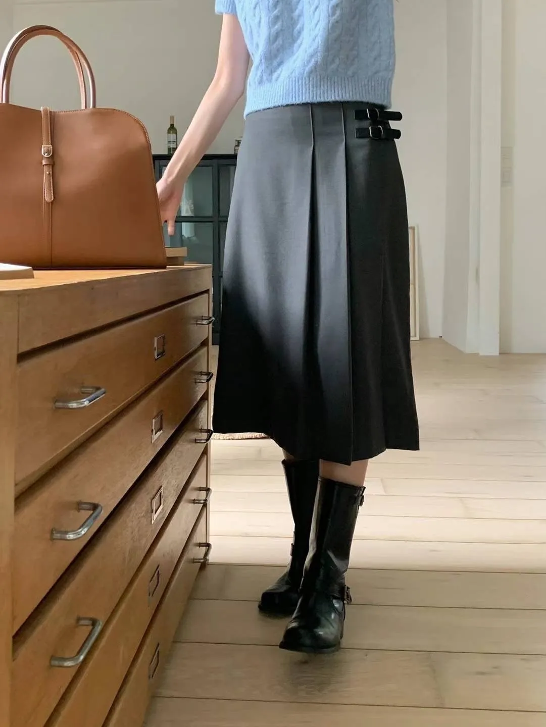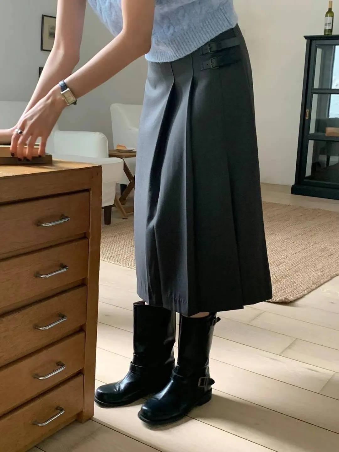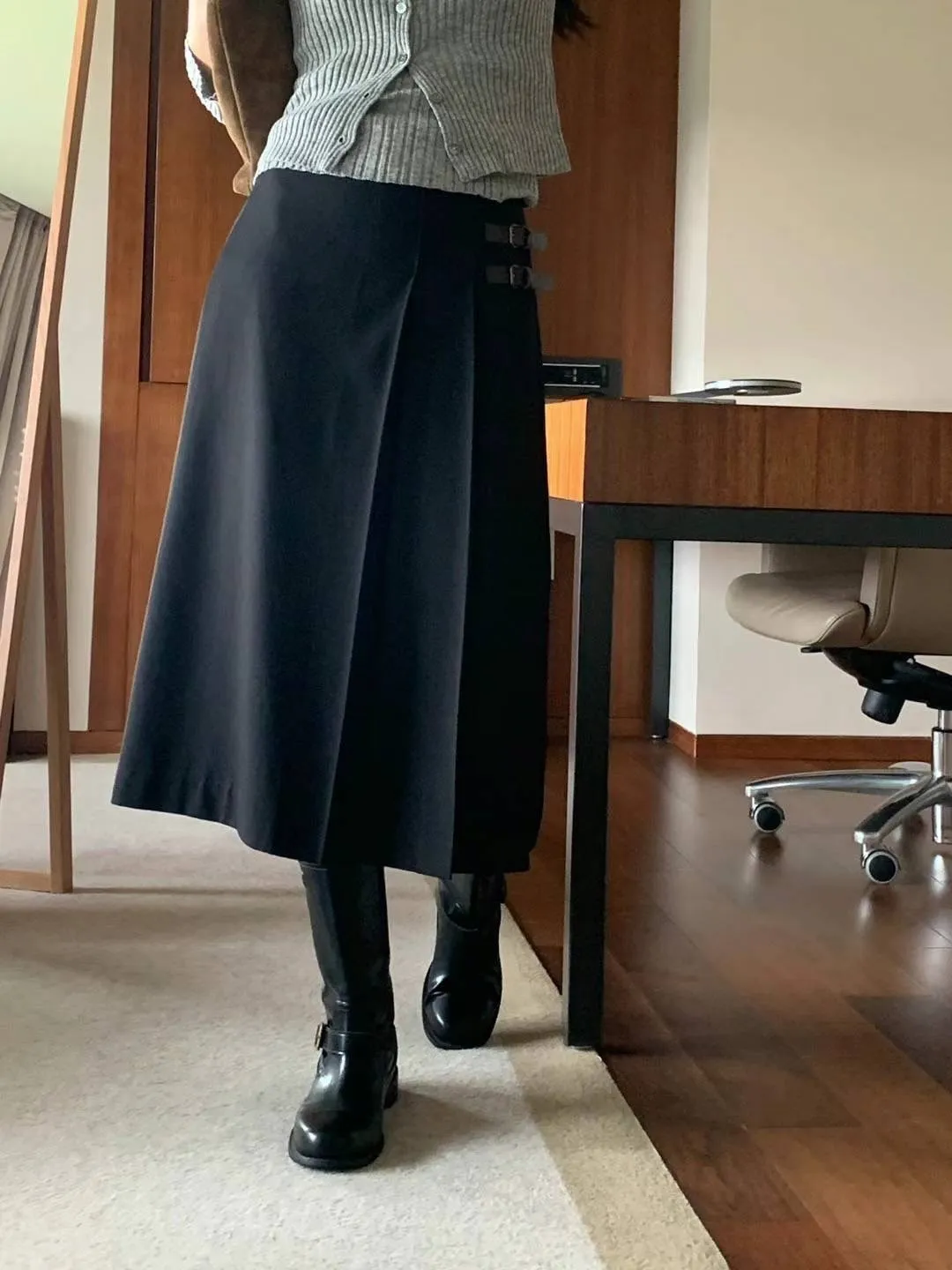 西裝面料 後拉鍊穿脫 單側百摺設計 皮革不可拆 無口袋有內理 夏天可