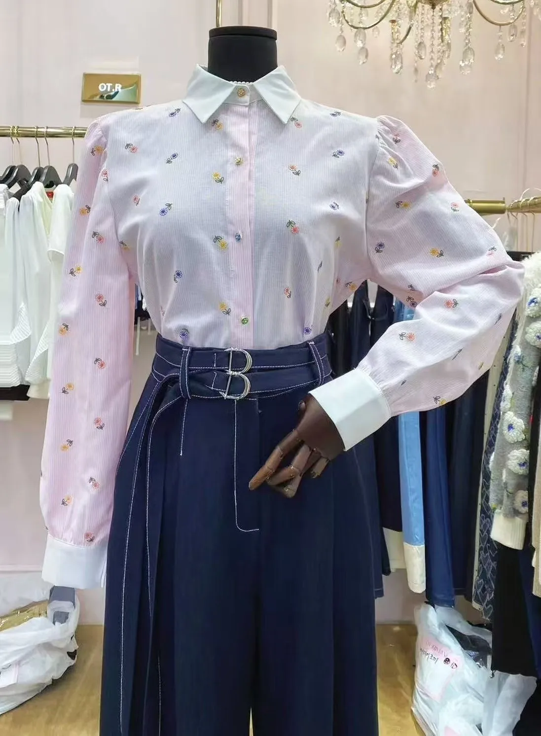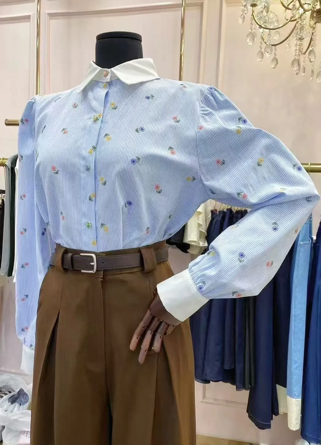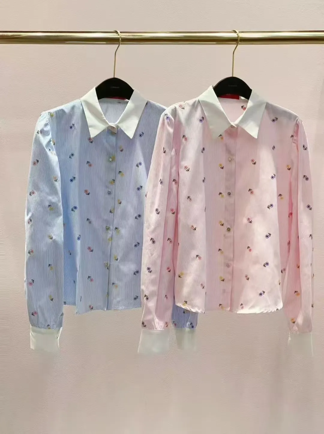 BY149細條紋小花刺繡襯衫 粉 藍 官網價$1080 線上價$1050