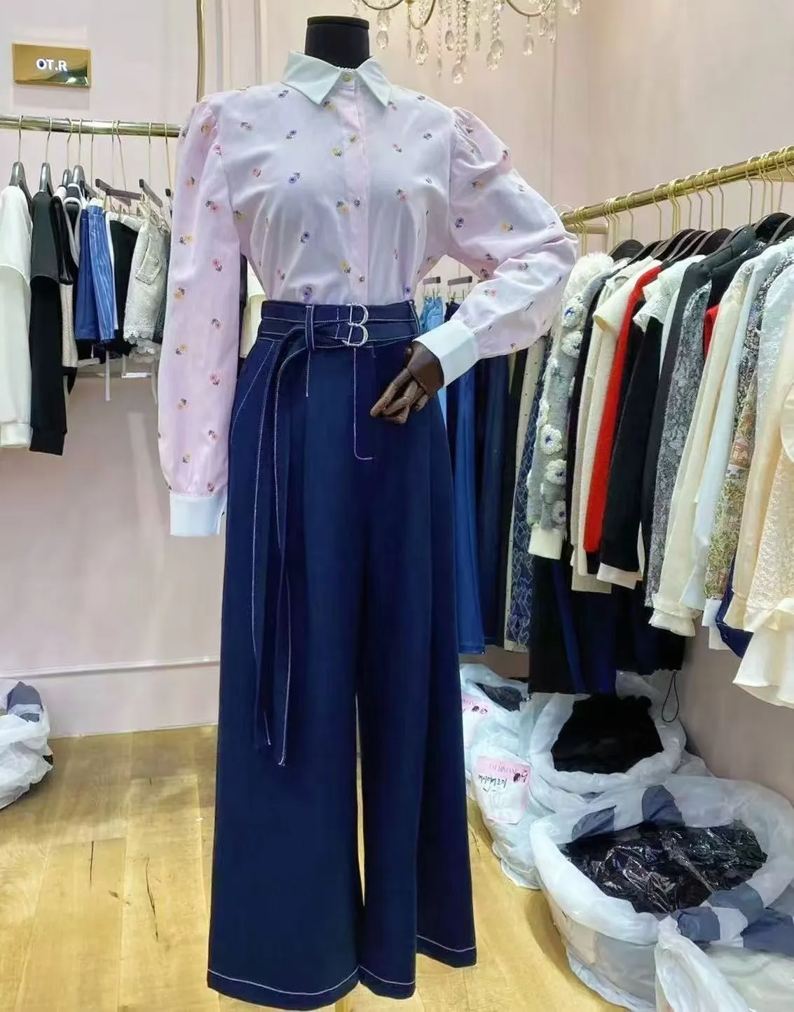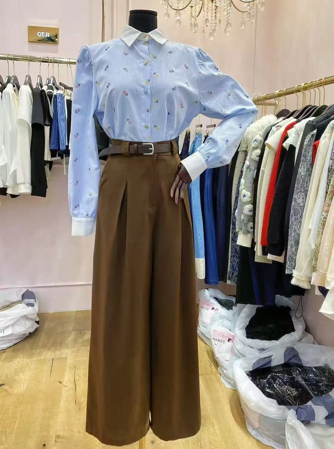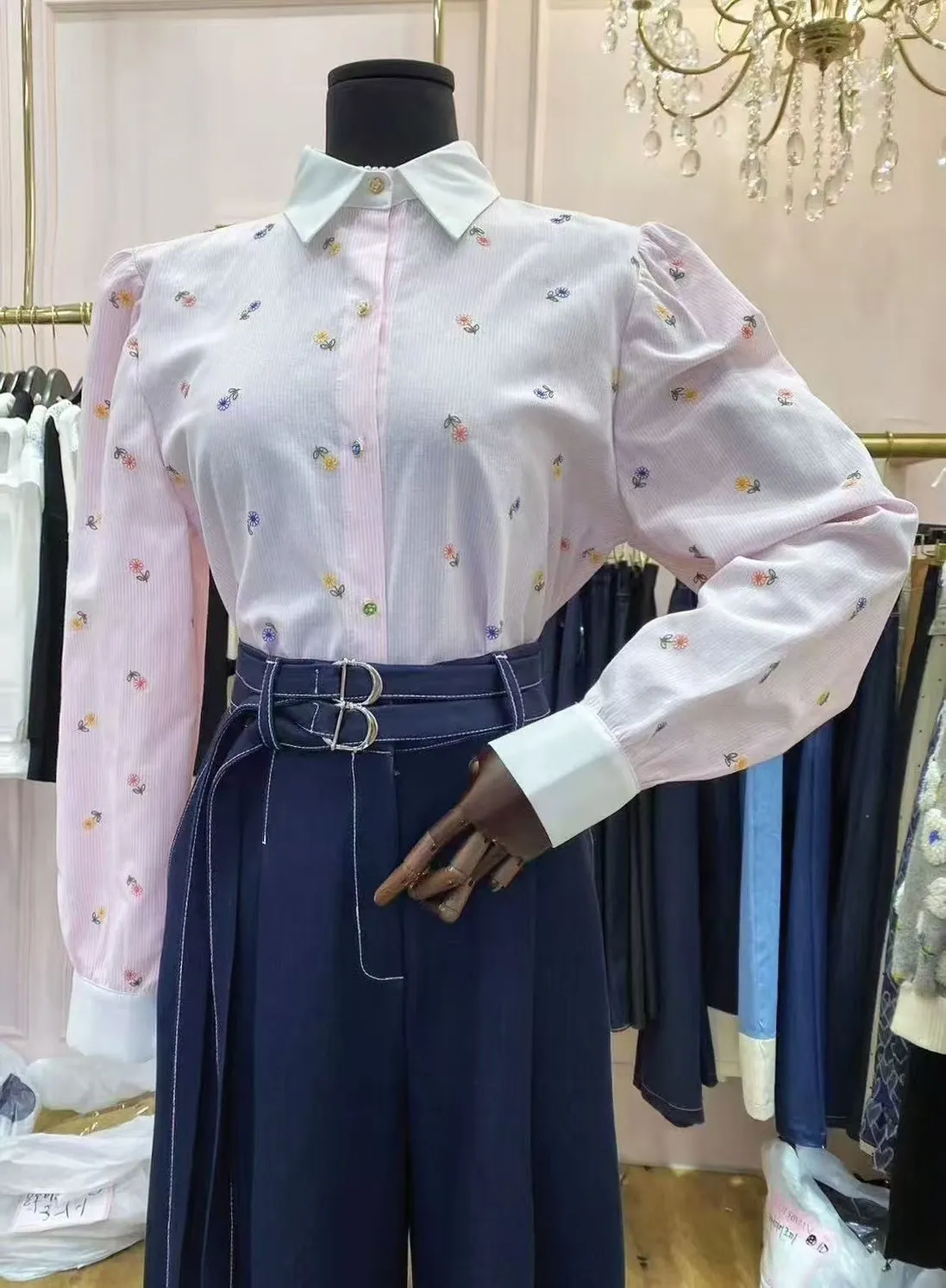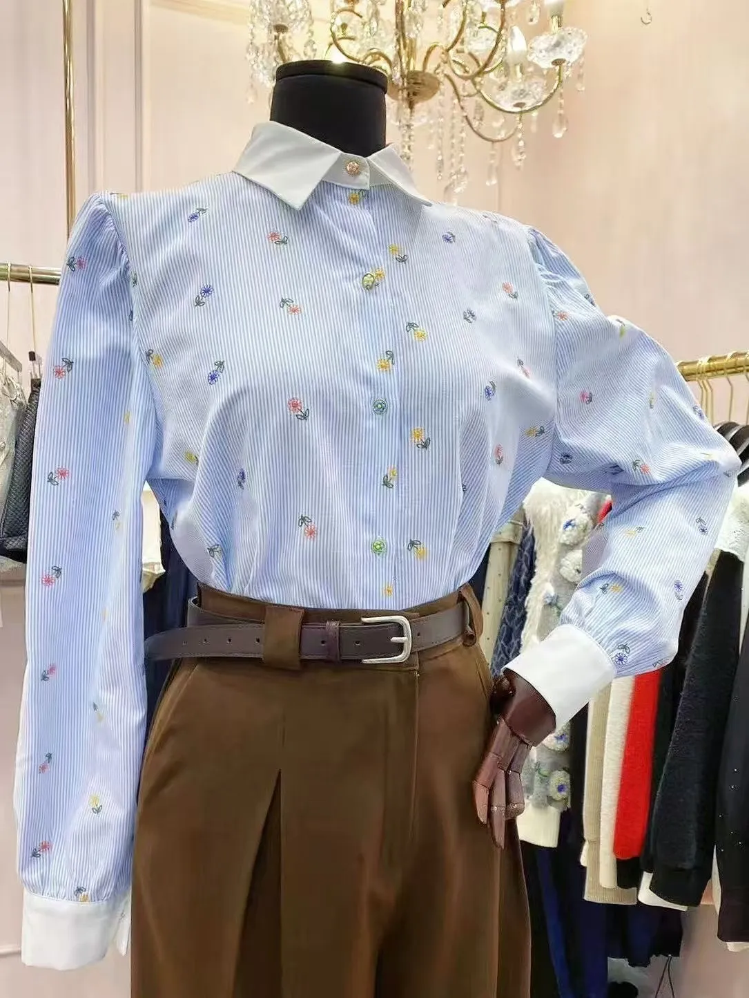 BY149細條紋小花刺繡襯衫 粉 藍 官網價$1080 線上價$1050