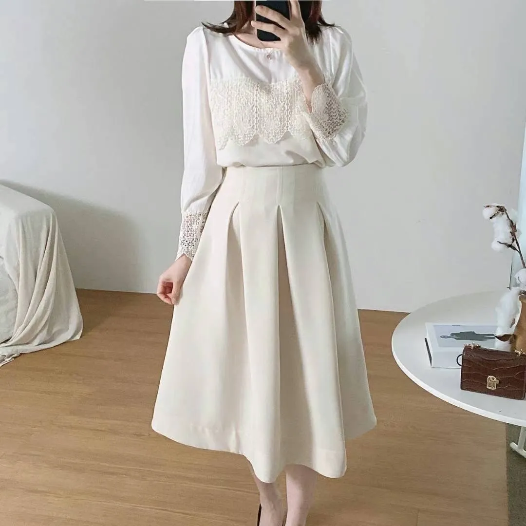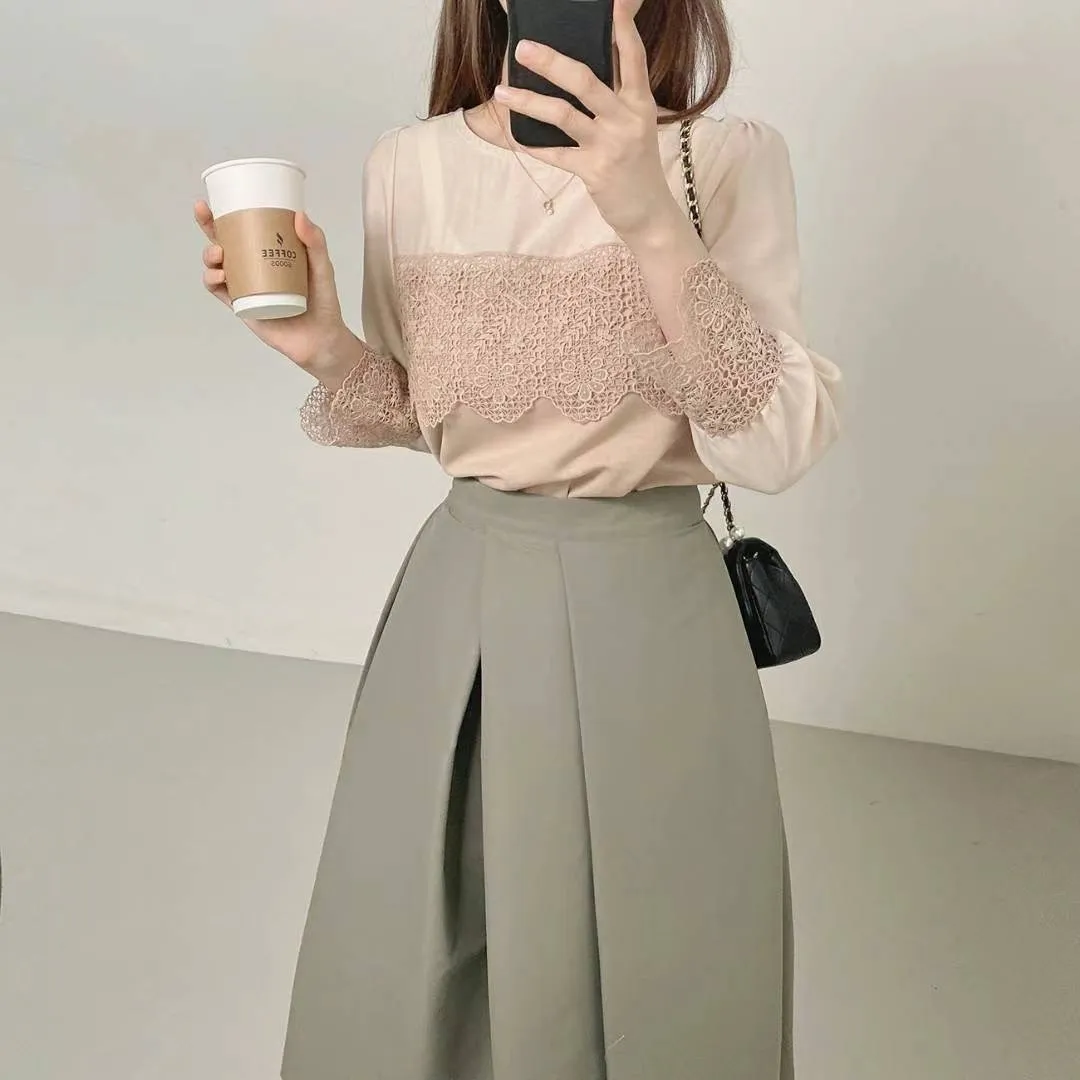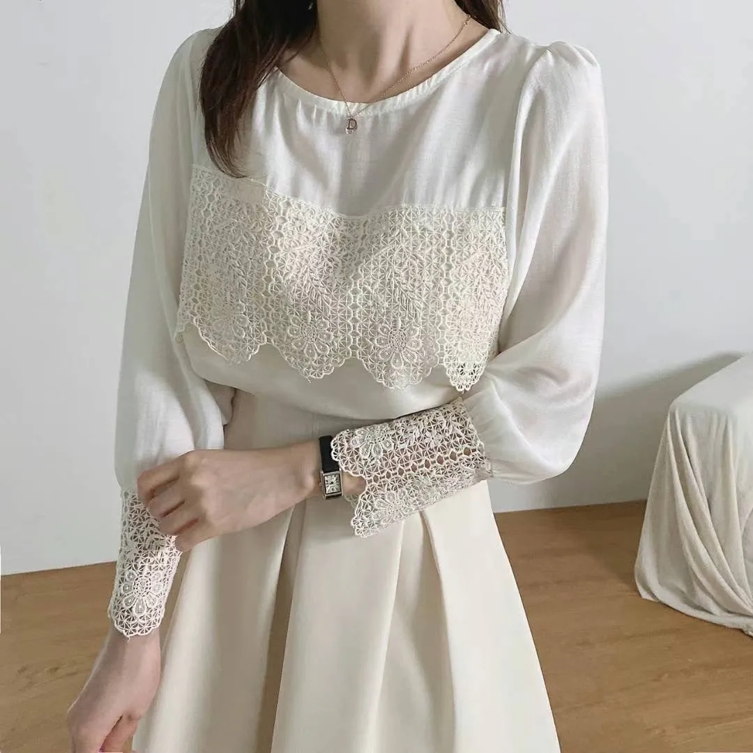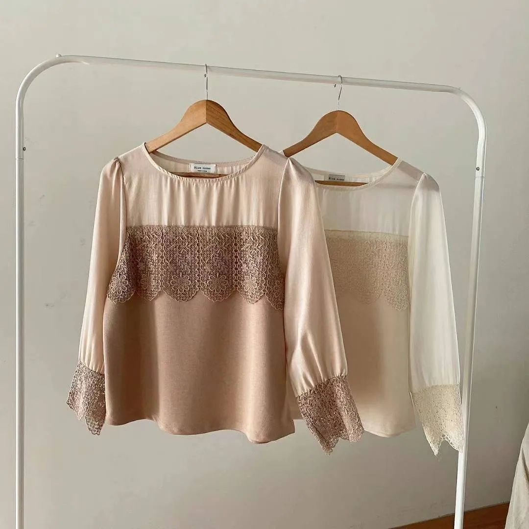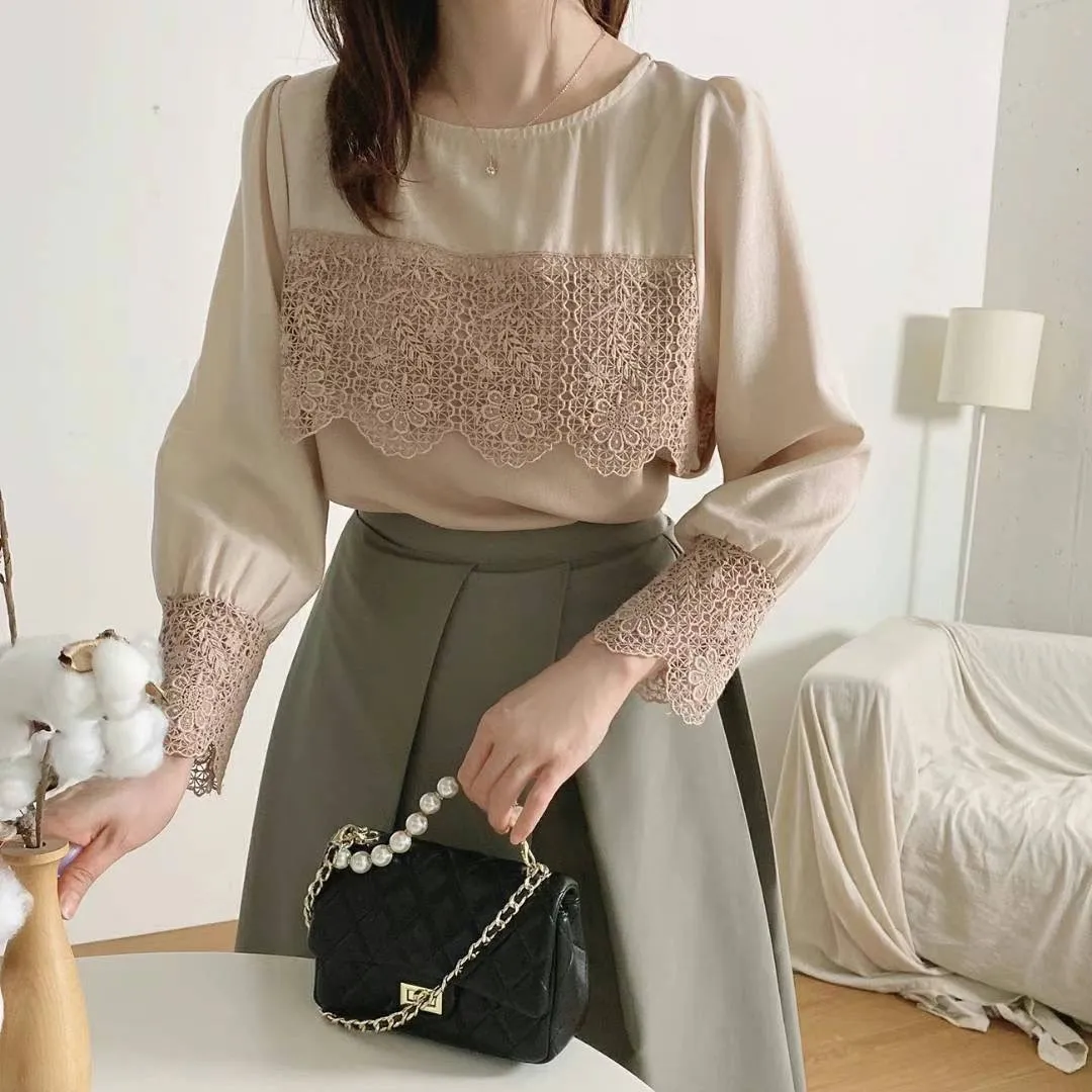 BY446優雅拼接蕾絲雪紡上衣 米 奶茶 官網價$910 線上價$880